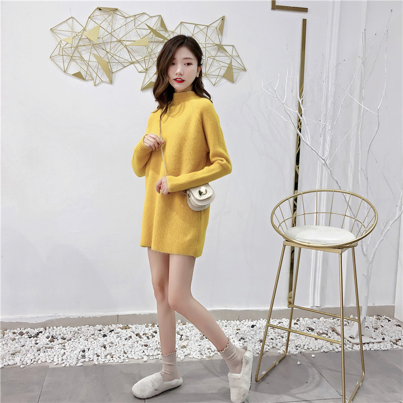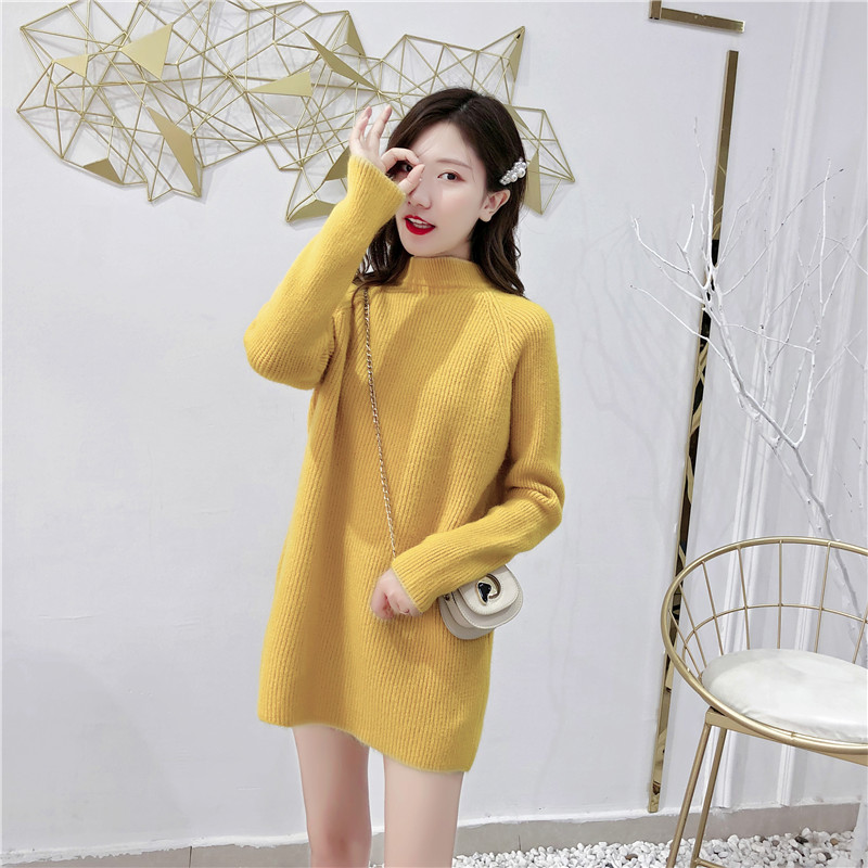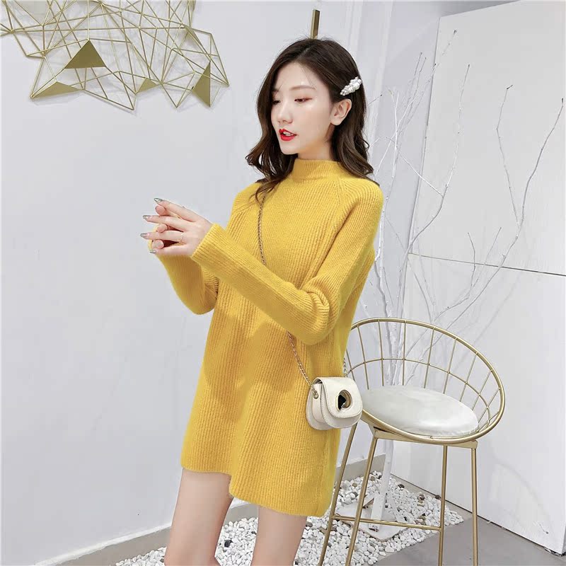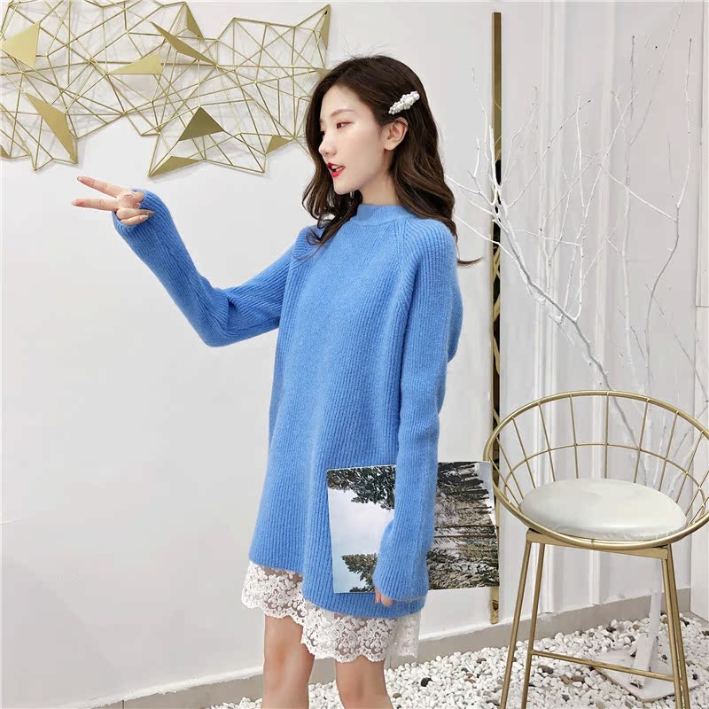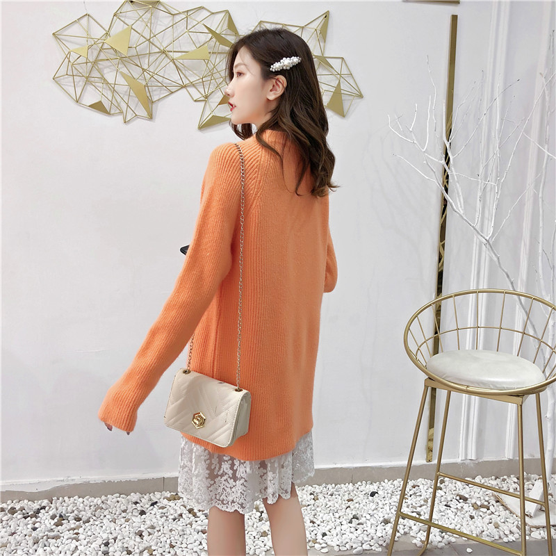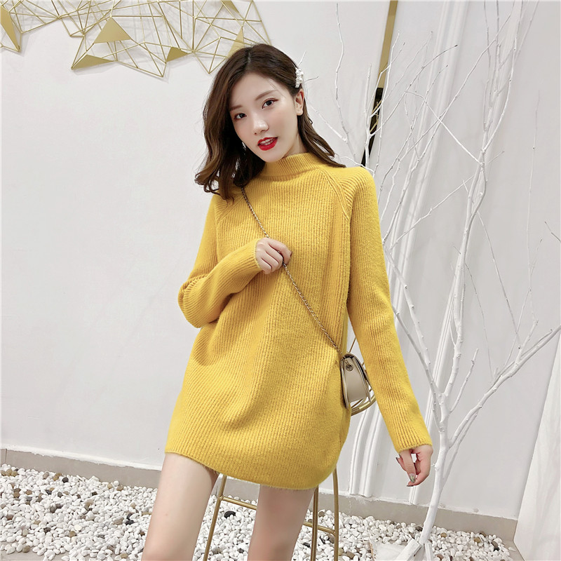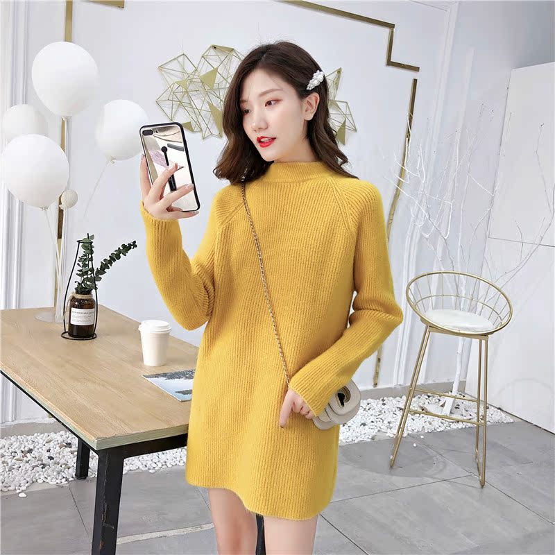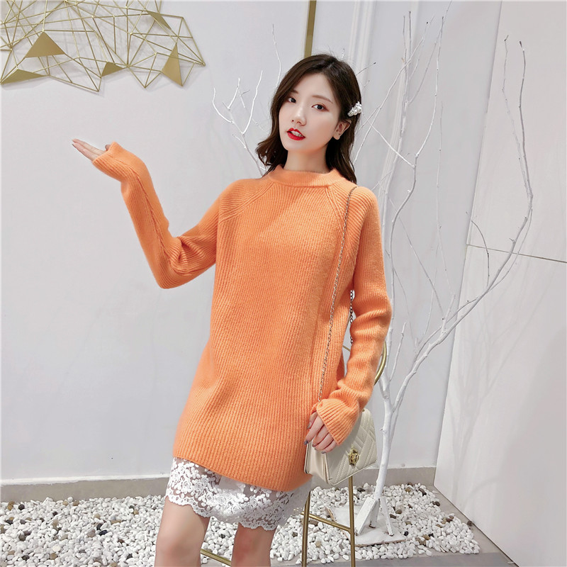2019秋冬季新款女裝慵懶風寬松套頭毛衣中長款外穿針織打底衫上衣1入