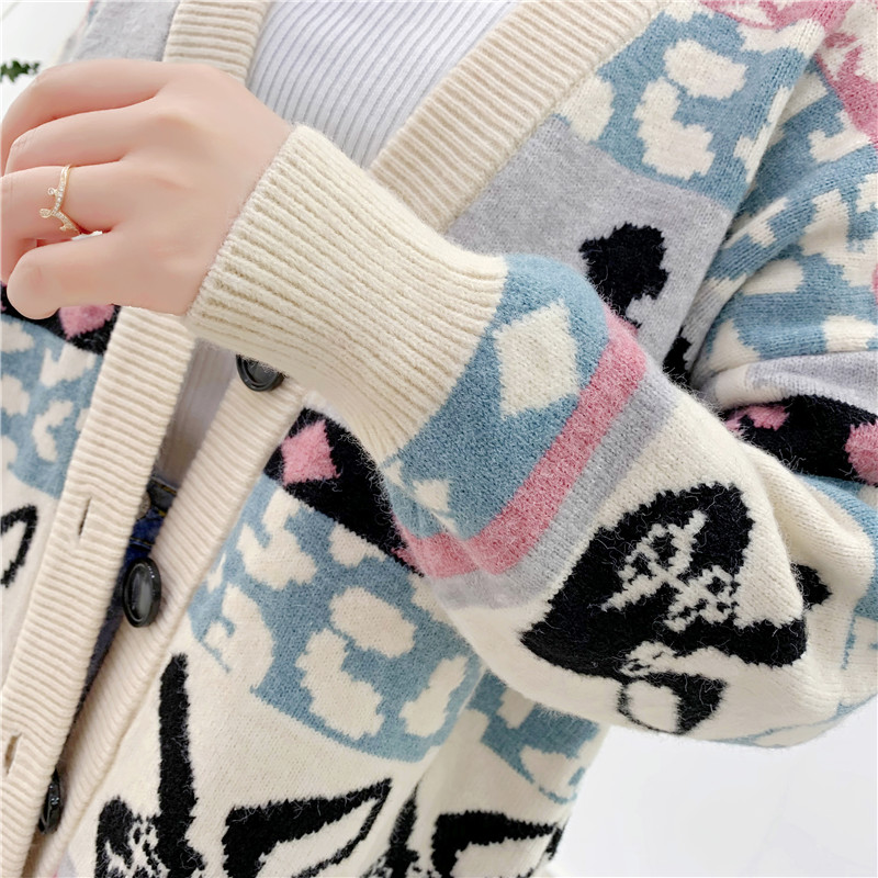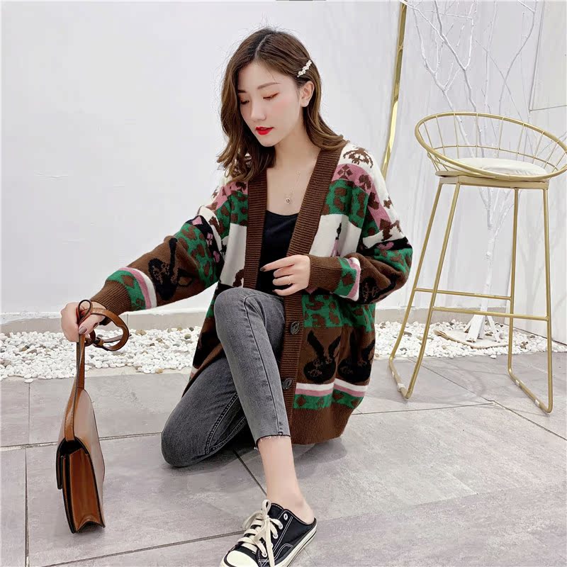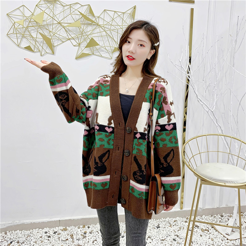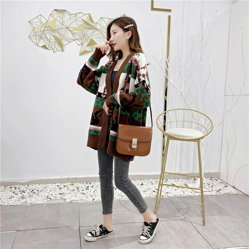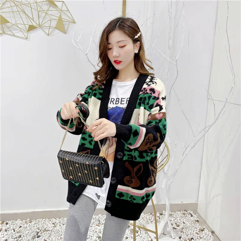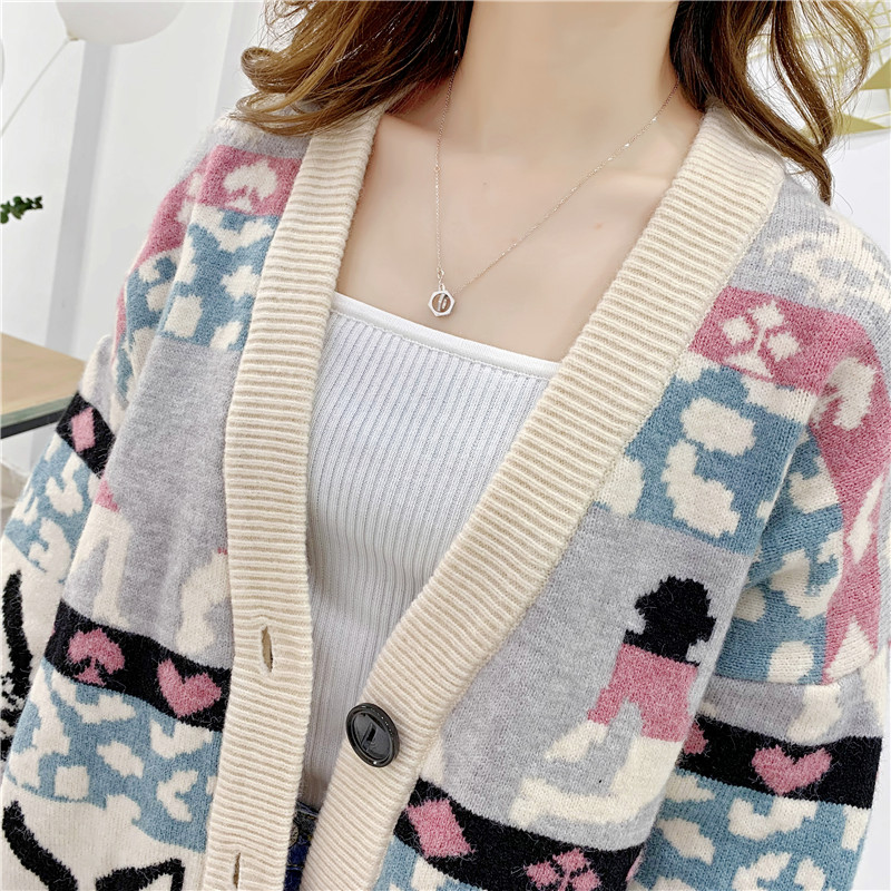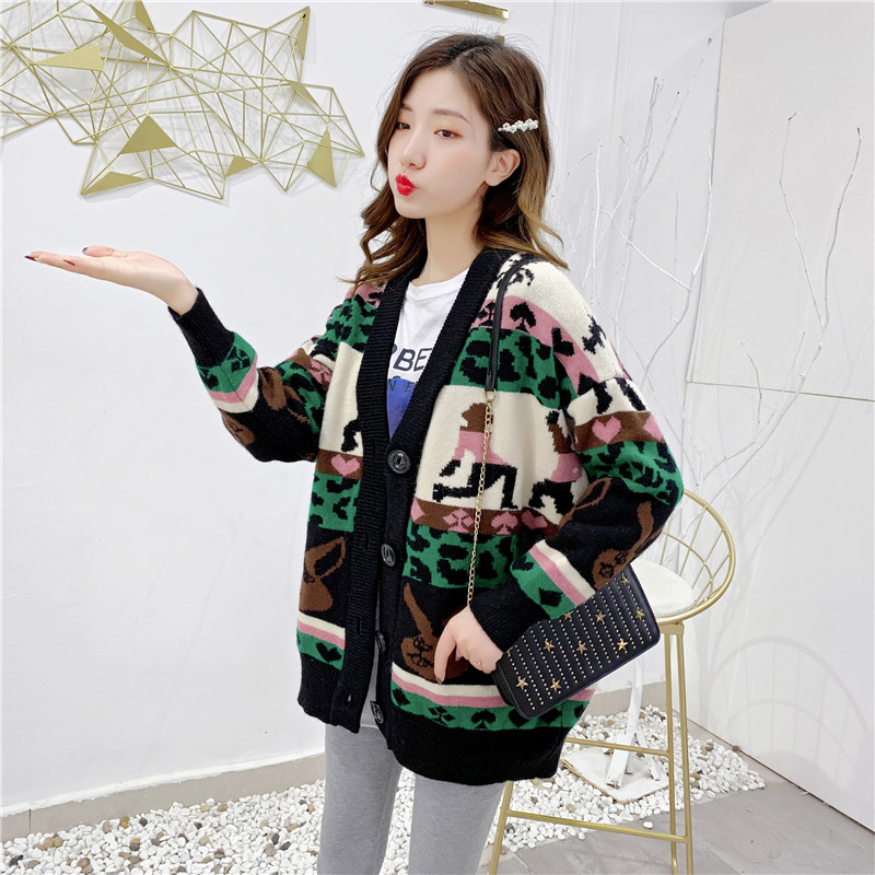 2019秋冬新款女寬松毛衣外套撞色拼色提花學生慵懶風針織開衫上衣1入