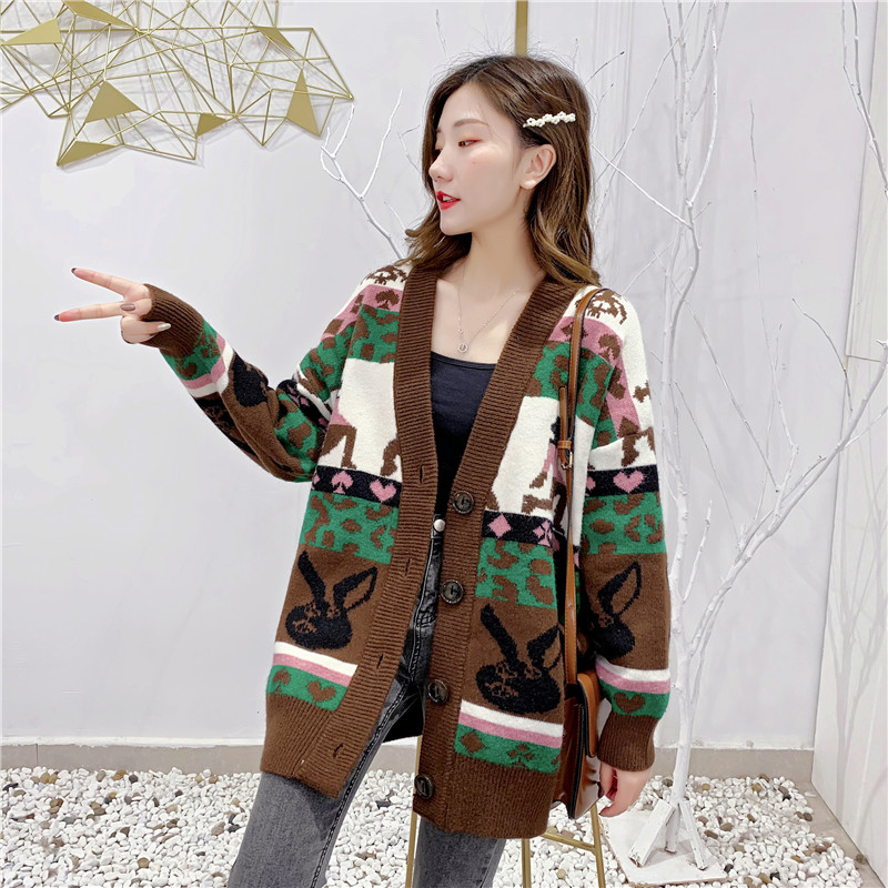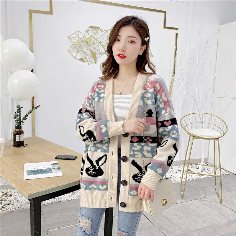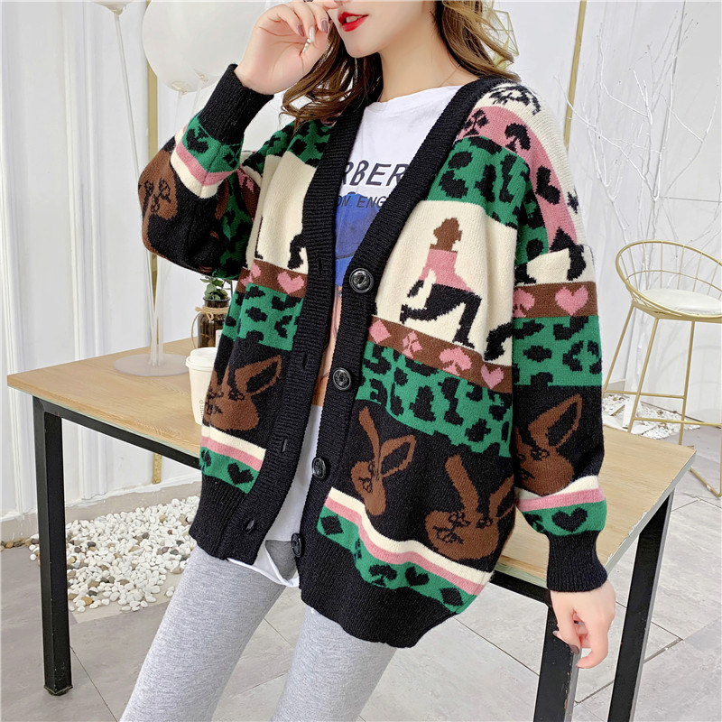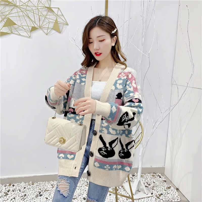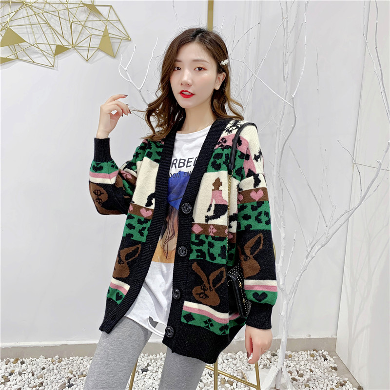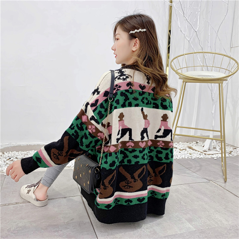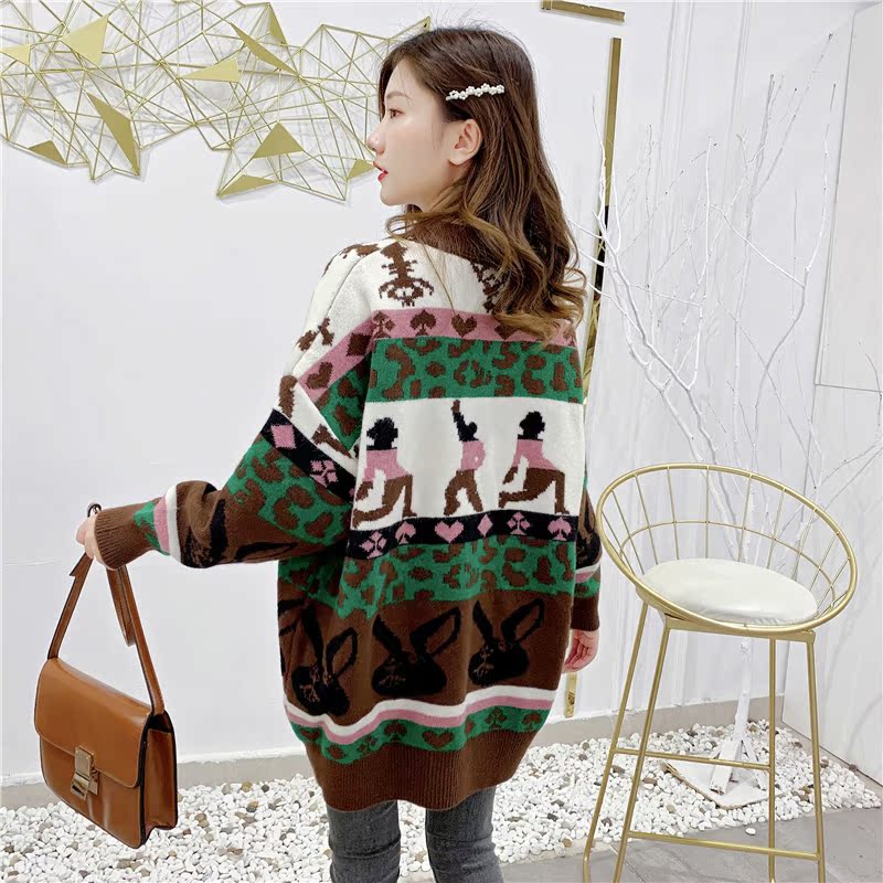 2019秋冬新款女寬松毛衣外套撞色拼色提花學生慵懶風針織開衫上衣1入