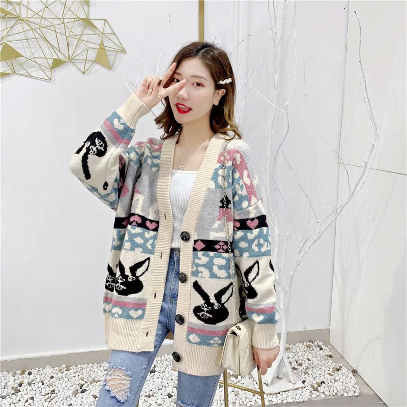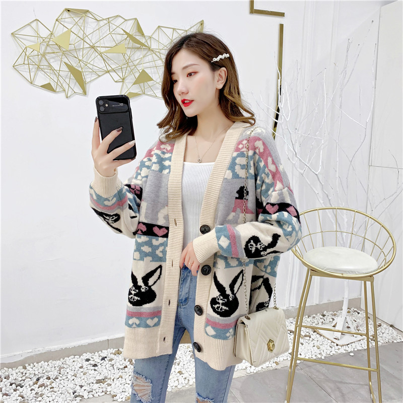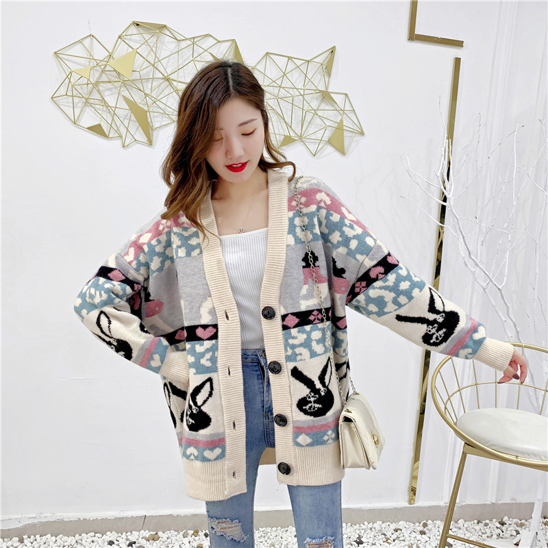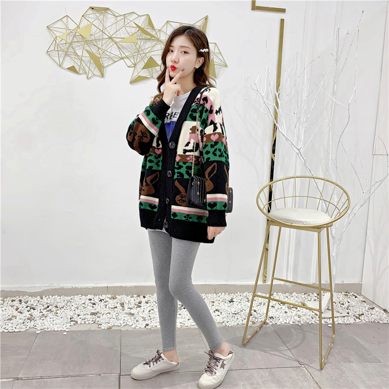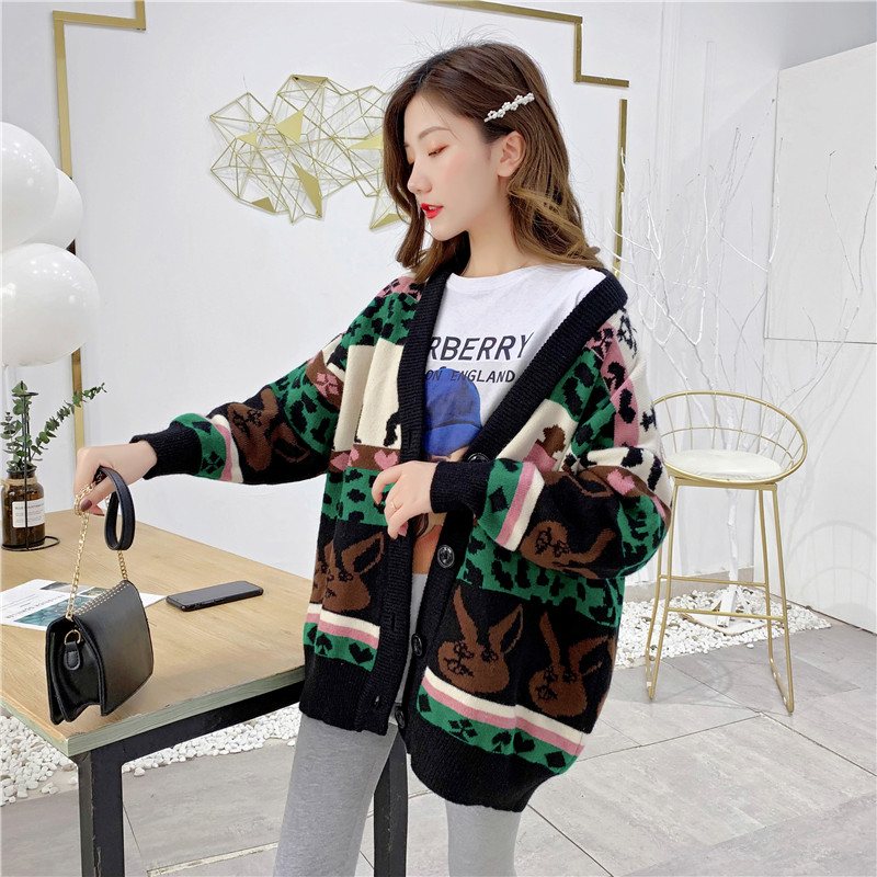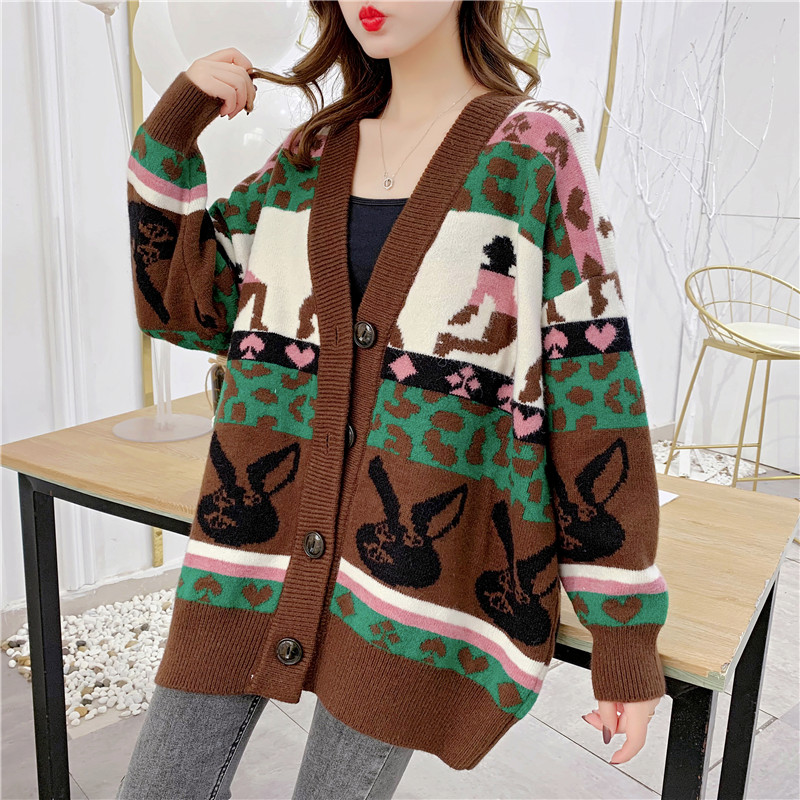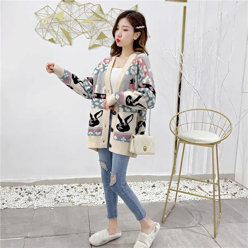 2019秋冬新款女寬松毛衣外套撞色拼色提花學生慵懶風針織開衫上衣1入