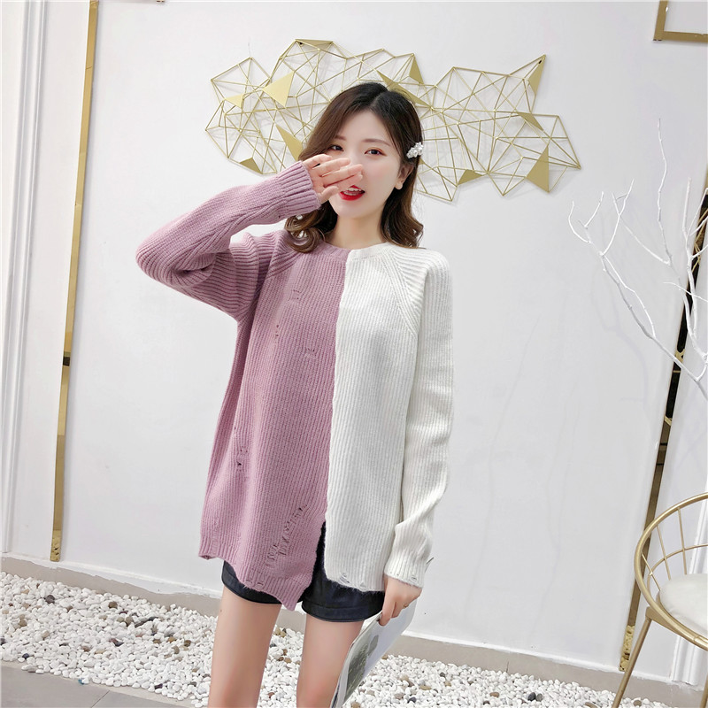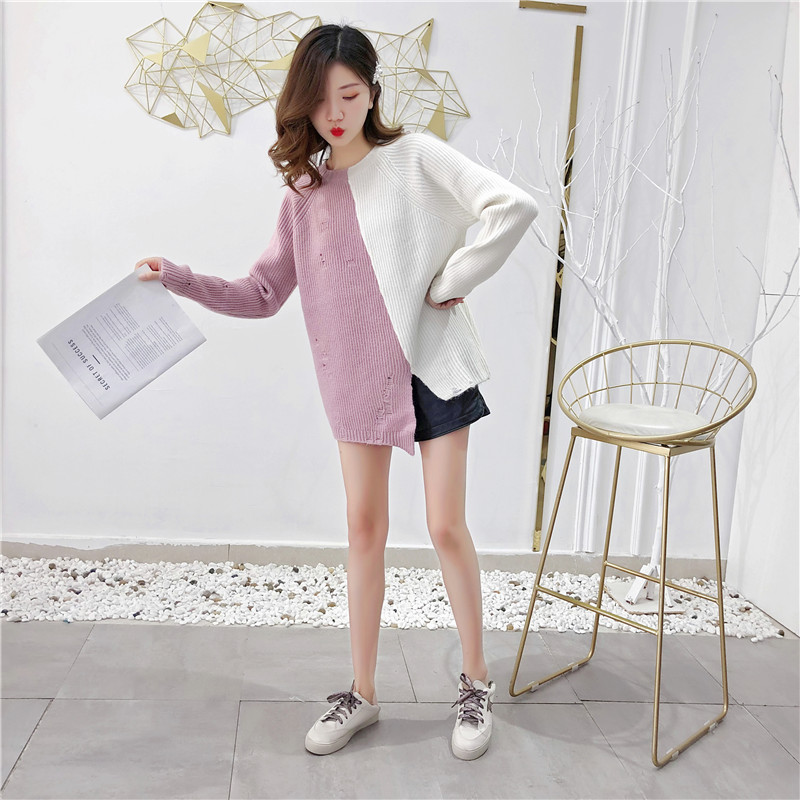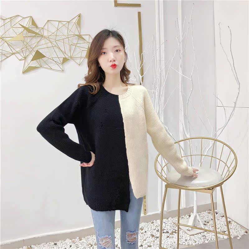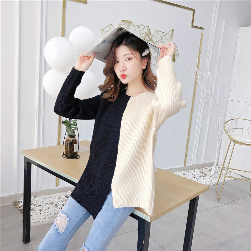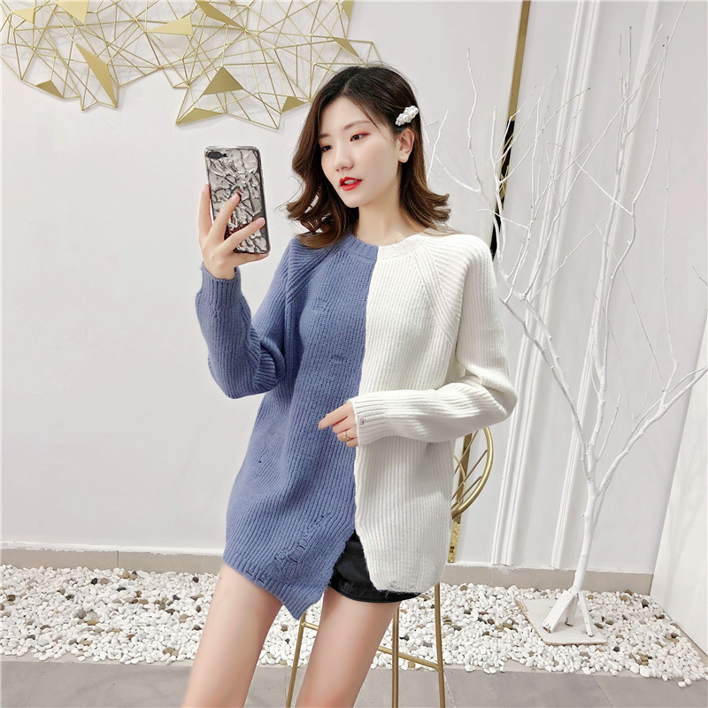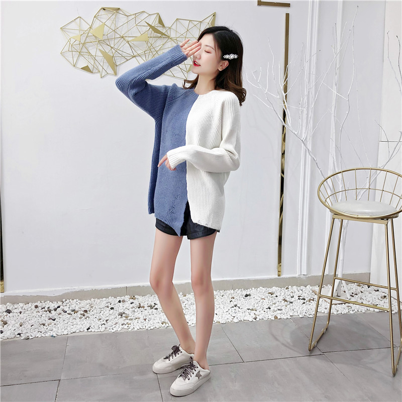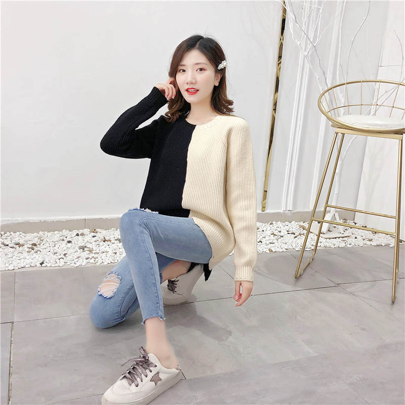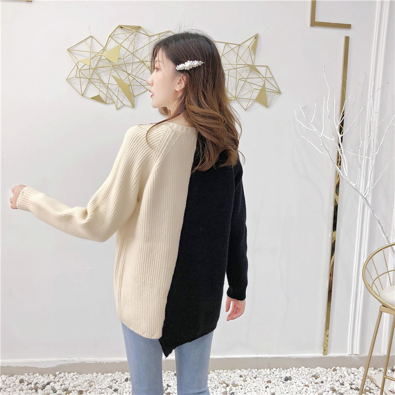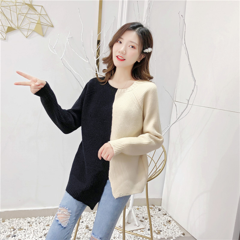 2019秋冬季新款女裝寬松撞色不規則套頭毛衣慵懶風針織打底衫上衣1入