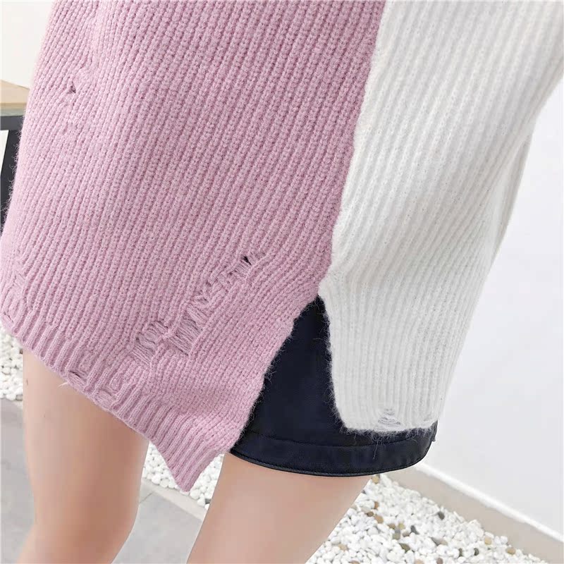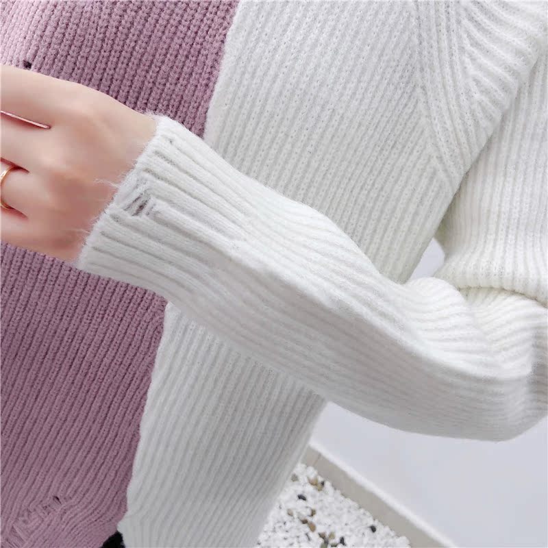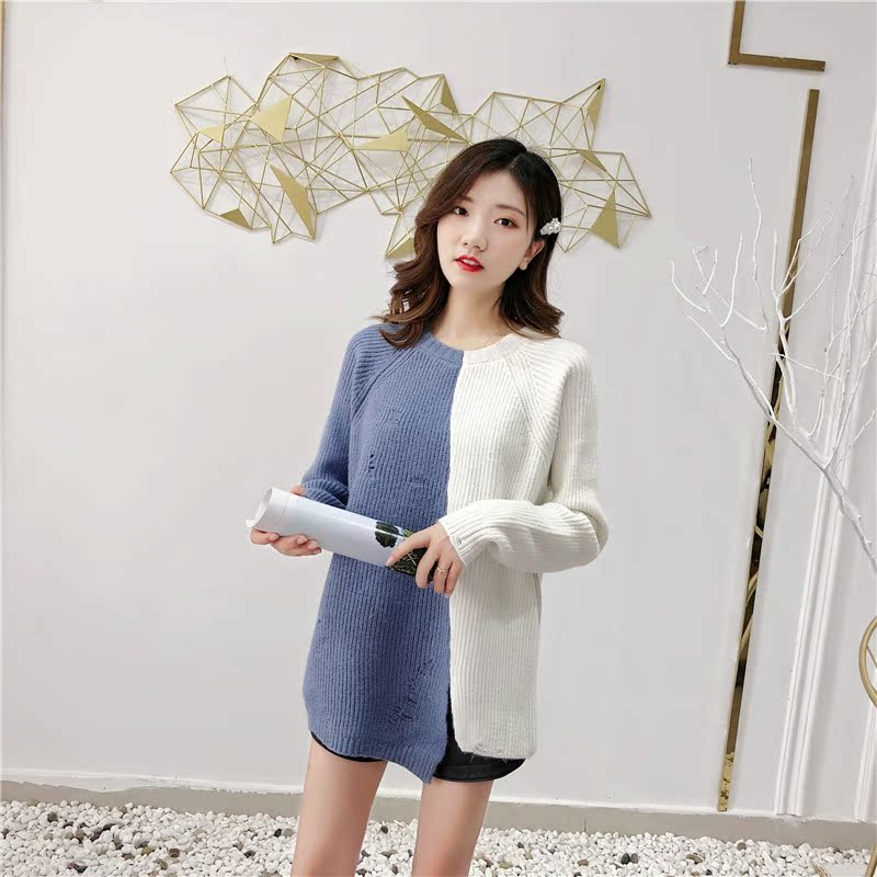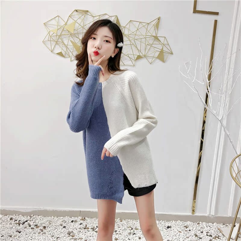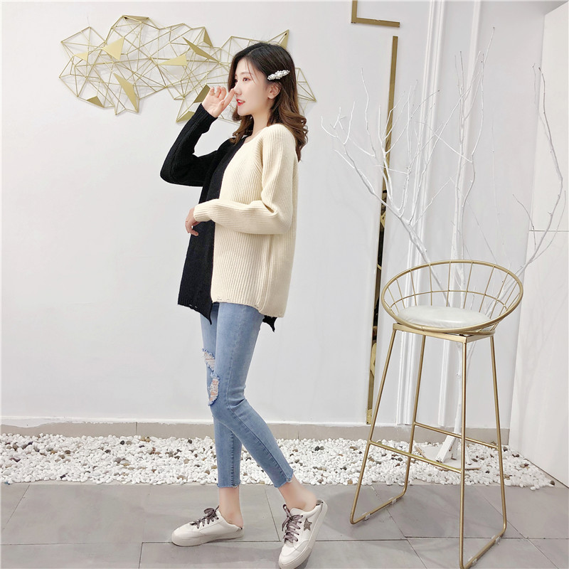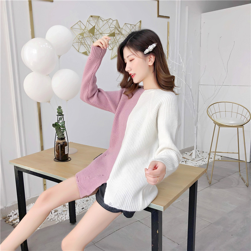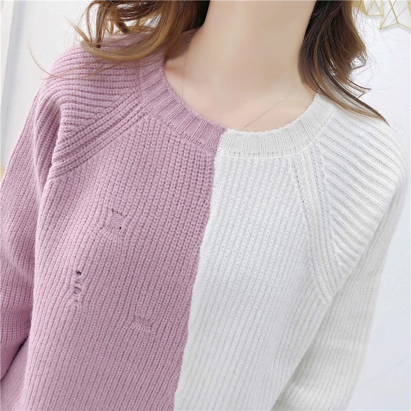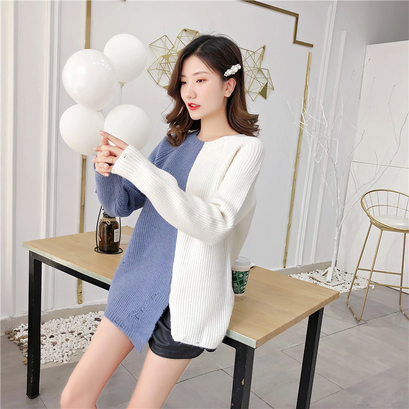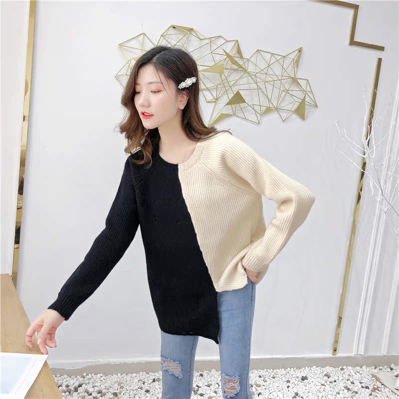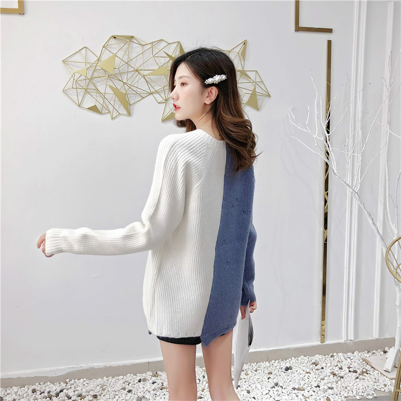 2019秋冬季新款女裝寬松撞色不規則套頭毛衣慵懶風針織打底衫上衣1入