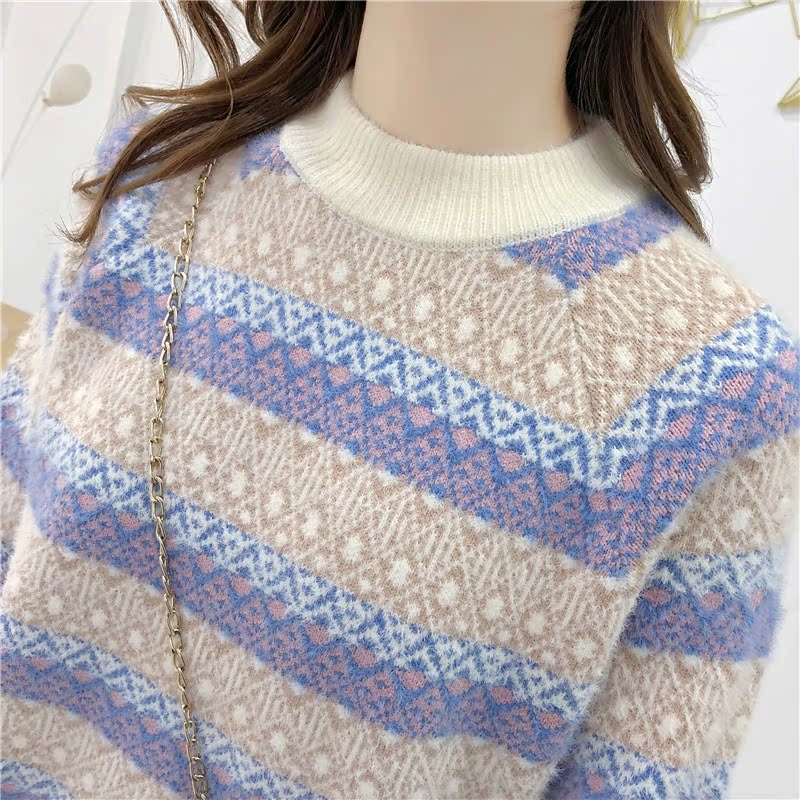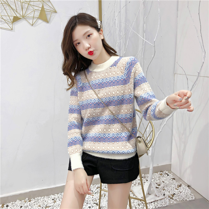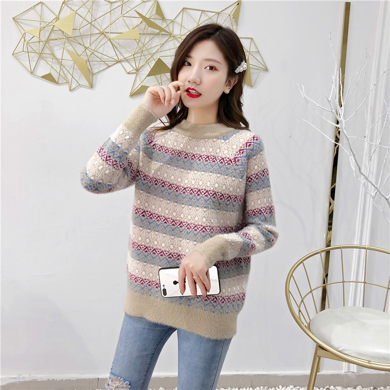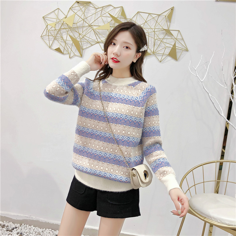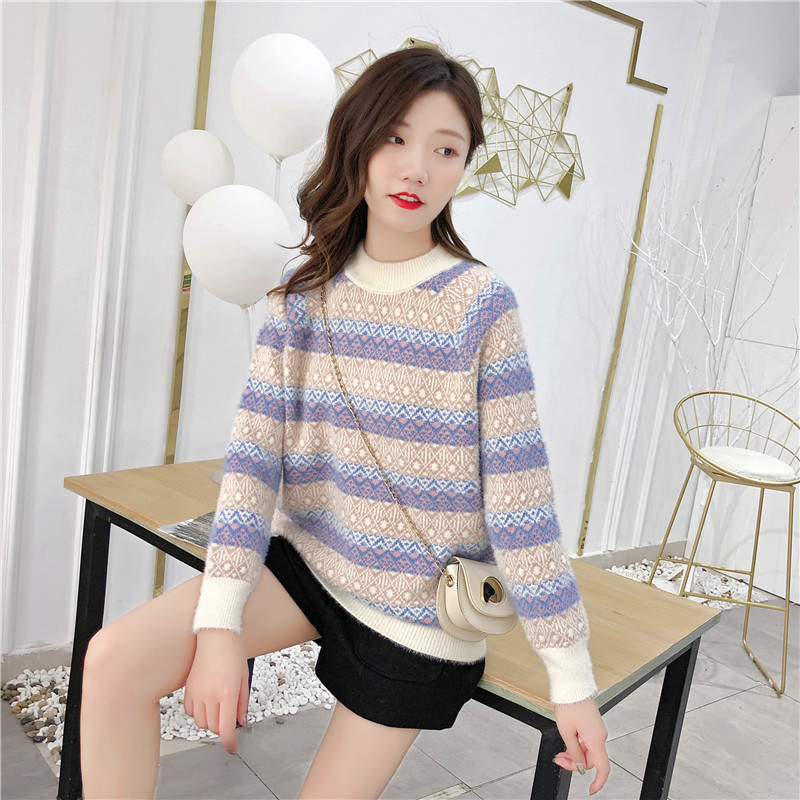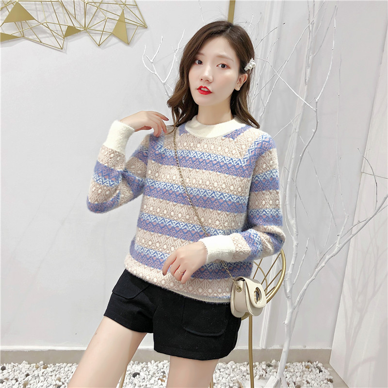 2019秋冬新款女寬松慵懶風套頭毛衣夾色撞色仿貂絨針織打底衫上衣1入