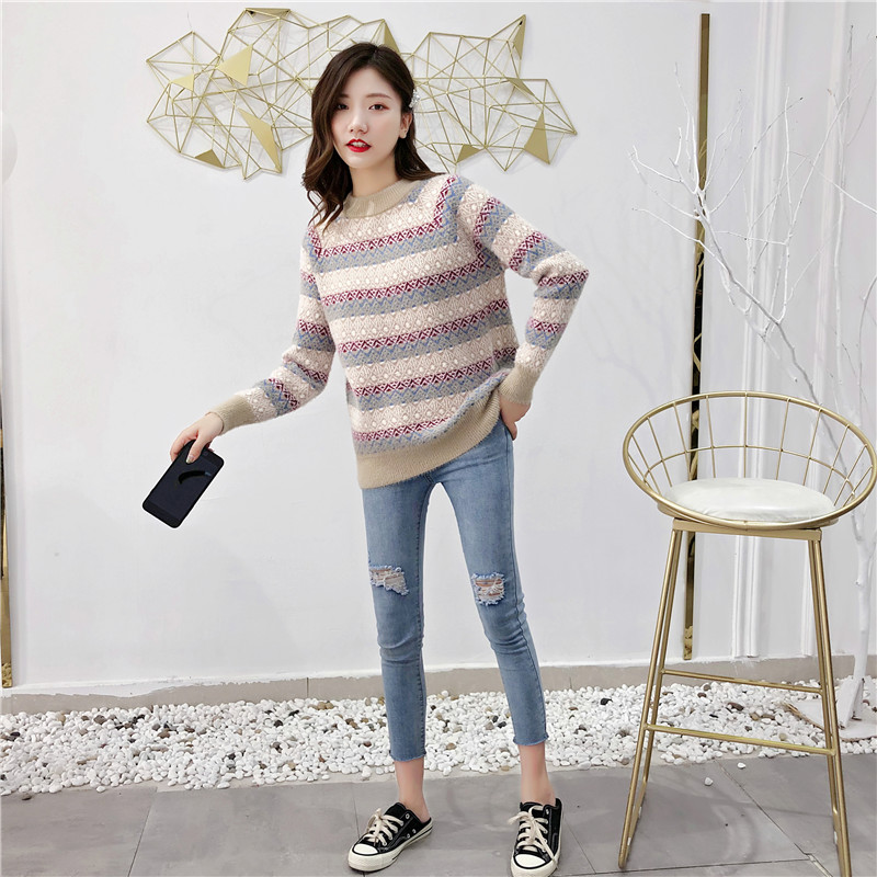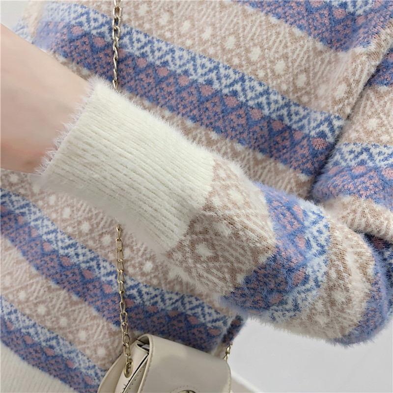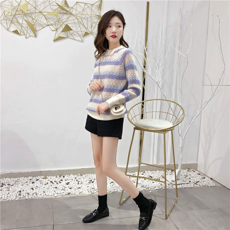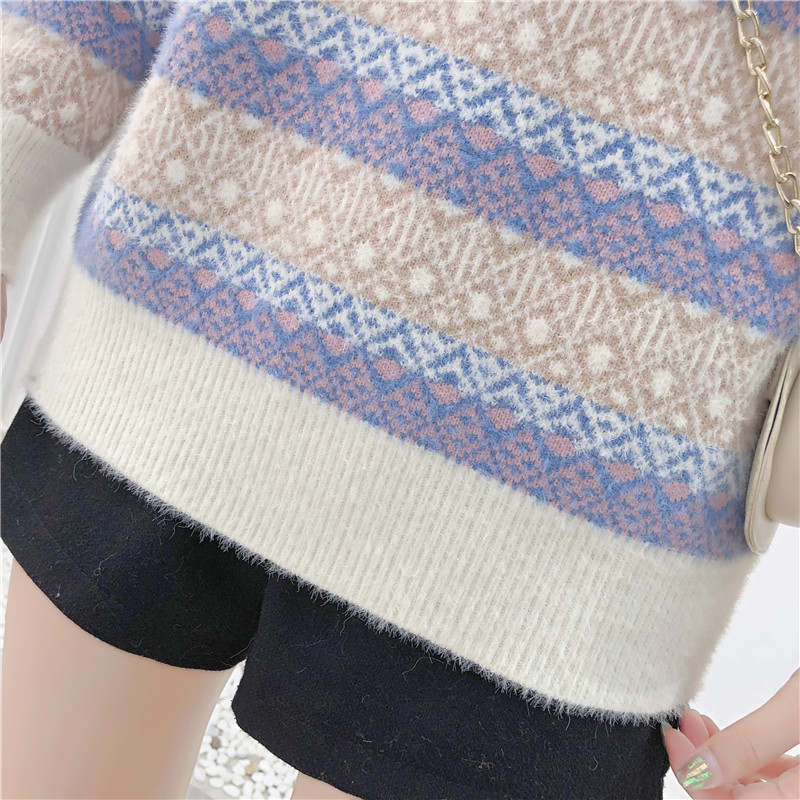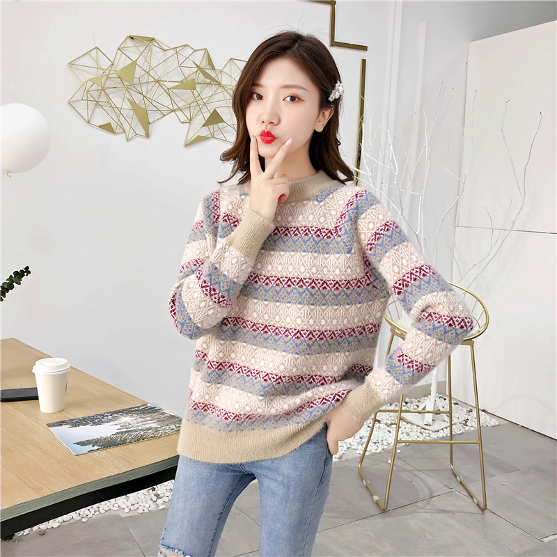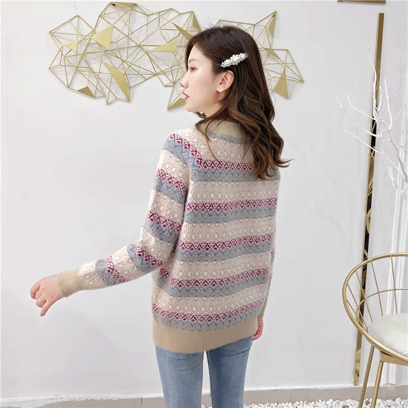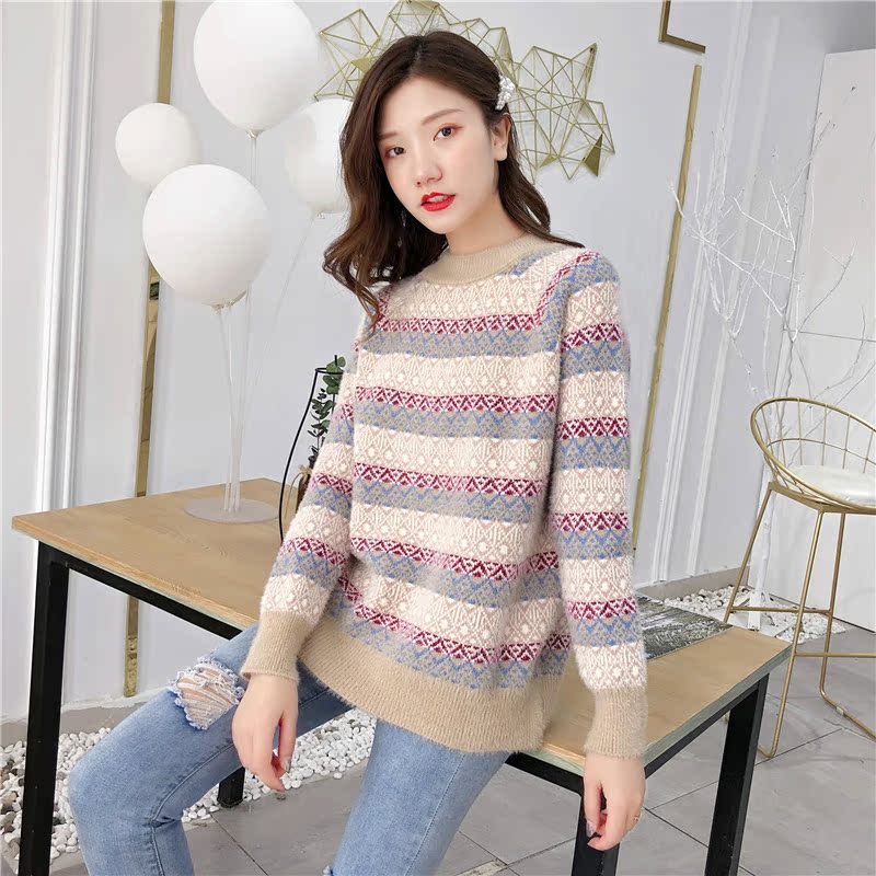 2019秋冬新款女寬松慵懶風套頭毛衣夾色撞色仿貂絨針織打底衫上衣1入