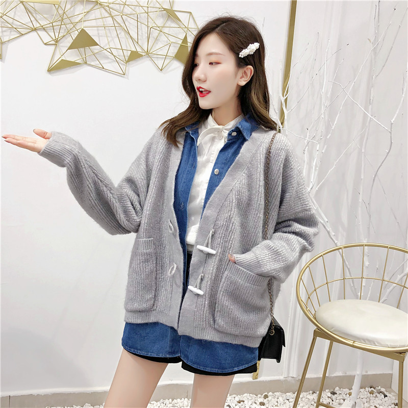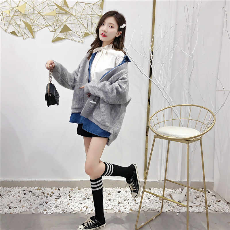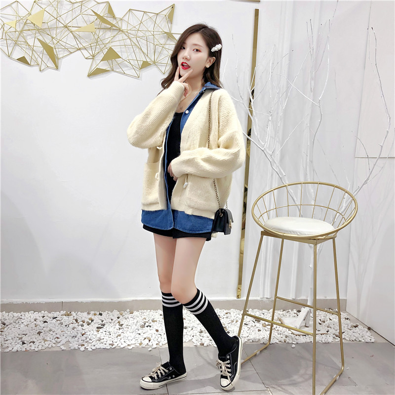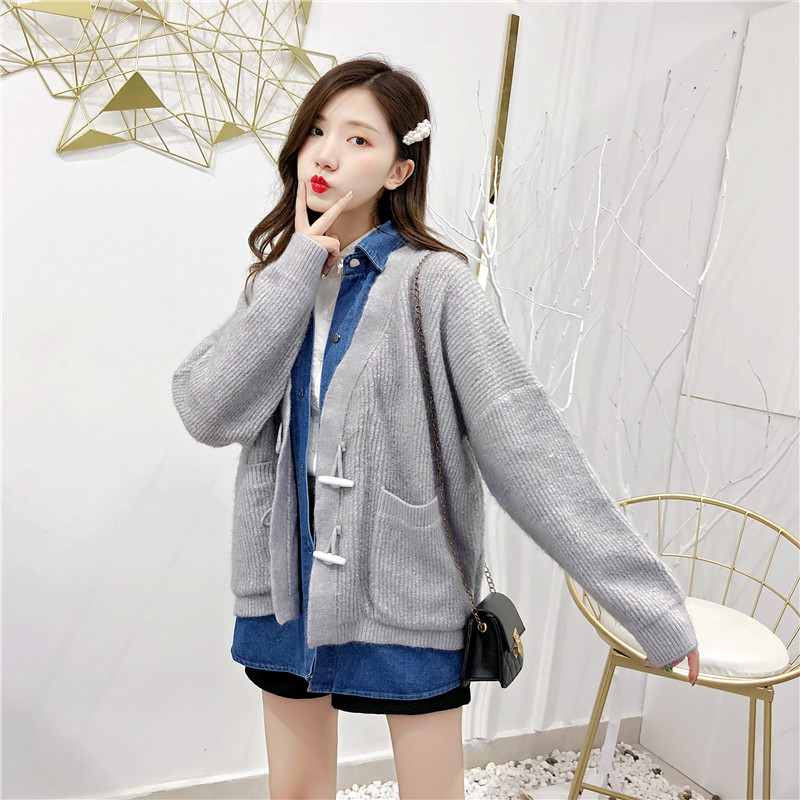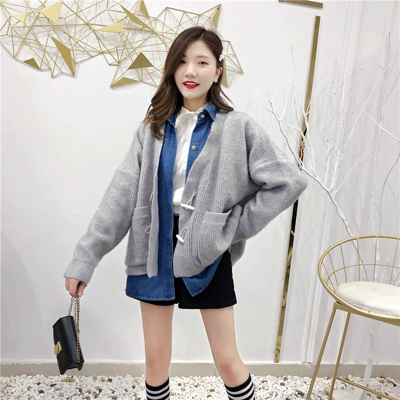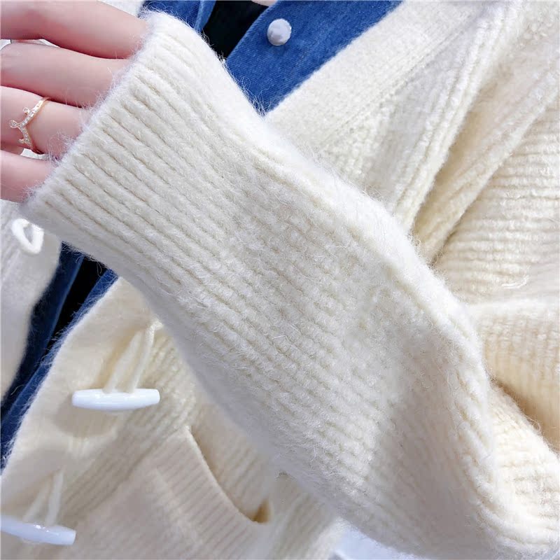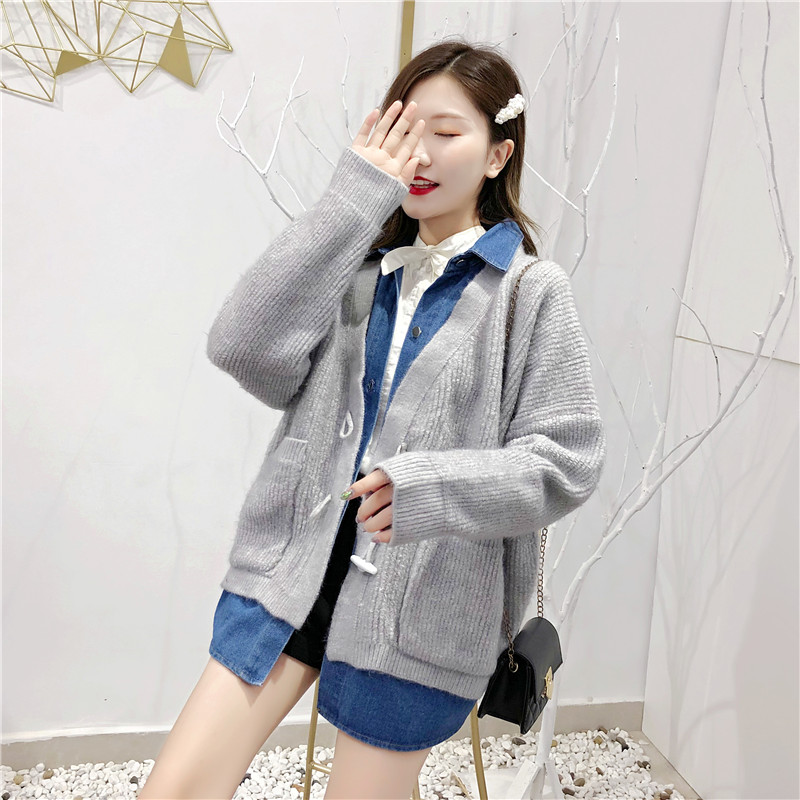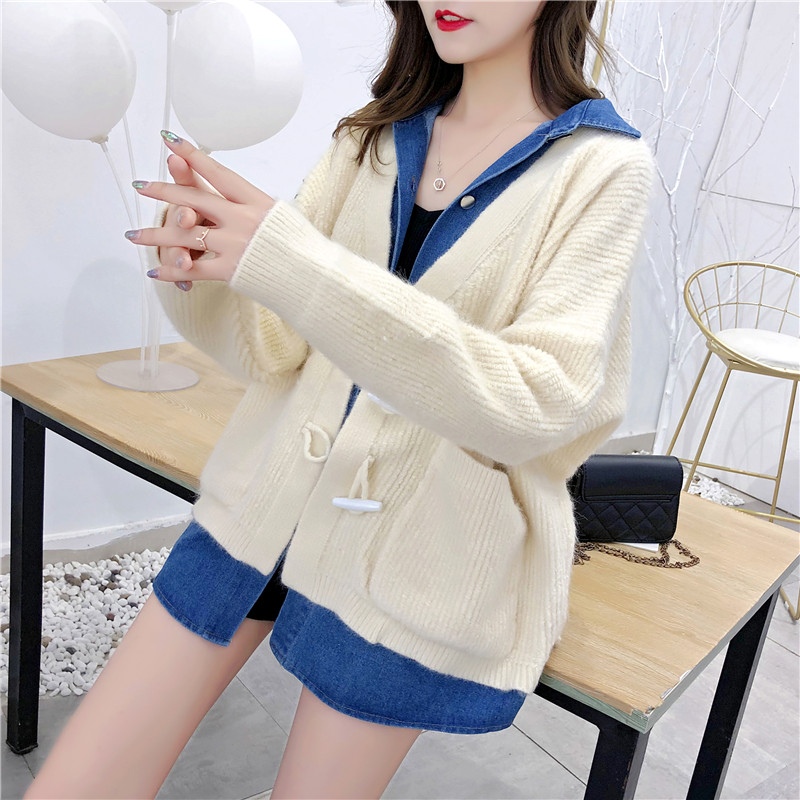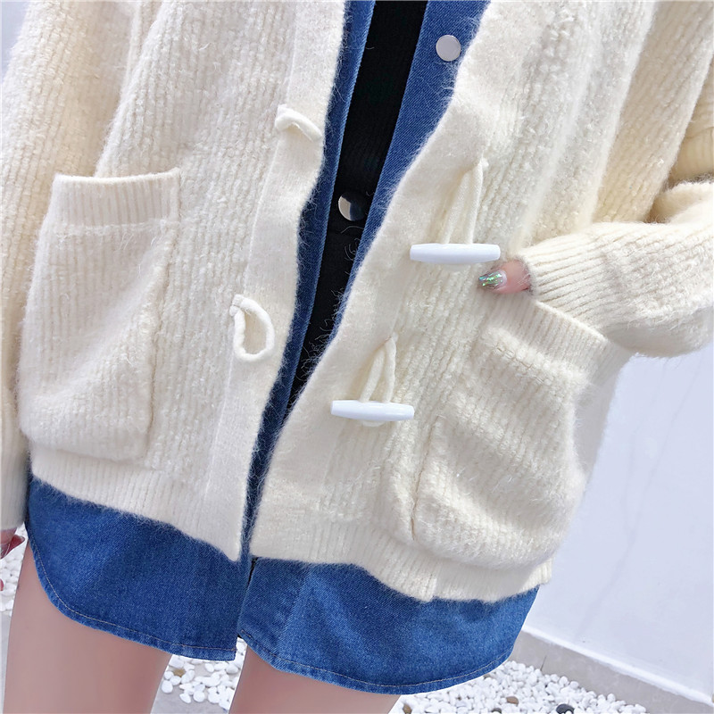 2019秋冬新款牛仔拼接假兩件女毛衣針織開衫慵懶牛角扣上衣短外套1入