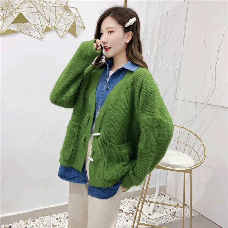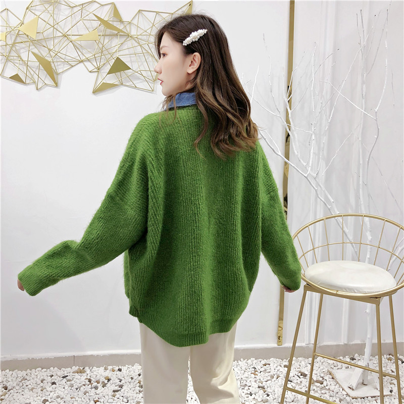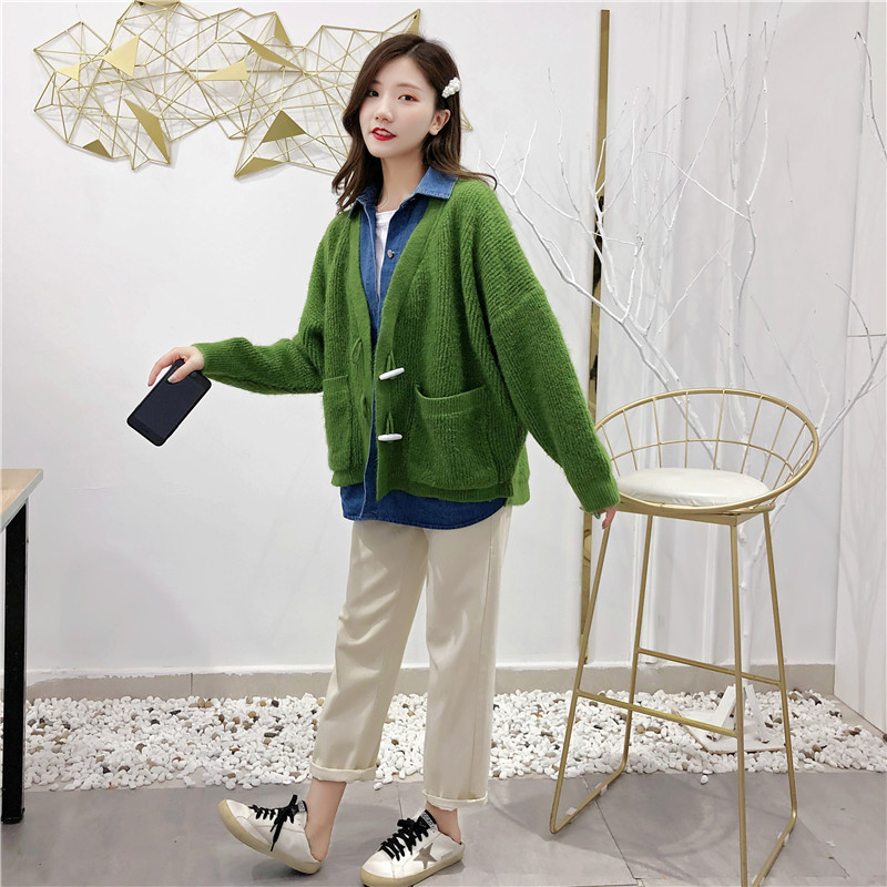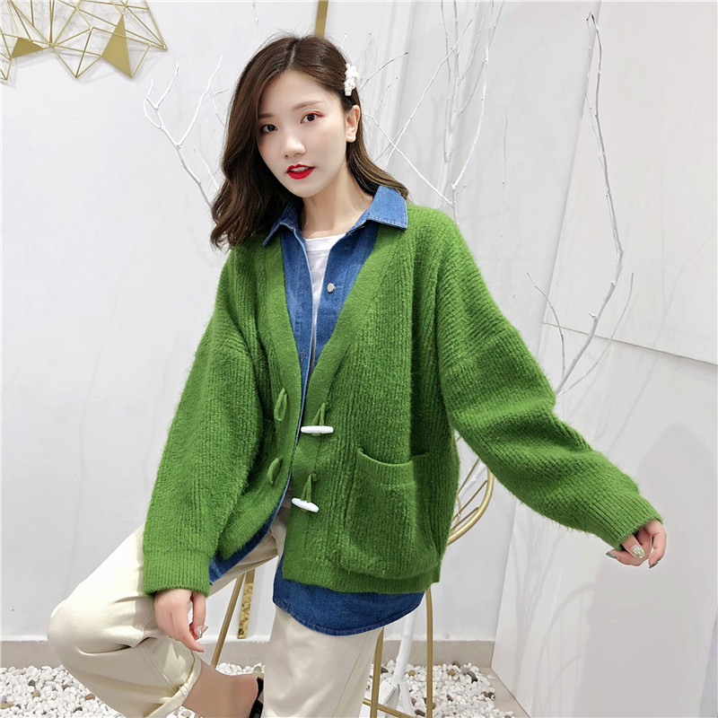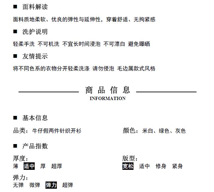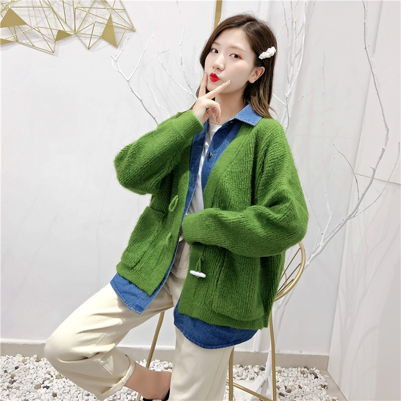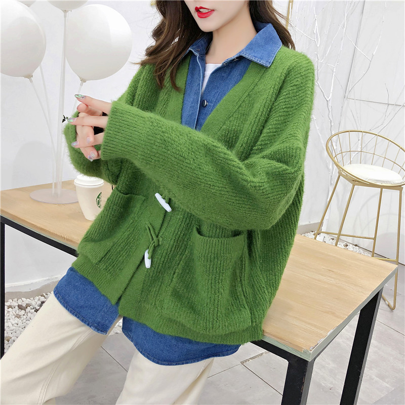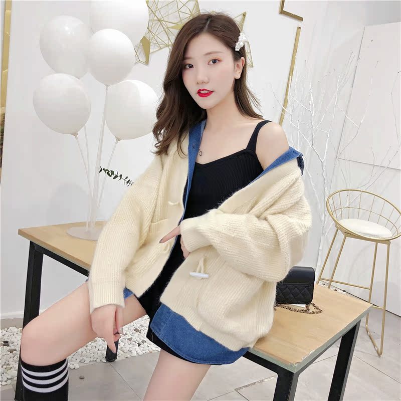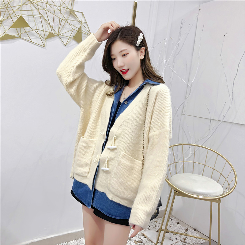 2019秋冬新款牛仔拼接假兩件女毛衣針織開衫慵懶牛角扣上衣短外套1入
