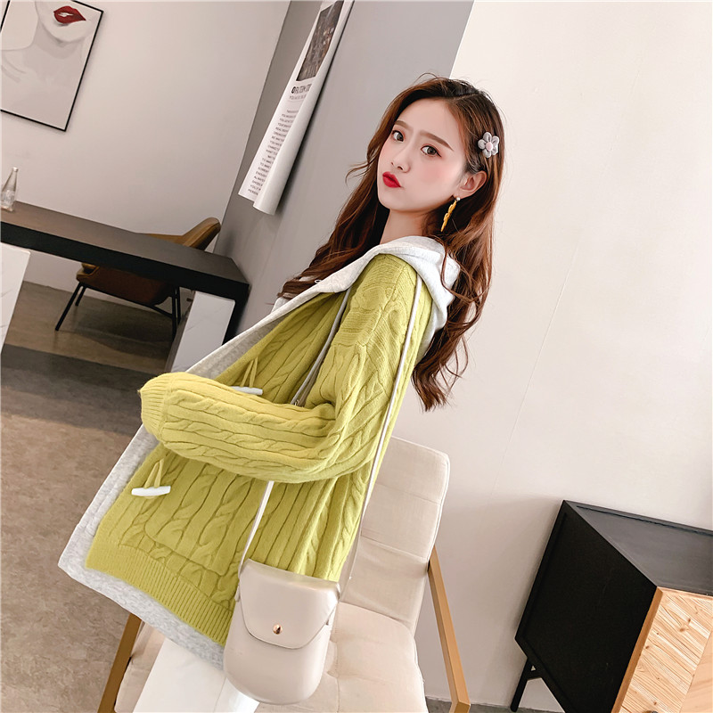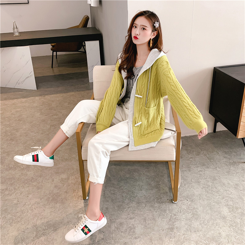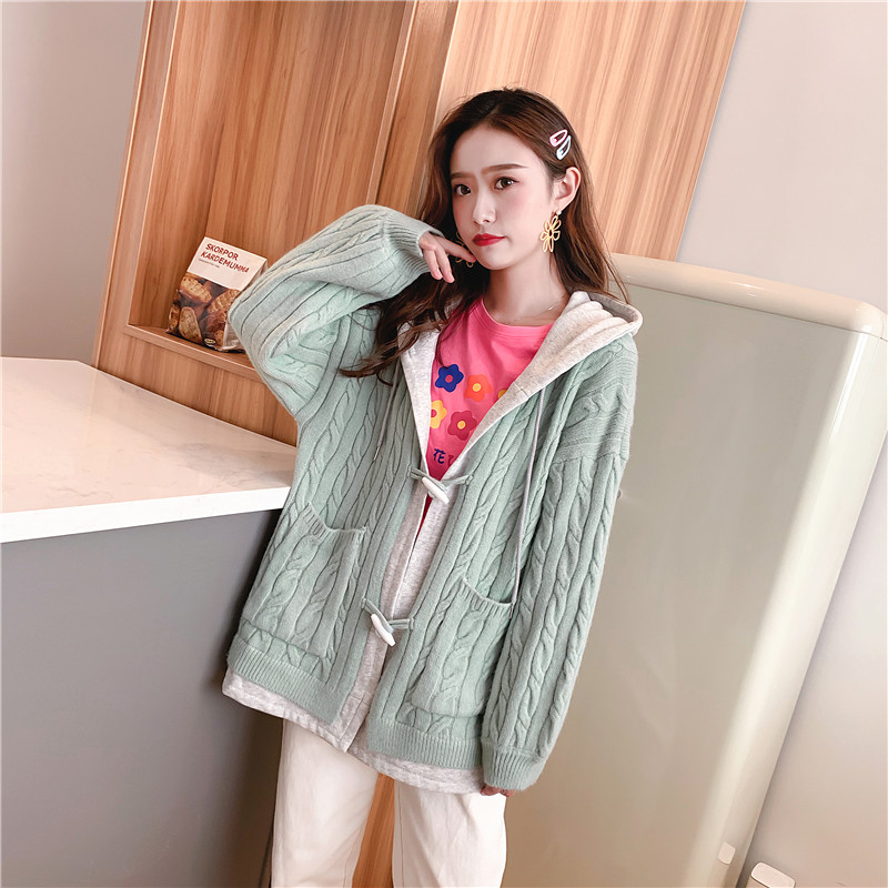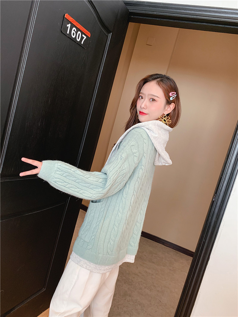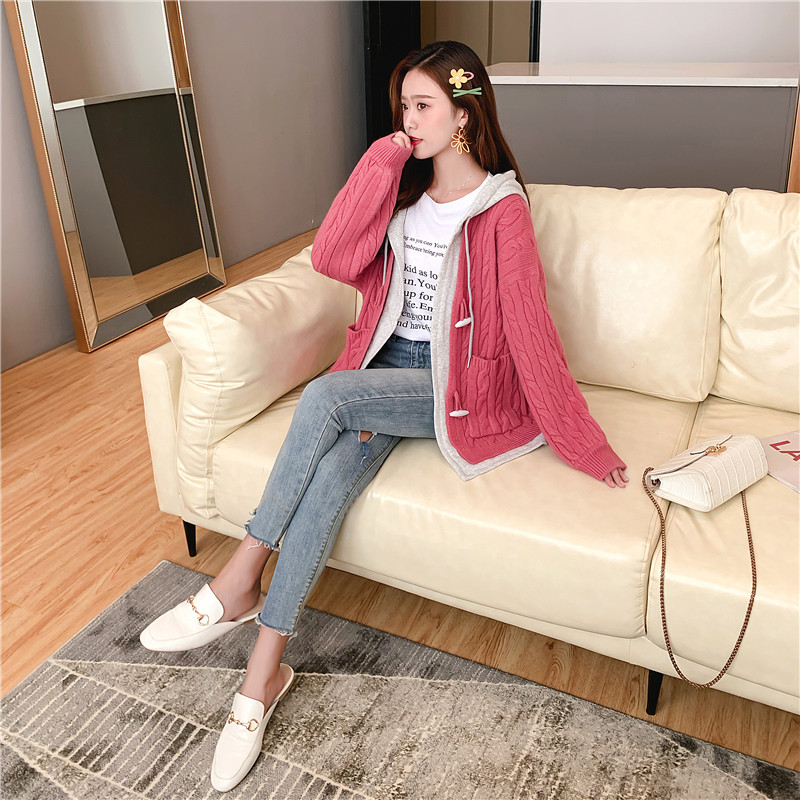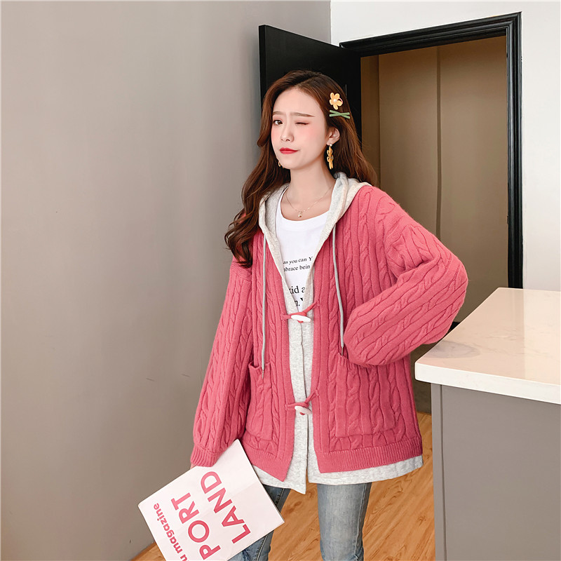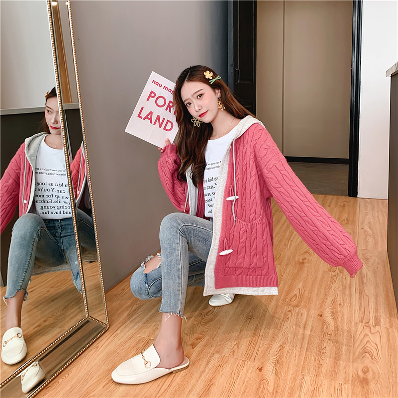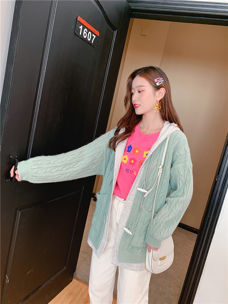 2019秋冬新款假兩件連帽衛衣女毛衣針織開衫慵懶風牛角扣上衣外套1入