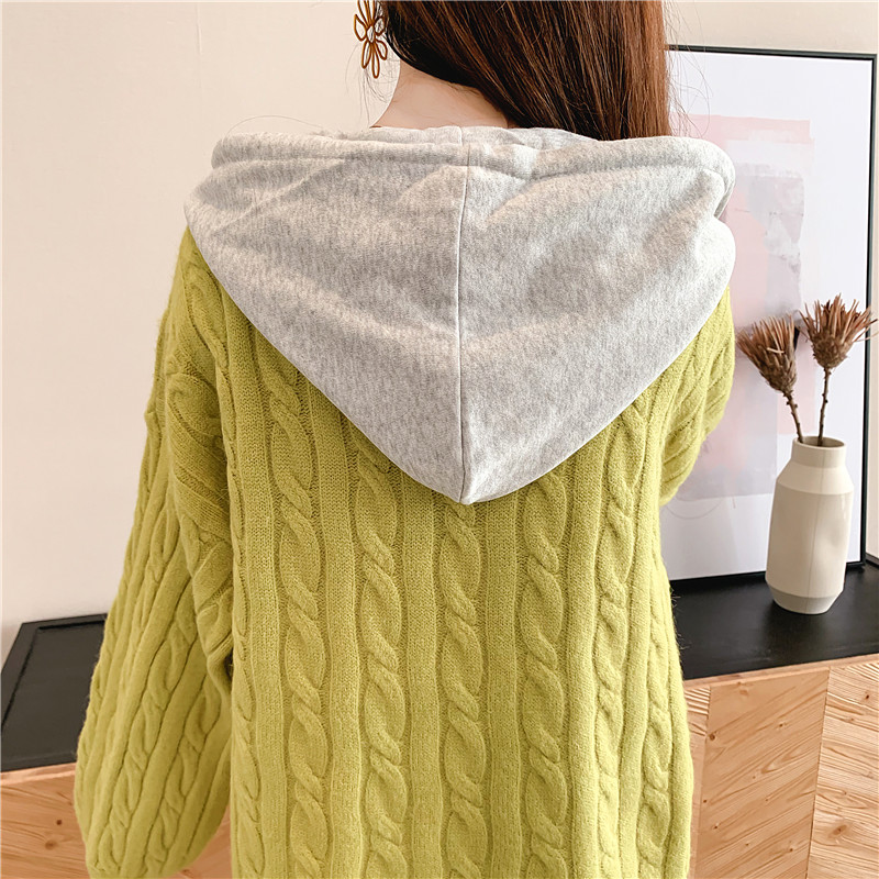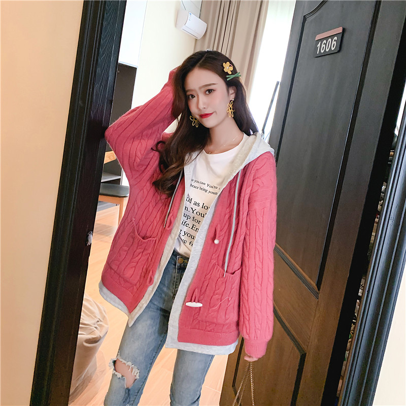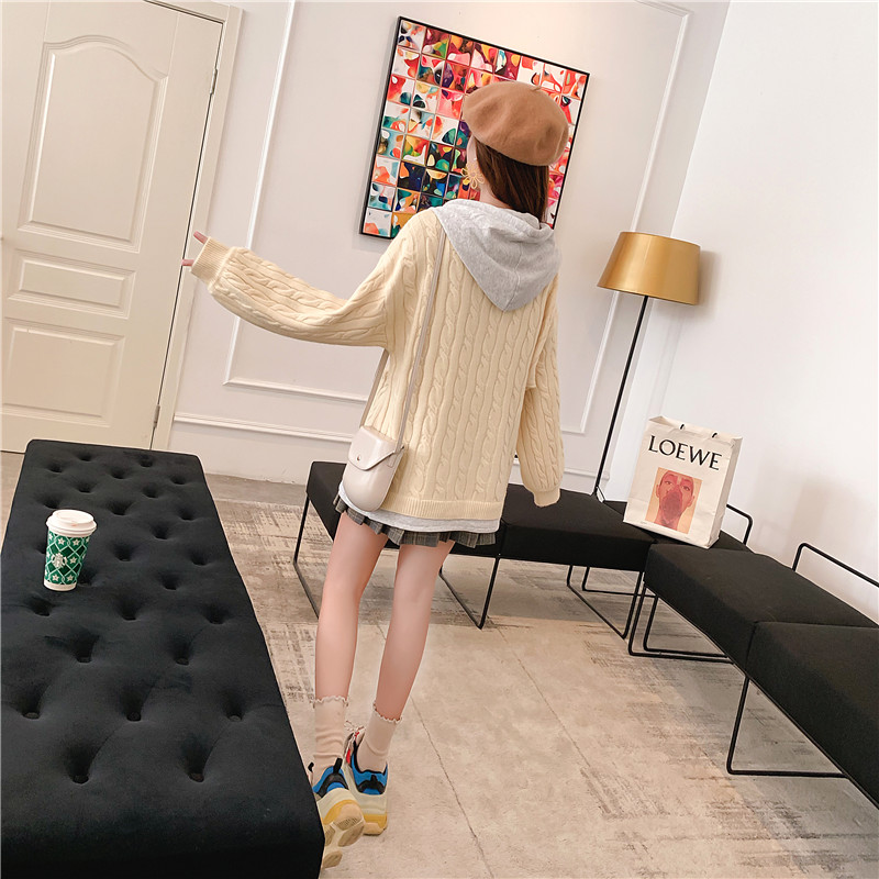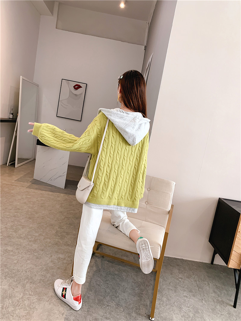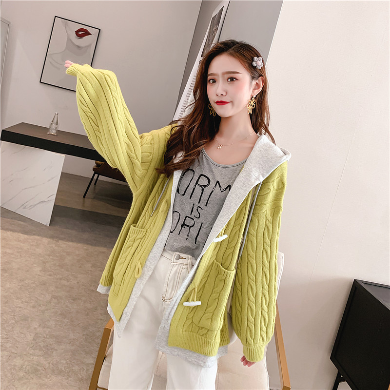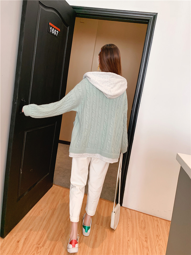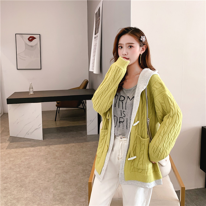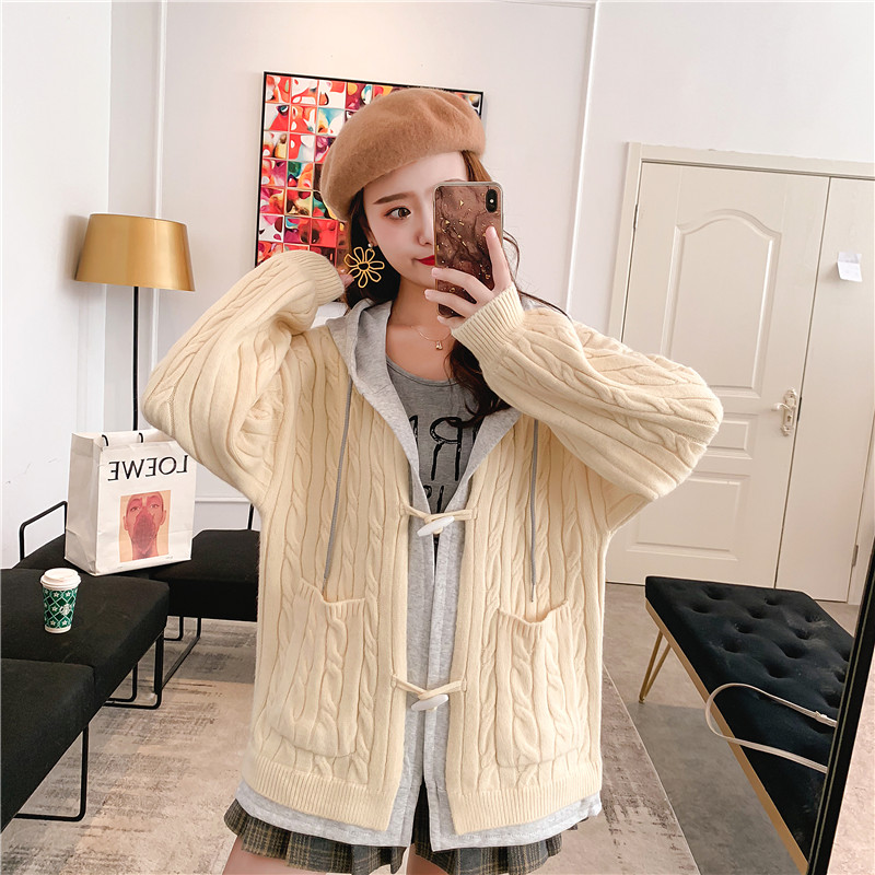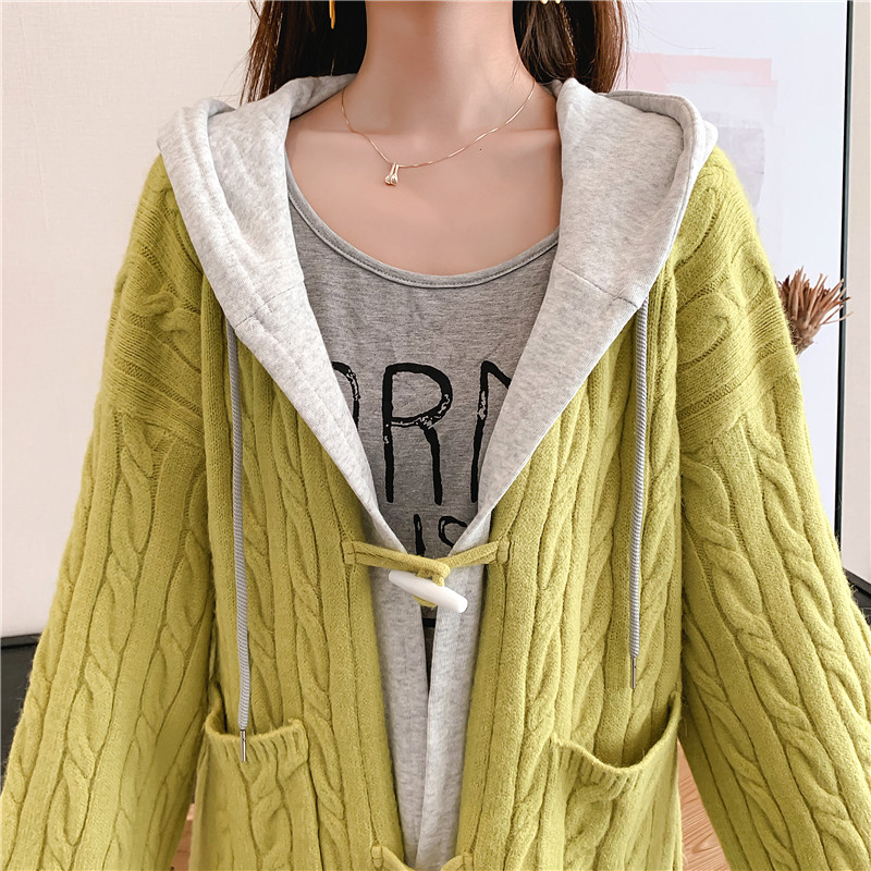 2019秋冬新款假兩件連帽衛衣女毛衣針織開衫慵懶風牛角扣上衣外套1入