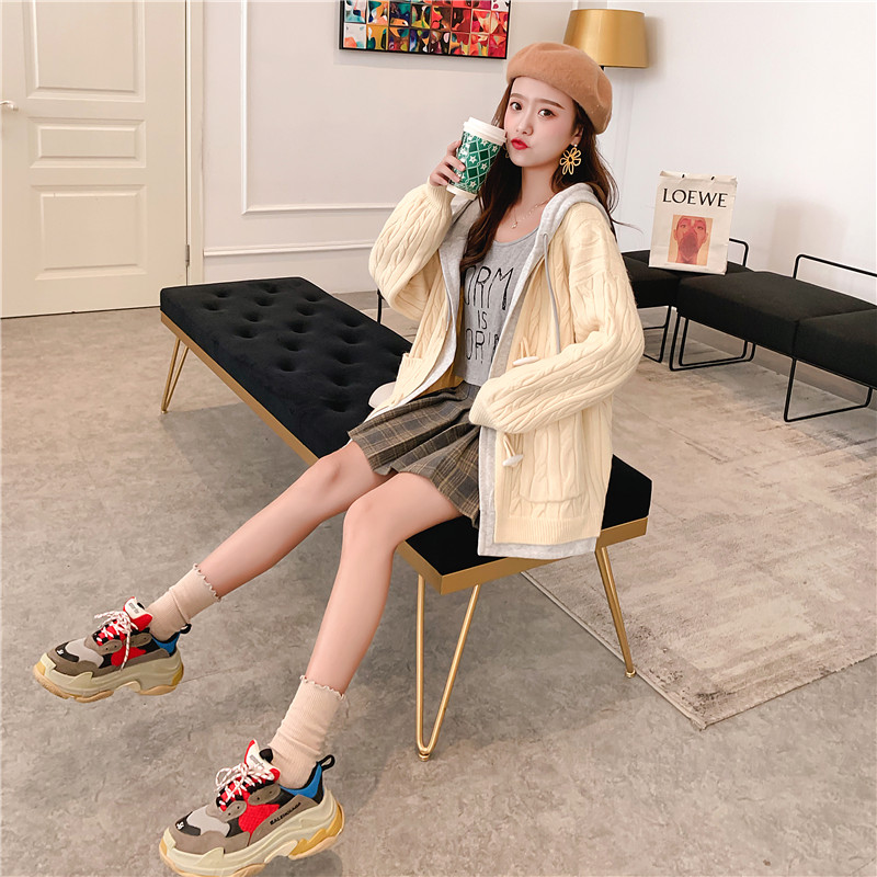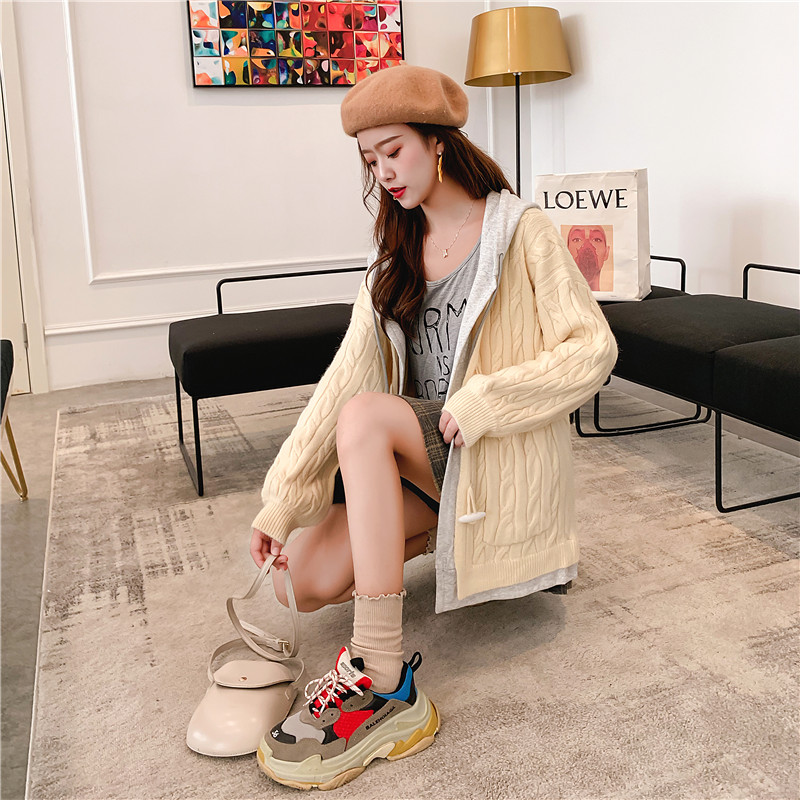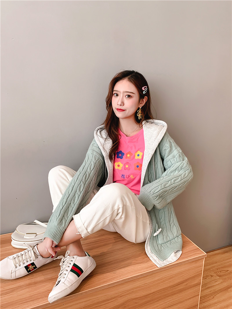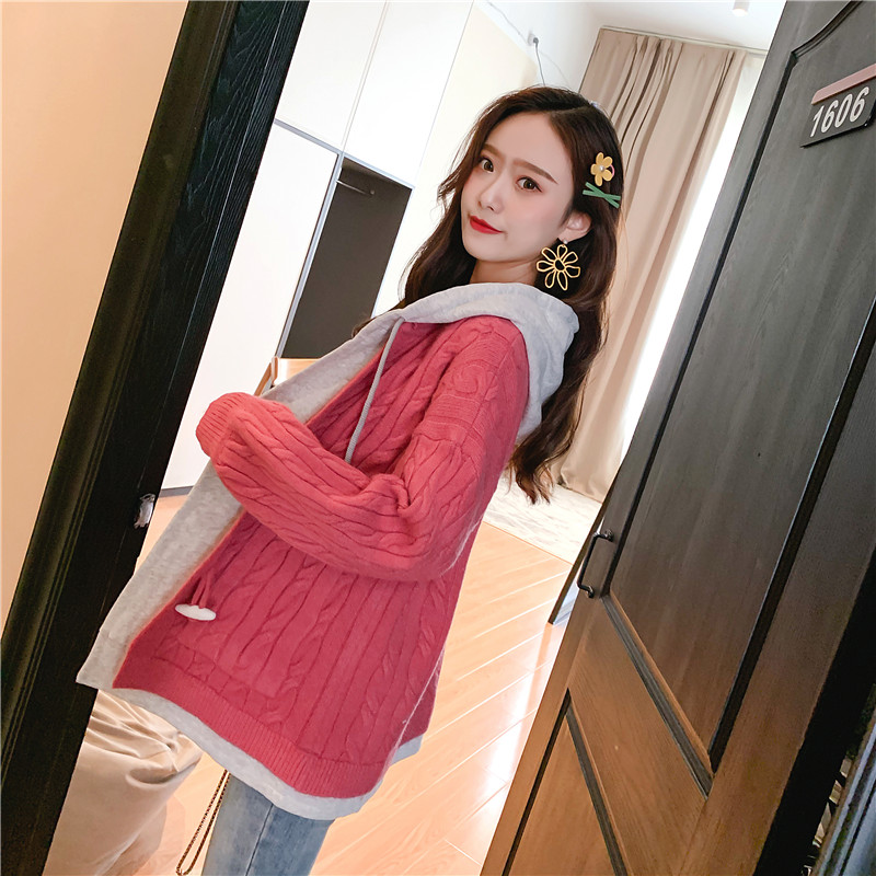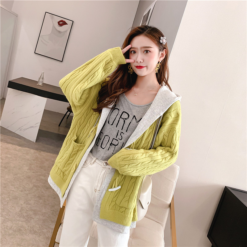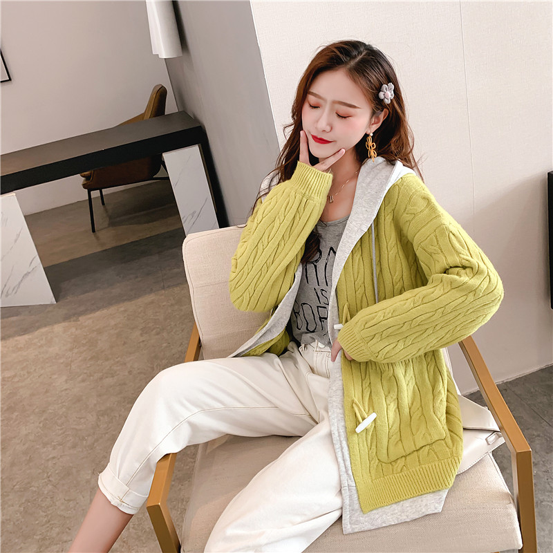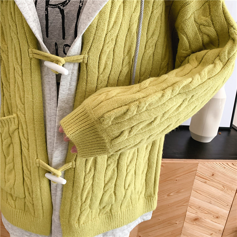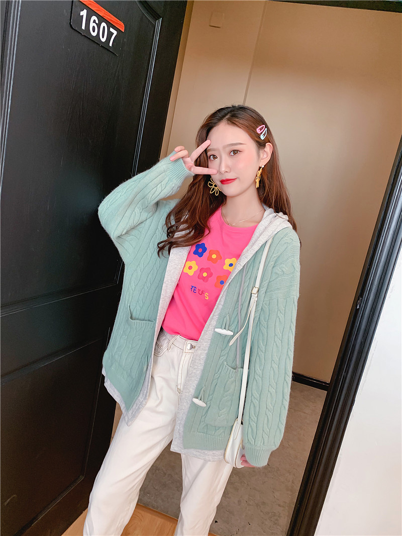 2019秋冬新款假兩件連帽衛衣女毛衣針織開衫慵懶風牛角扣上衣外套1入