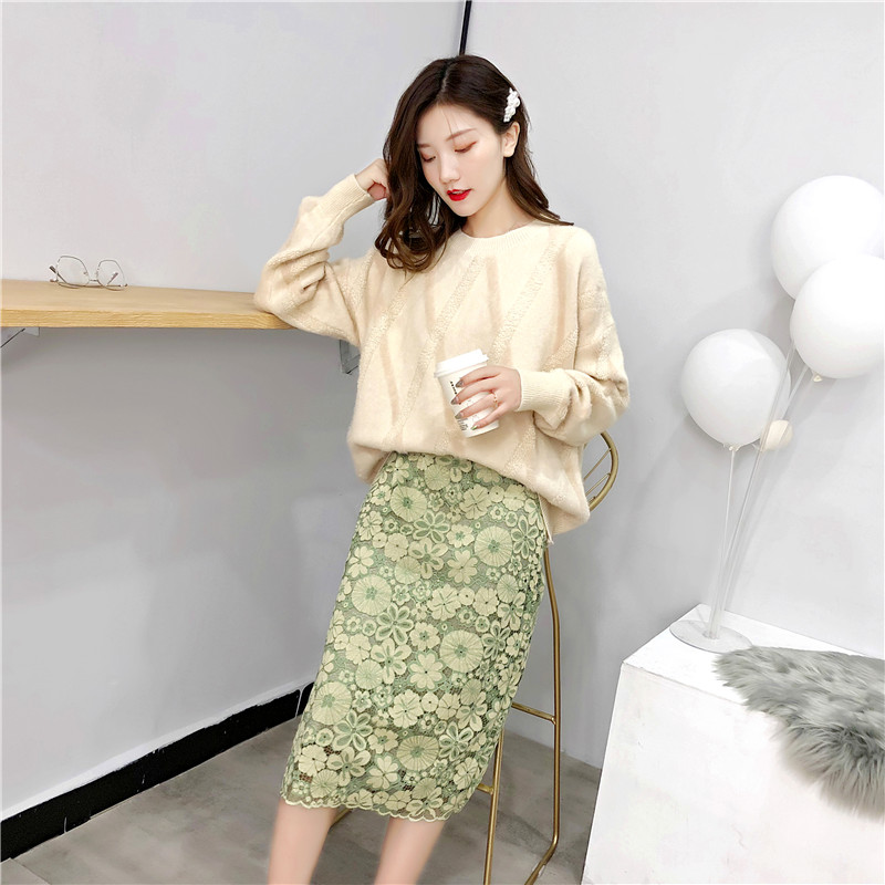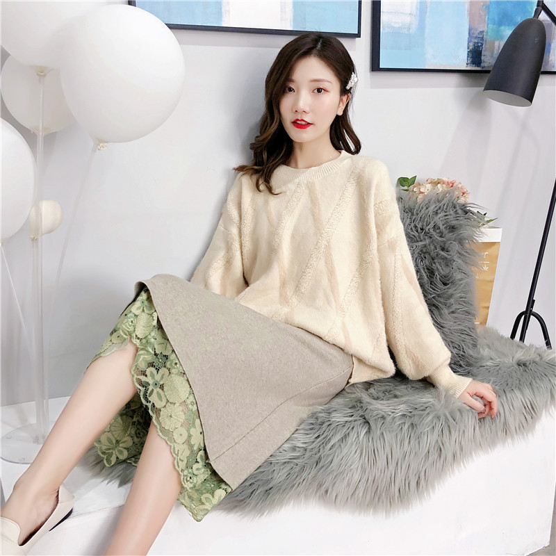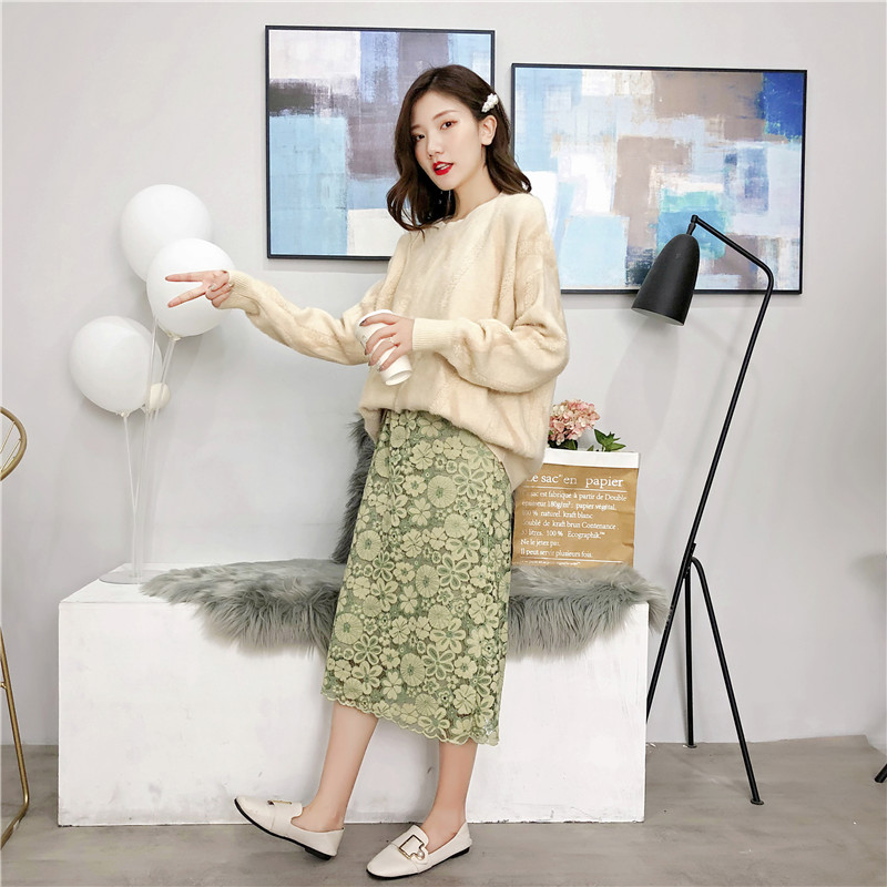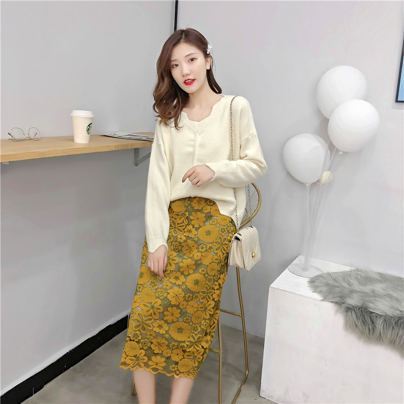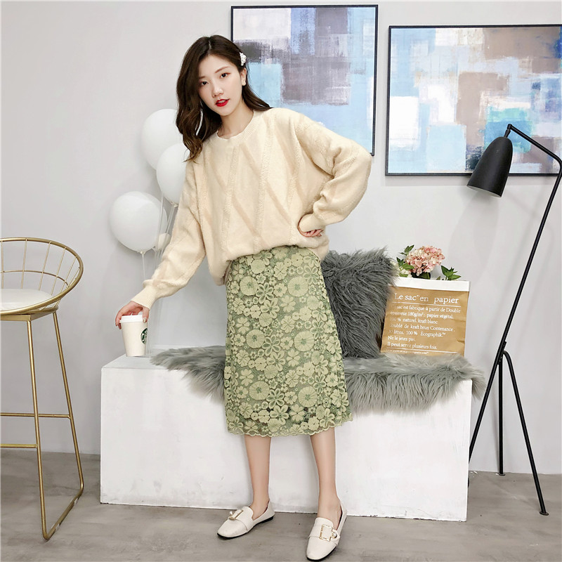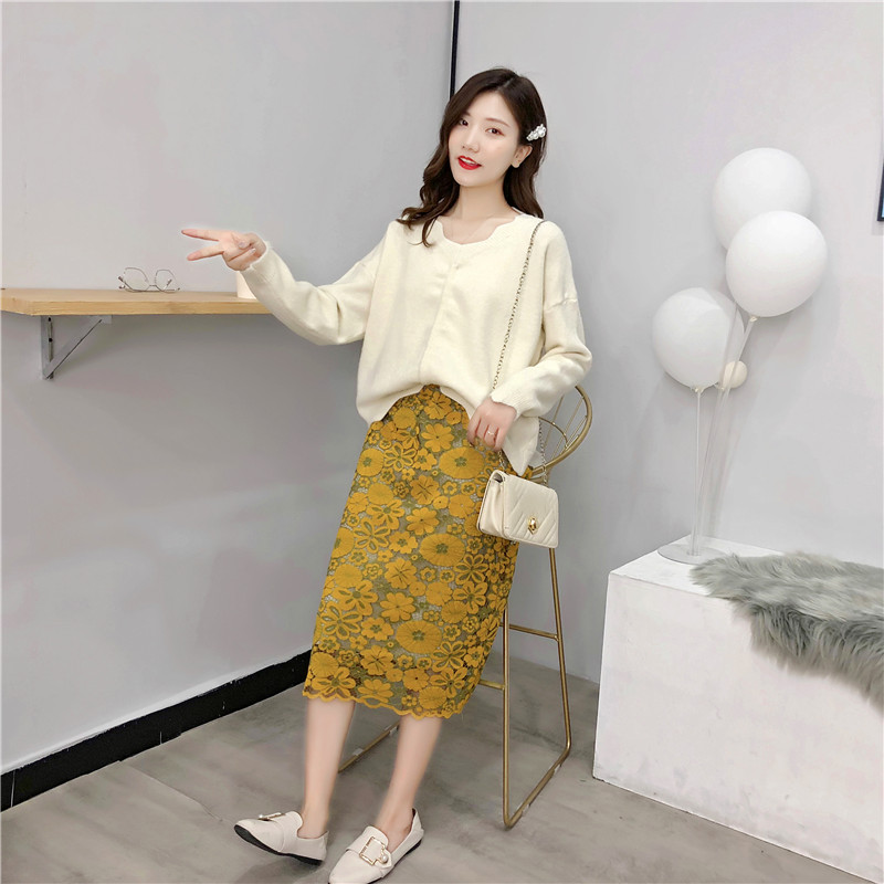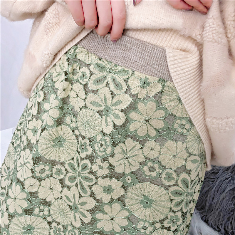 針織半身裙秋冬2019新款女裝包臀一步裙蕾絲正反兩面穿松緊腰裙子1入