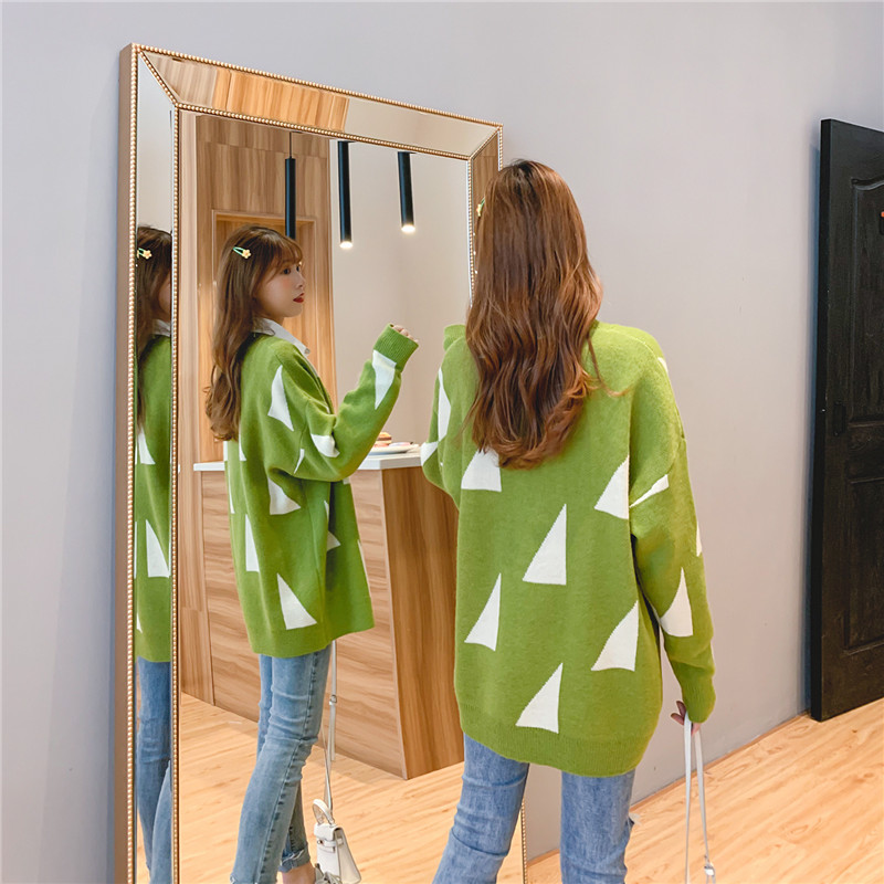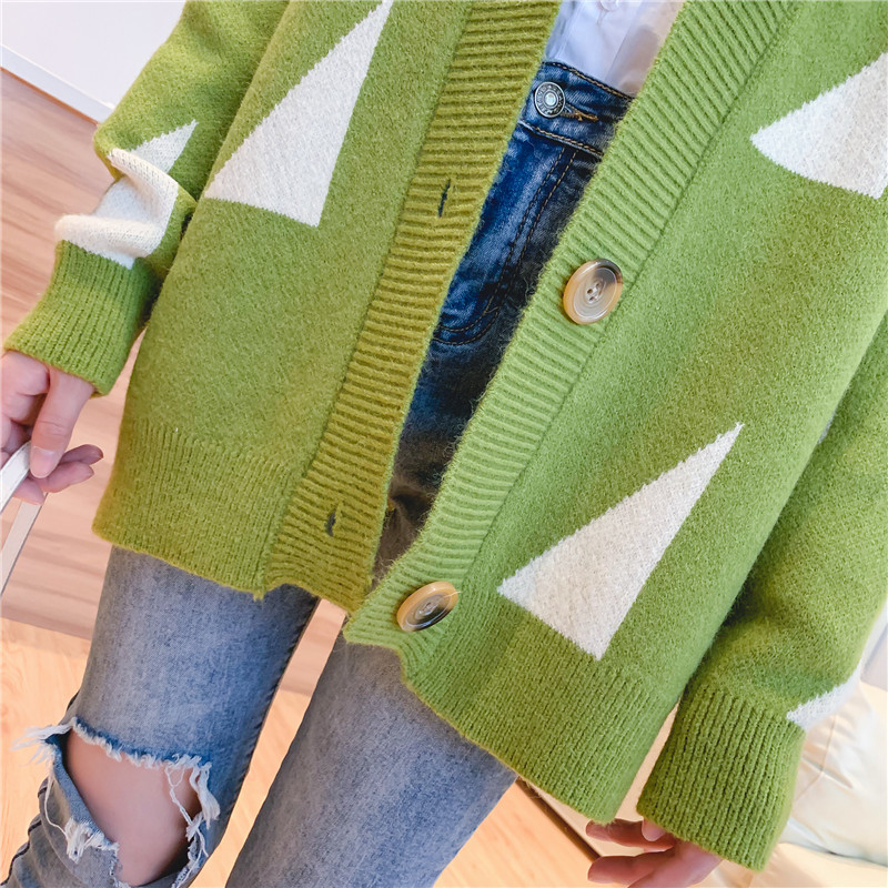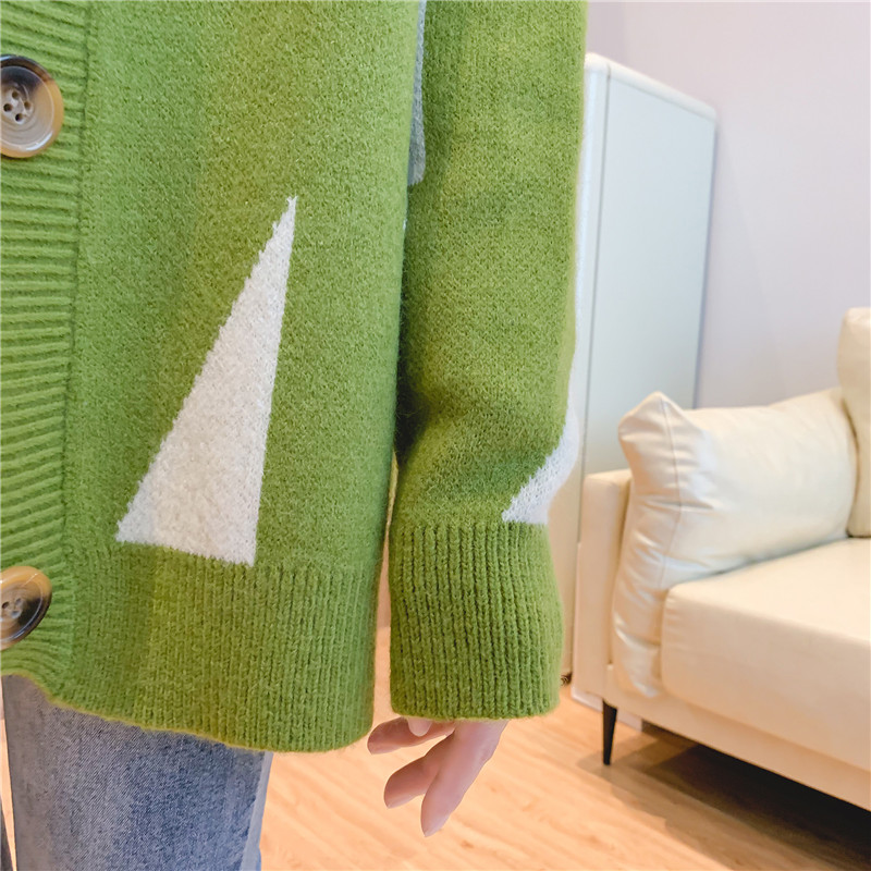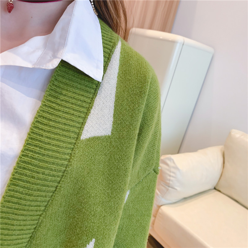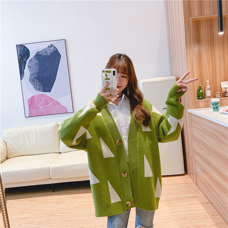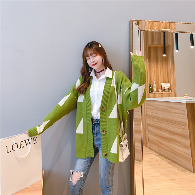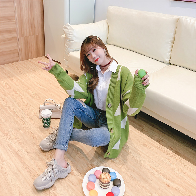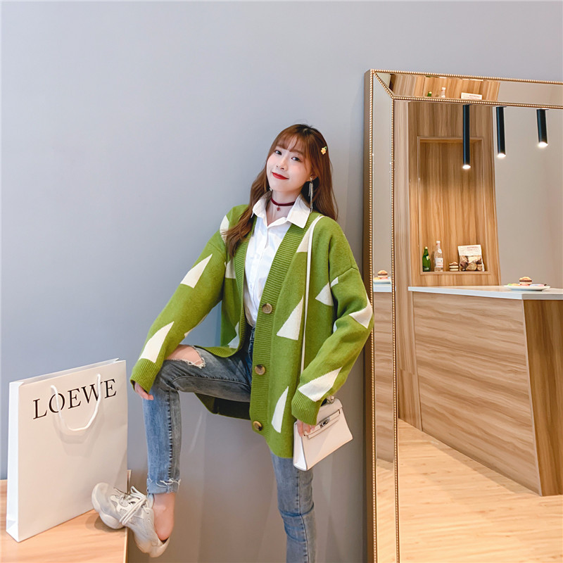 2019秋冬新款女寬松牛油果綠慵懶風毛衣網紅百搭針織開衫上衣外套1入