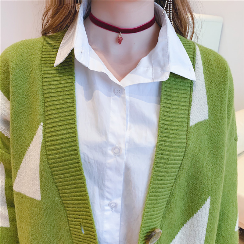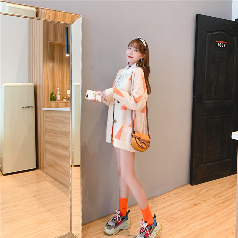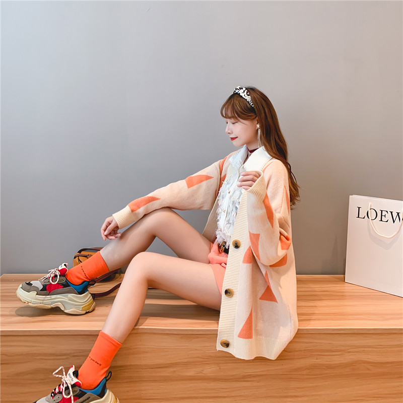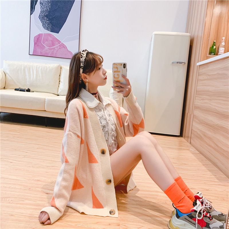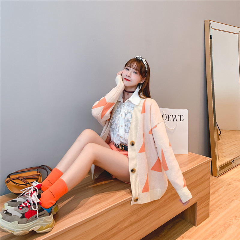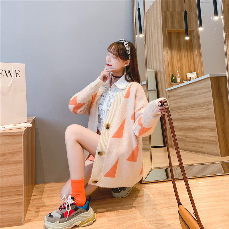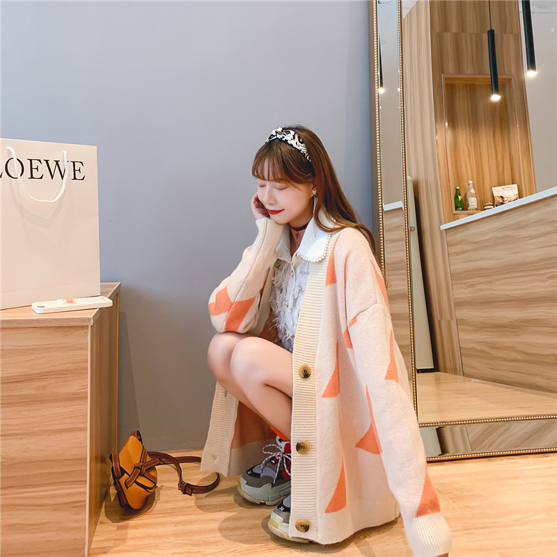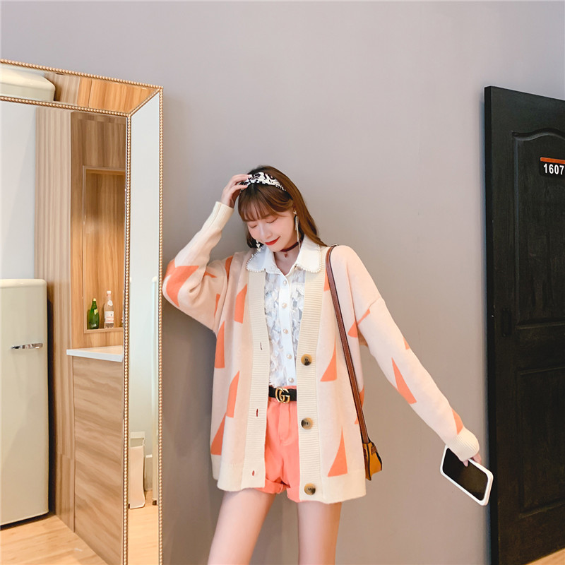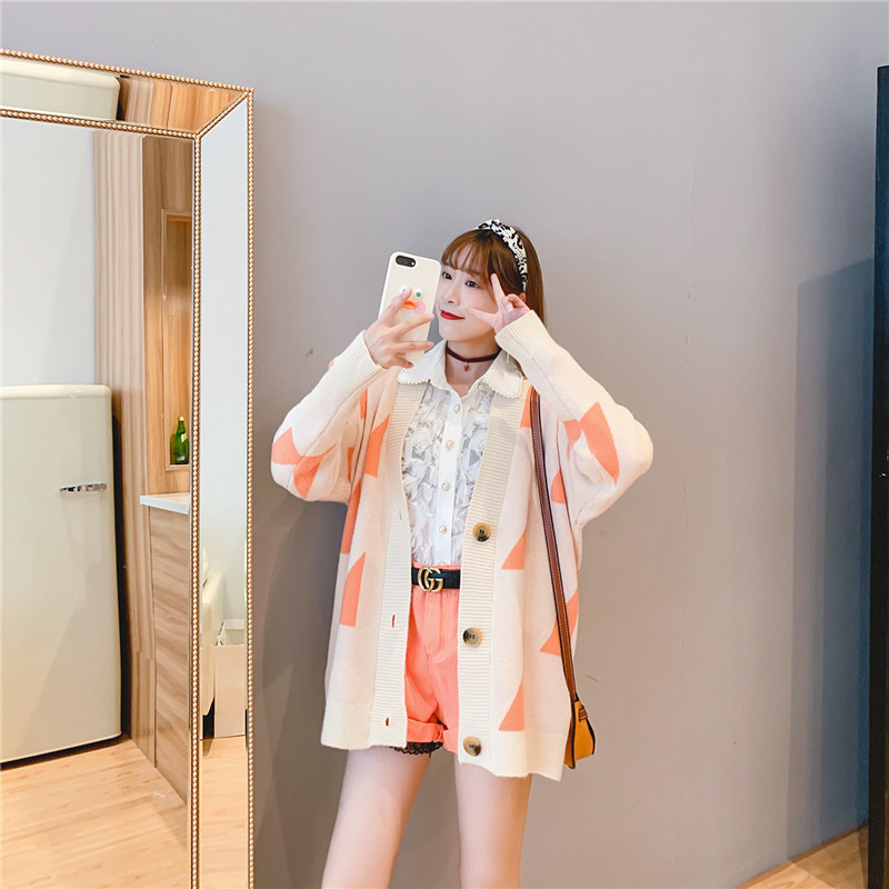 2019秋冬新款女寬松牛油果綠慵懶風毛衣網紅百搭針織開衫上衣外套1入