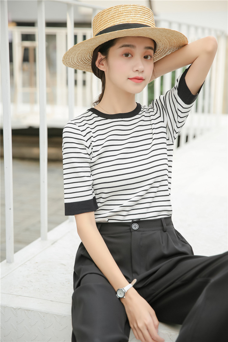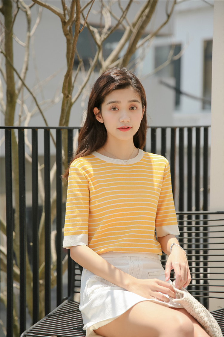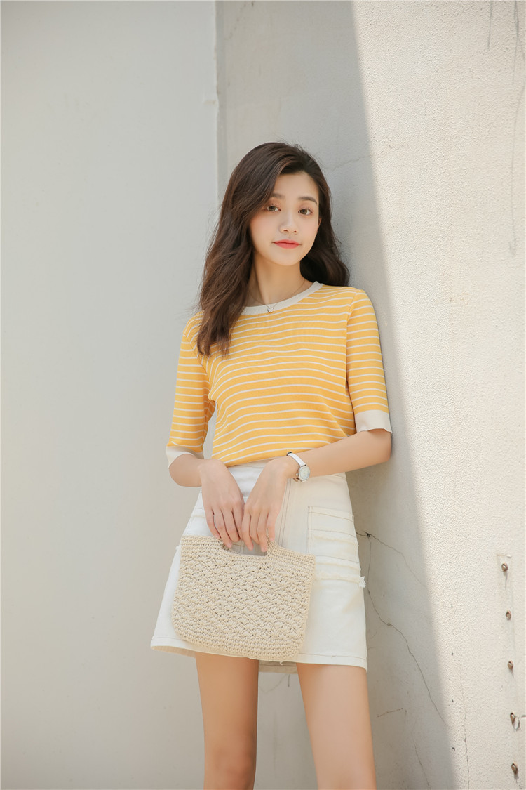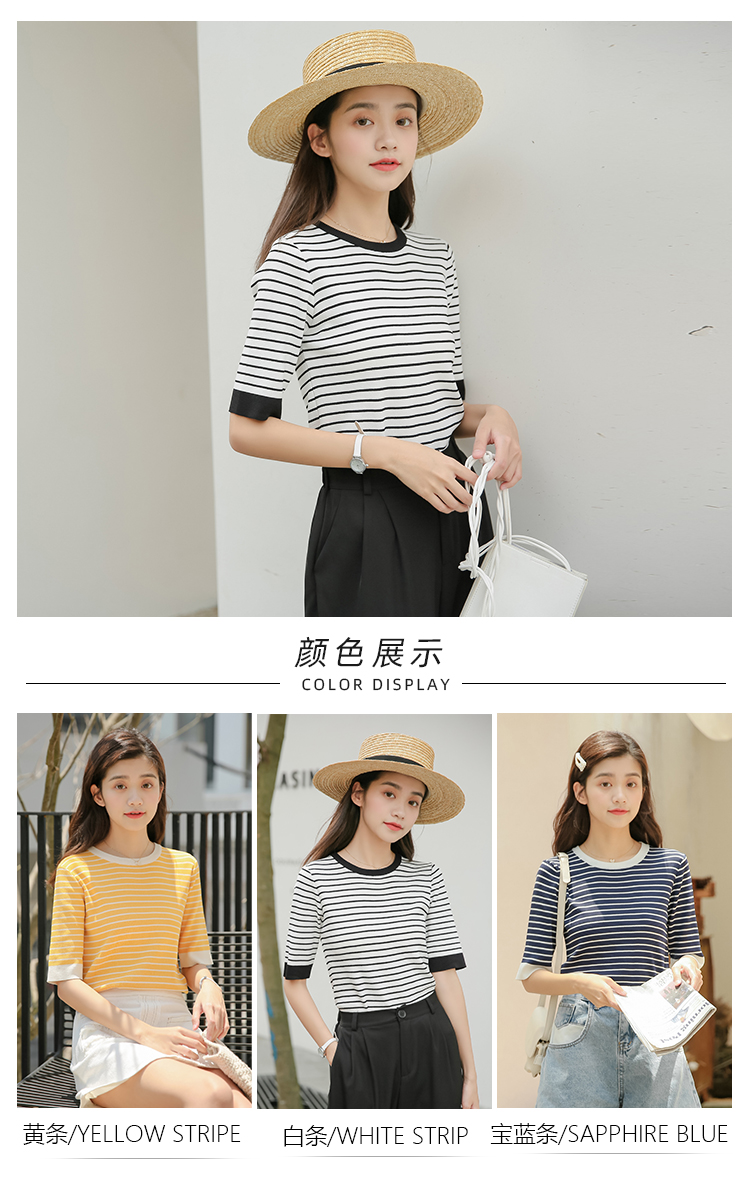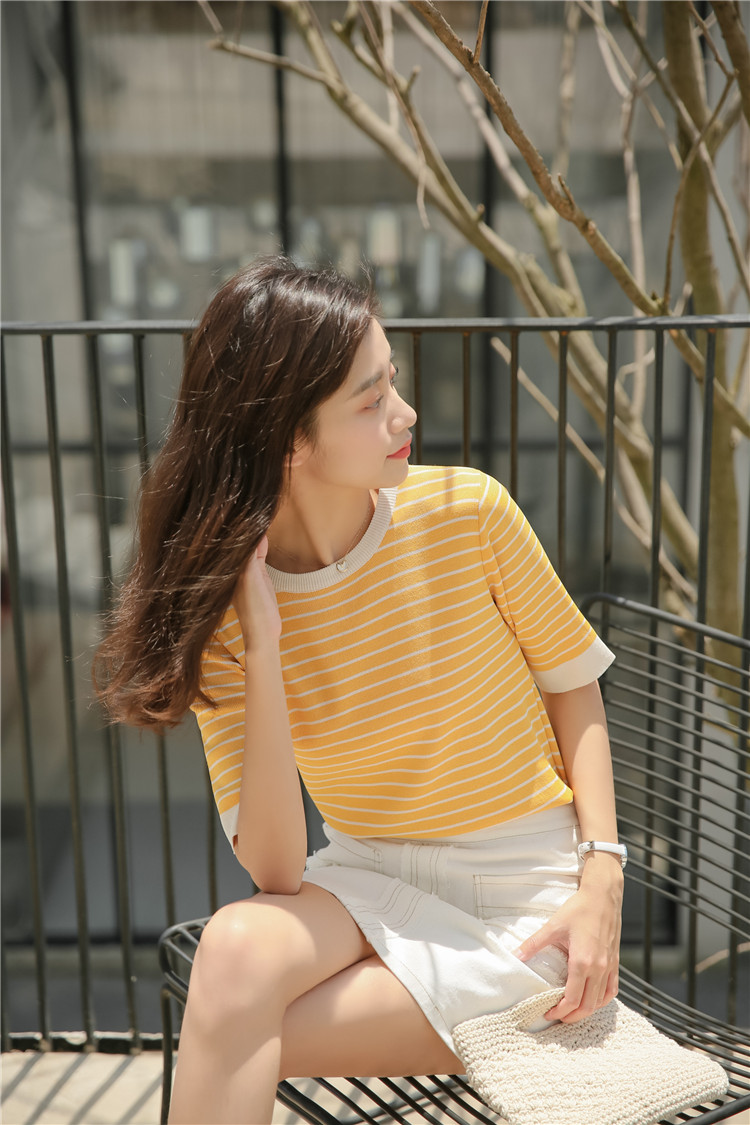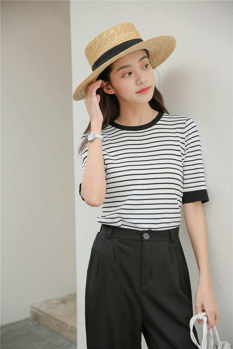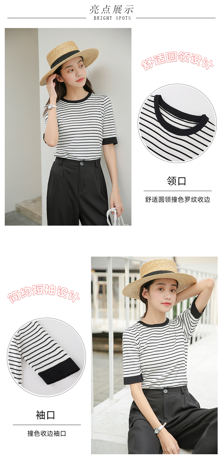 2019新款夏裝韓版時尚學生半袖上衣女百搭圓領條紋針織衫短袖T恤1入