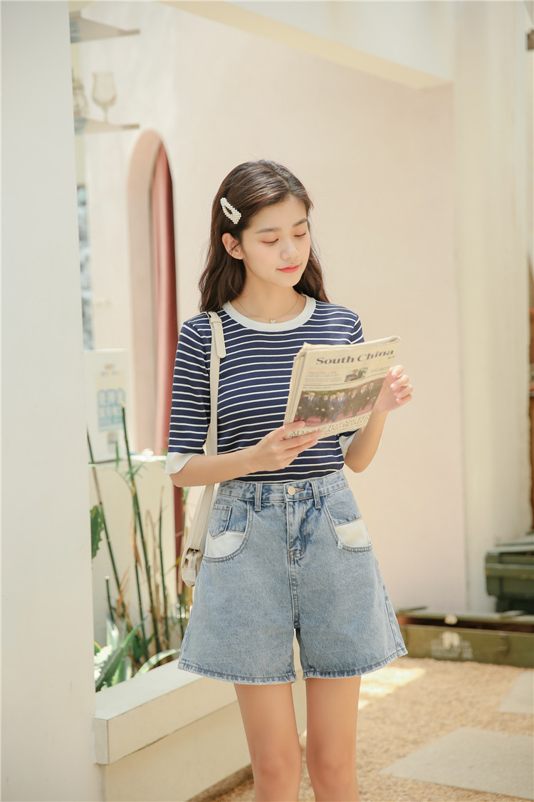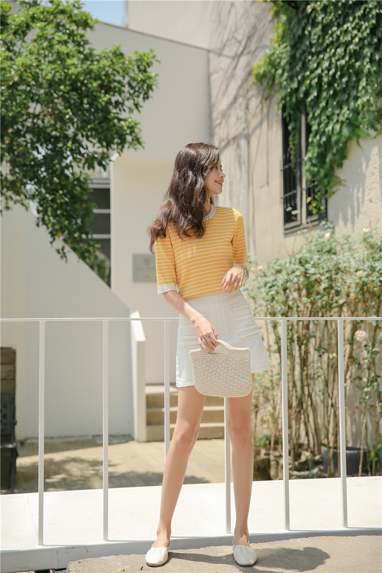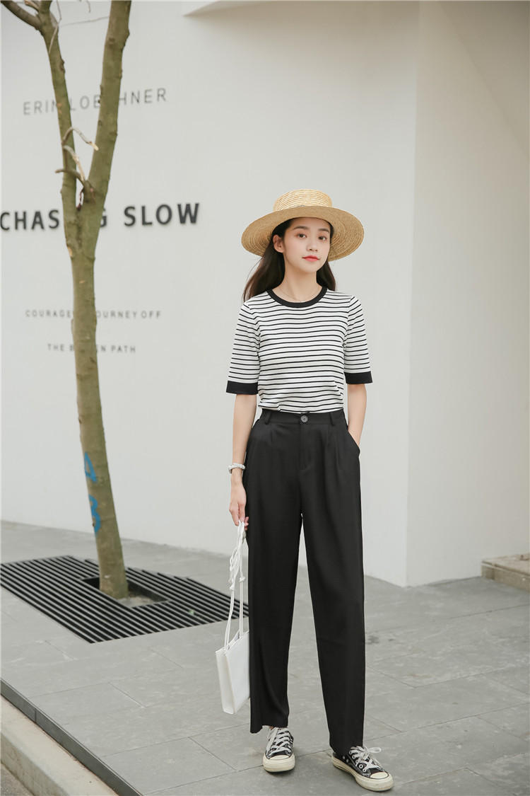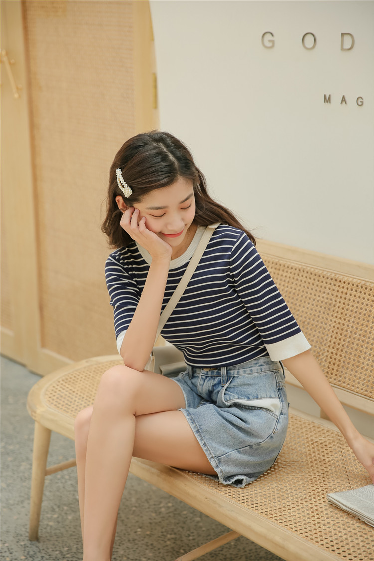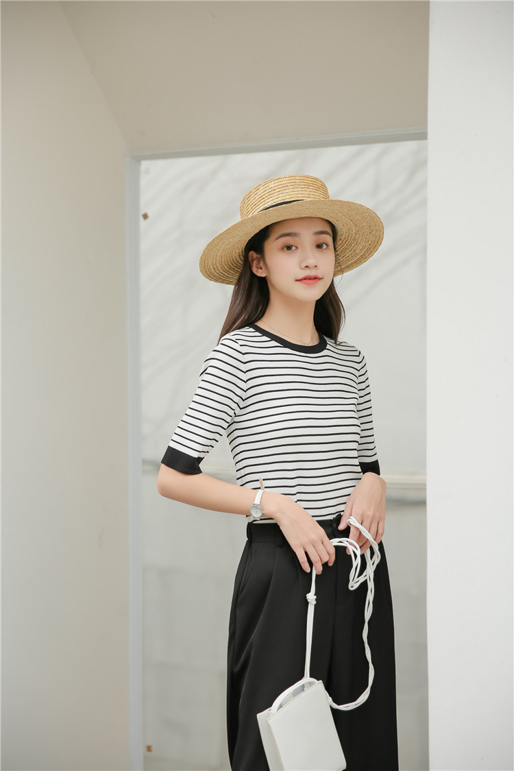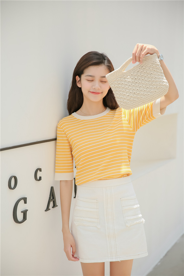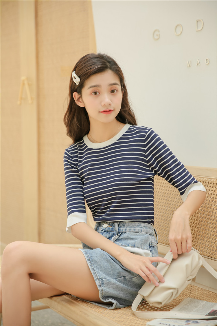 2019新款夏裝韓版時尚學生半袖上衣女百搭圓領條紋針織衫短袖T恤1入