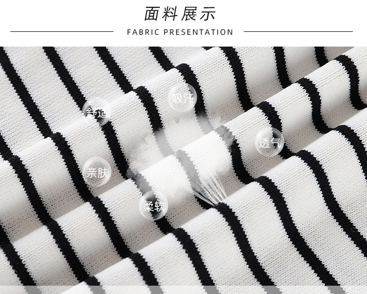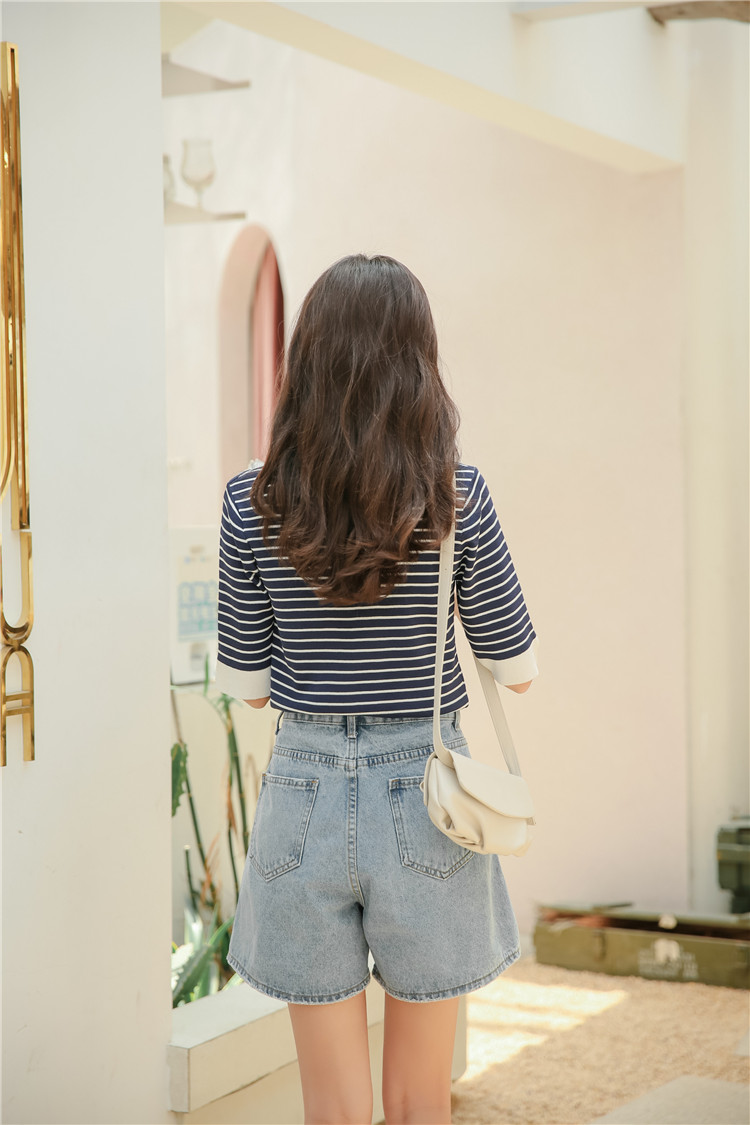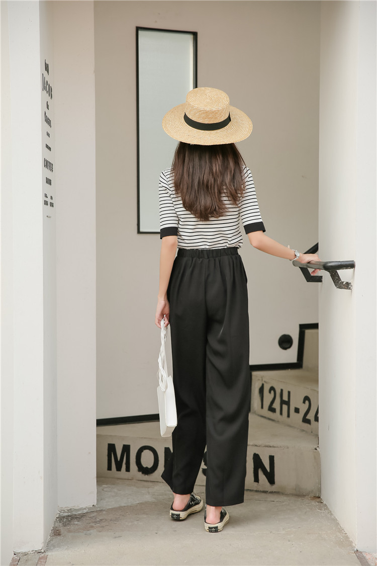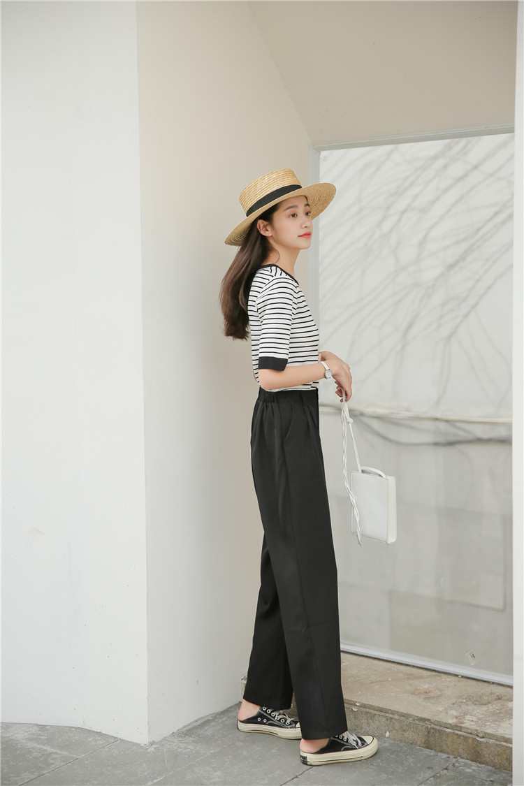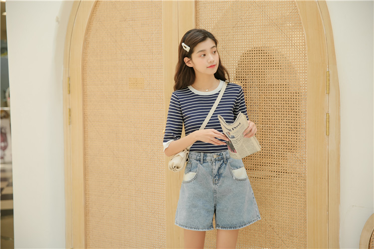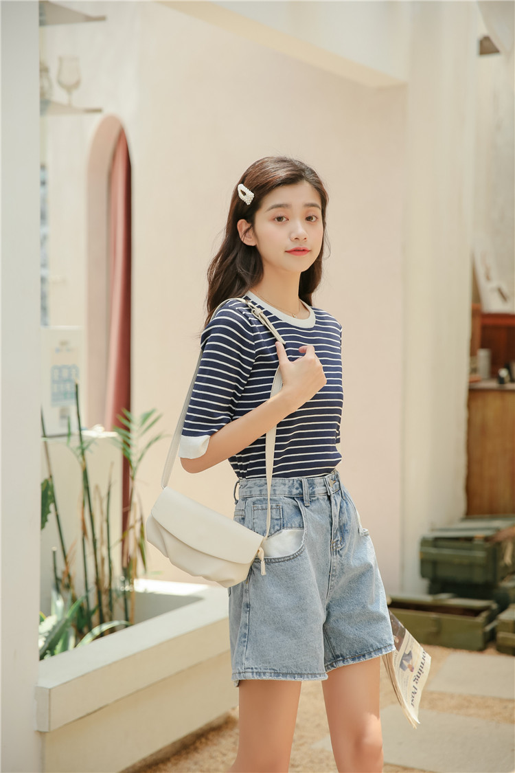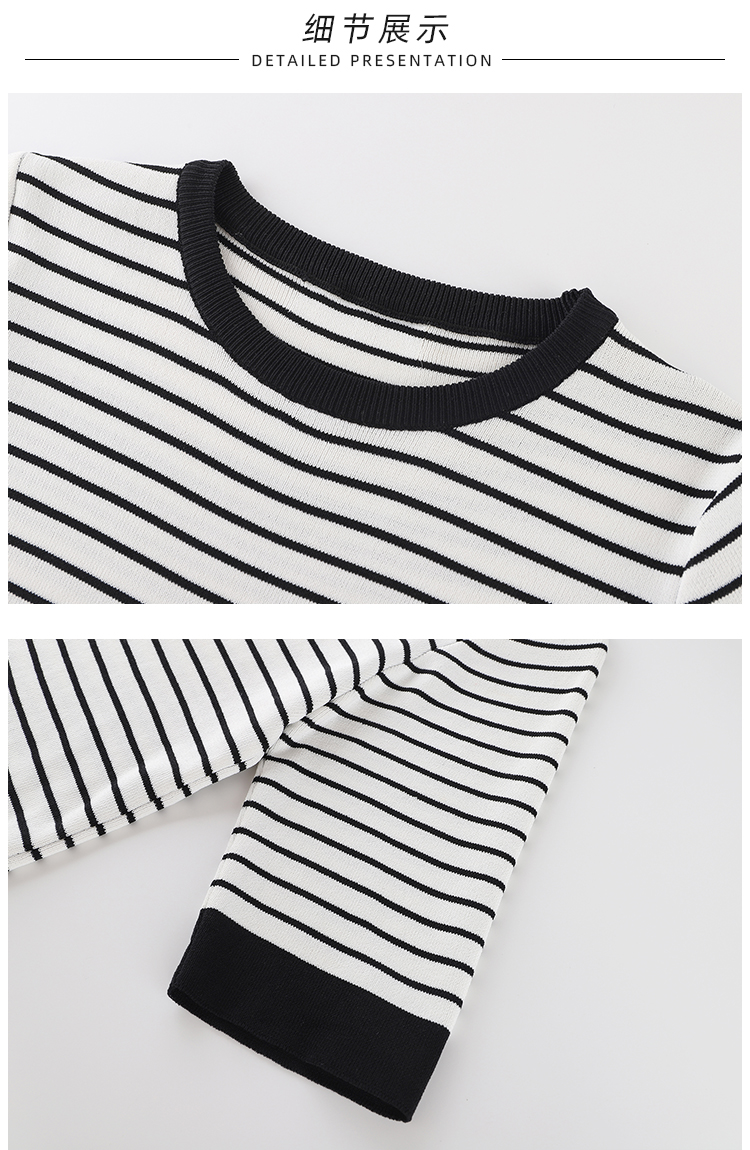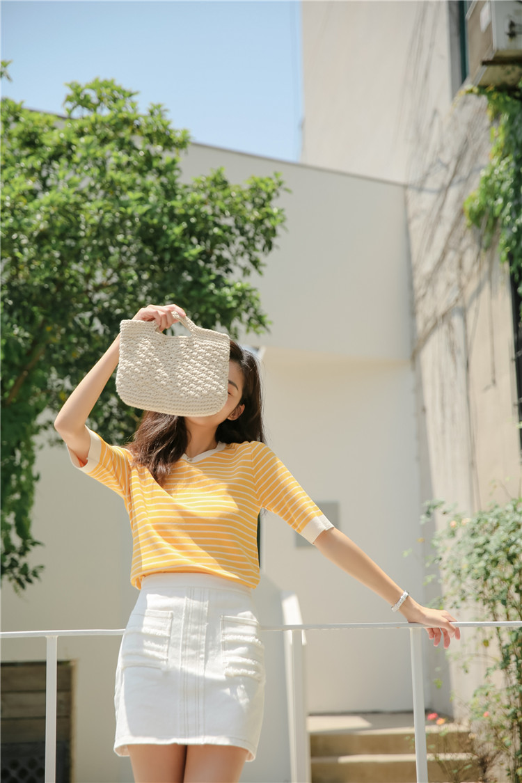 2019新款夏裝韓版時尚學生半袖上衣女百搭圓領條紋針織衫短袖T恤1入