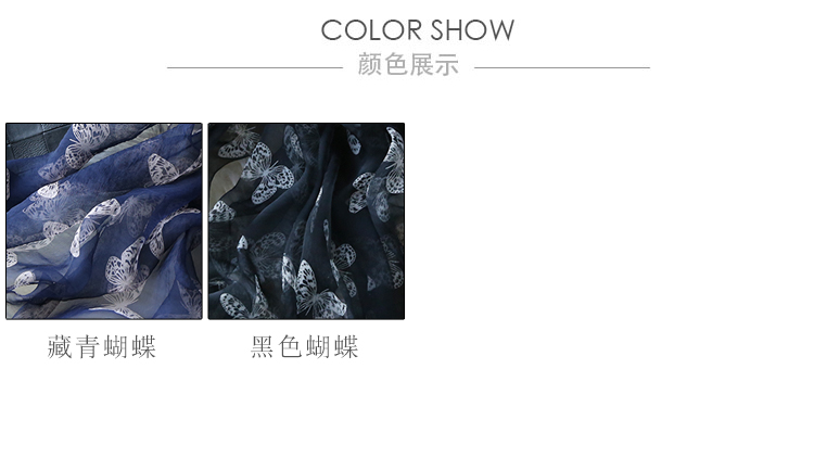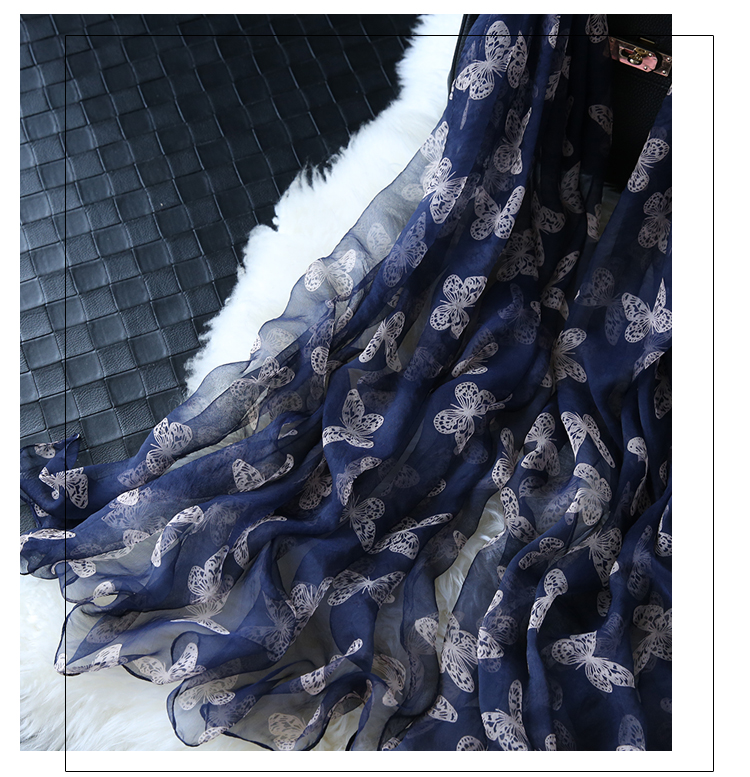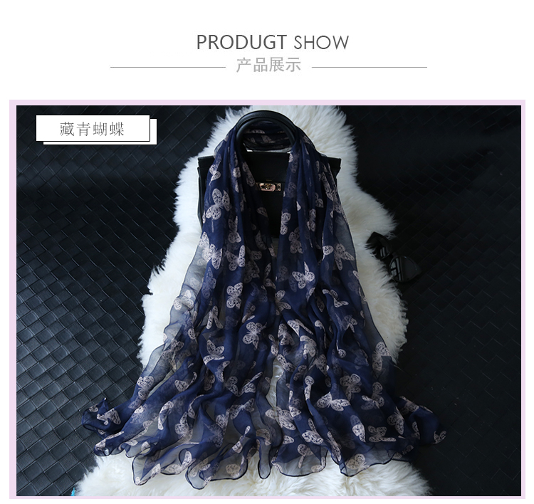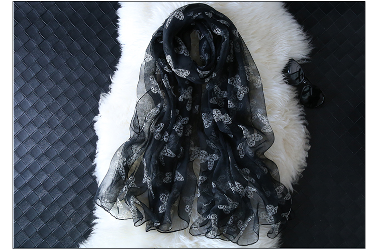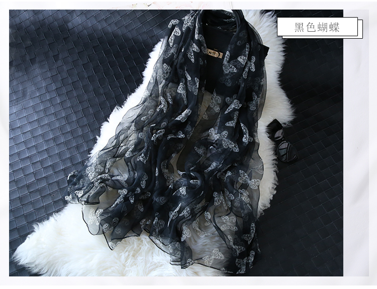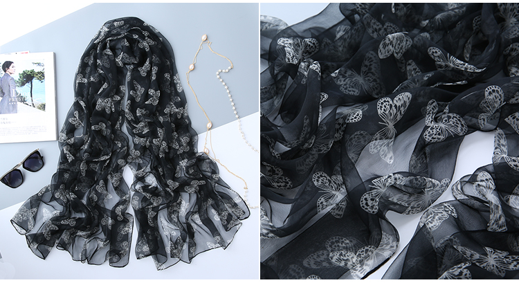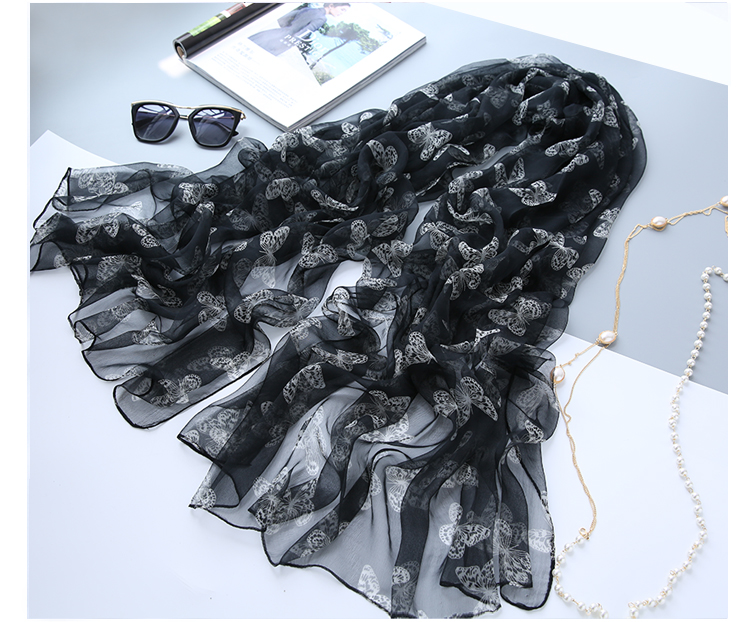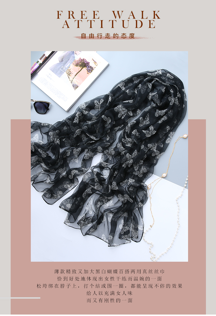 黑白圍巾女春秋薄真絲時尚百搭氣質蝴蝶印花柔軟保暖桑蠶絲絲巾冬1入