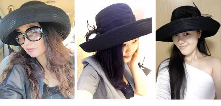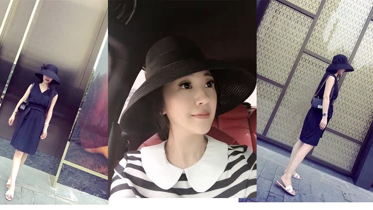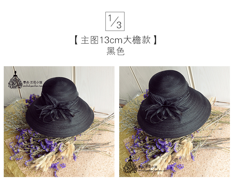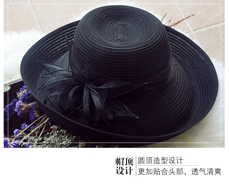 2018女士歐根紗黑白大檐遮陽草帽漁夫防曬歐美復古花朵帽子可折疊1入