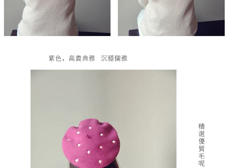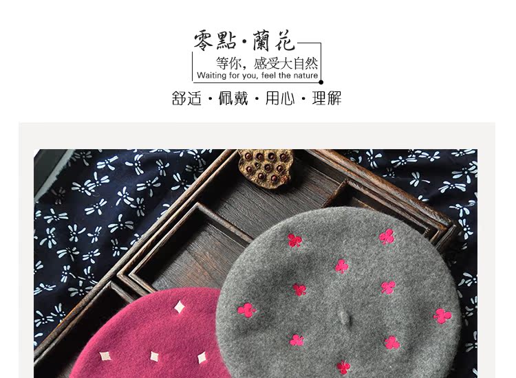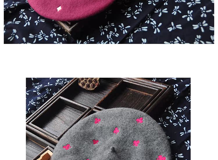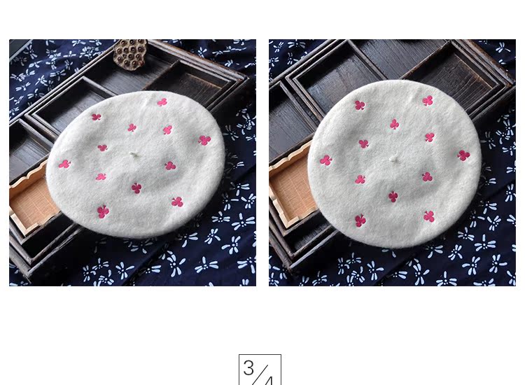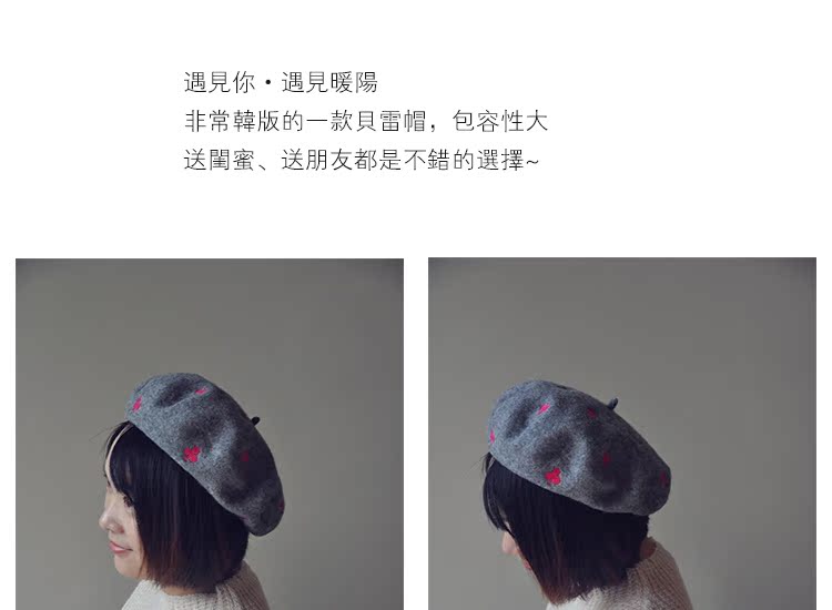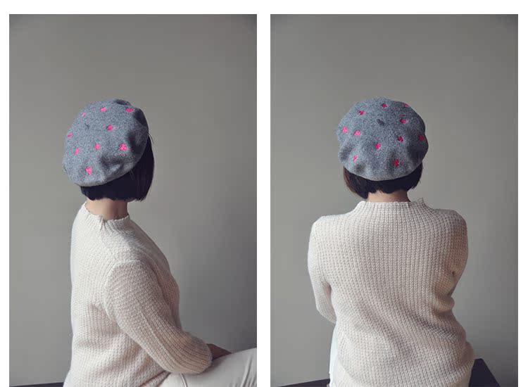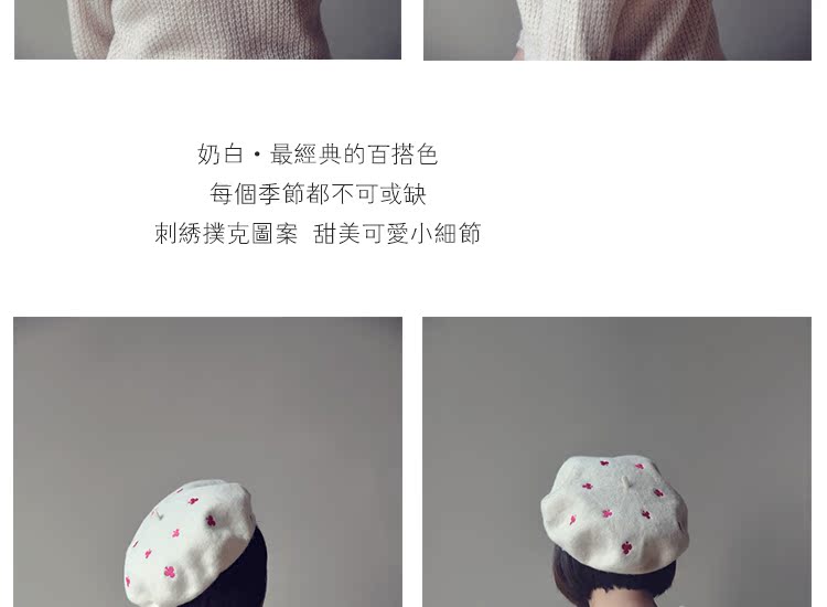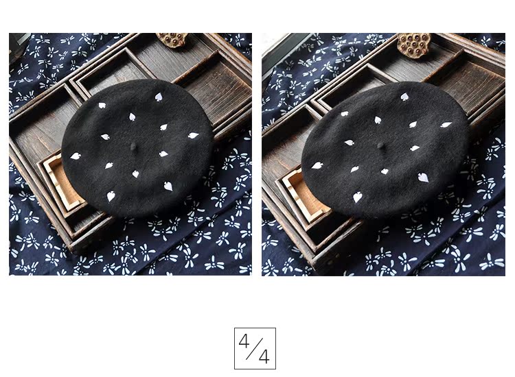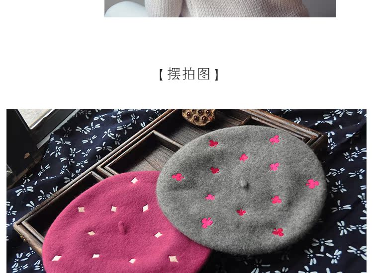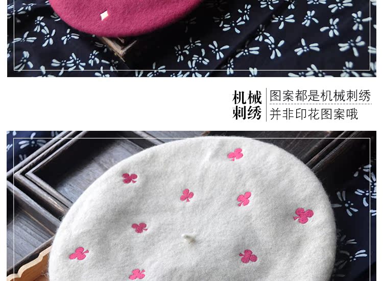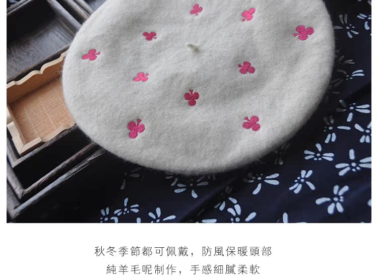 韓版撲克牌刺繡羊毛貝雷帽 毛呢帽畫家帽女 復古文藝學生蓓蕾帽子1入