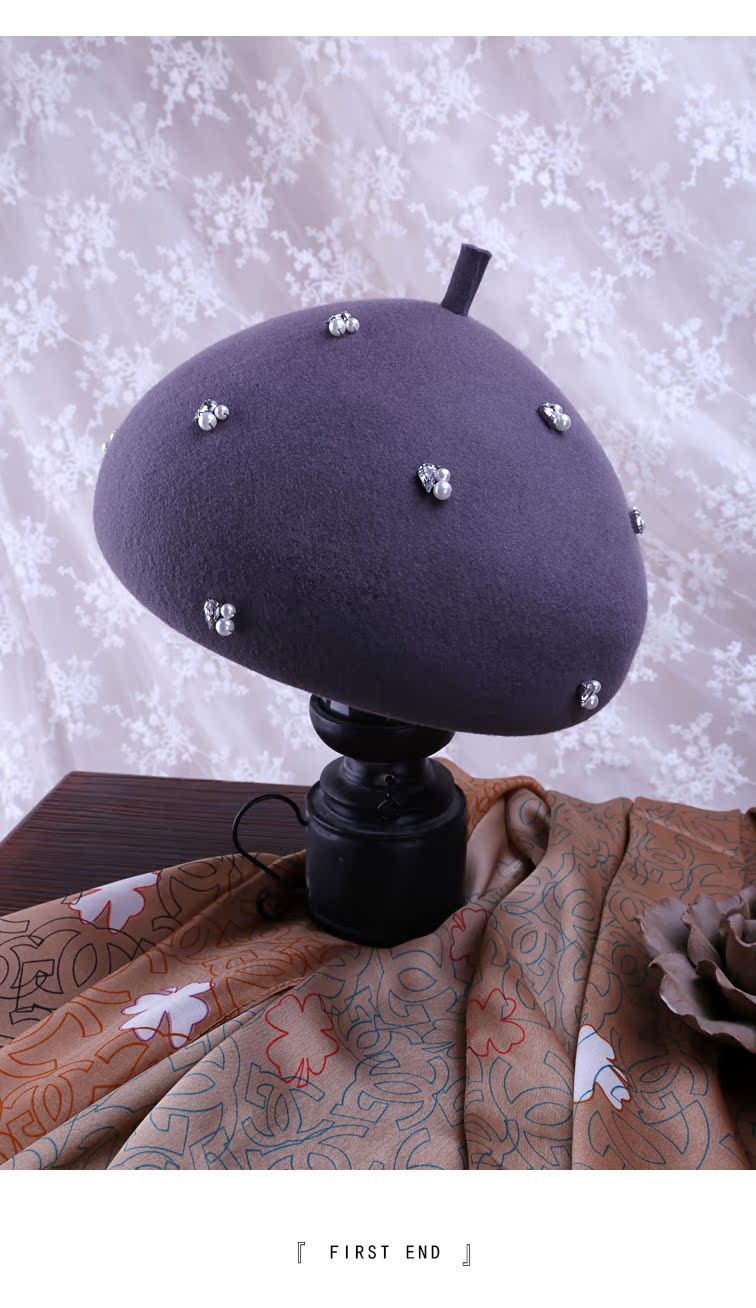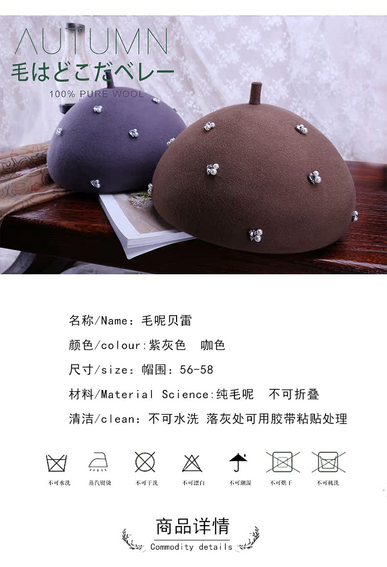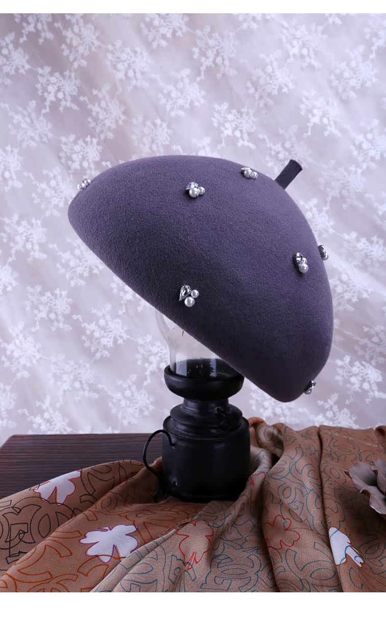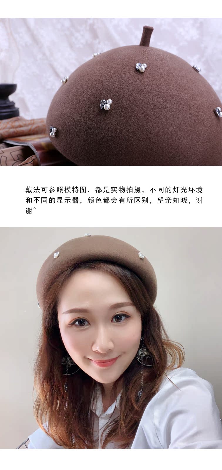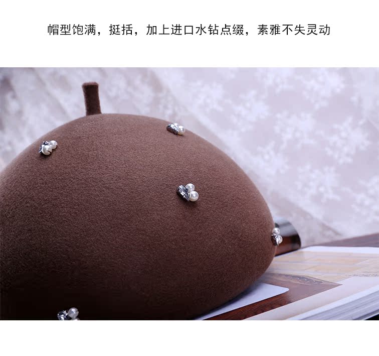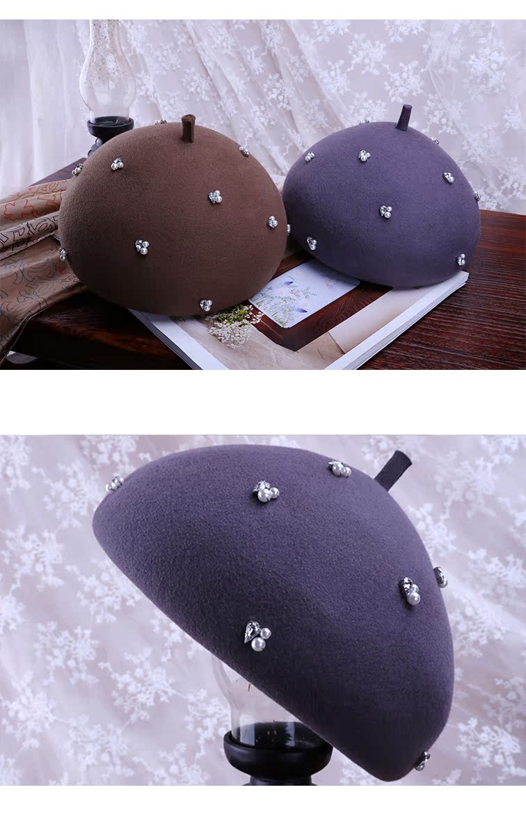 設計師款秋冬ins水鉆貝雷帽女精致清新純毛呢保暖百搭款蓓蕾帽1入