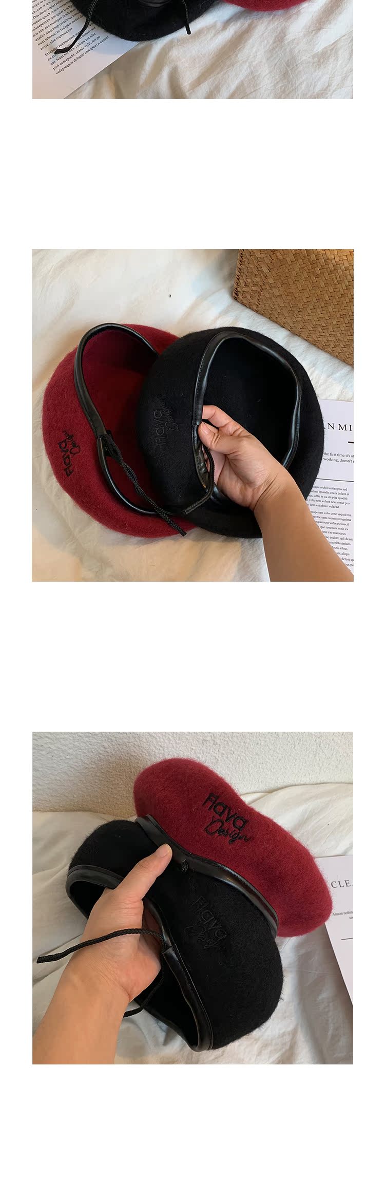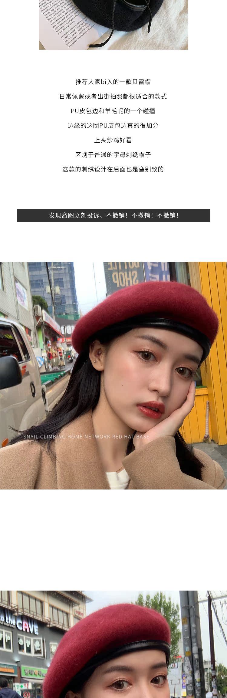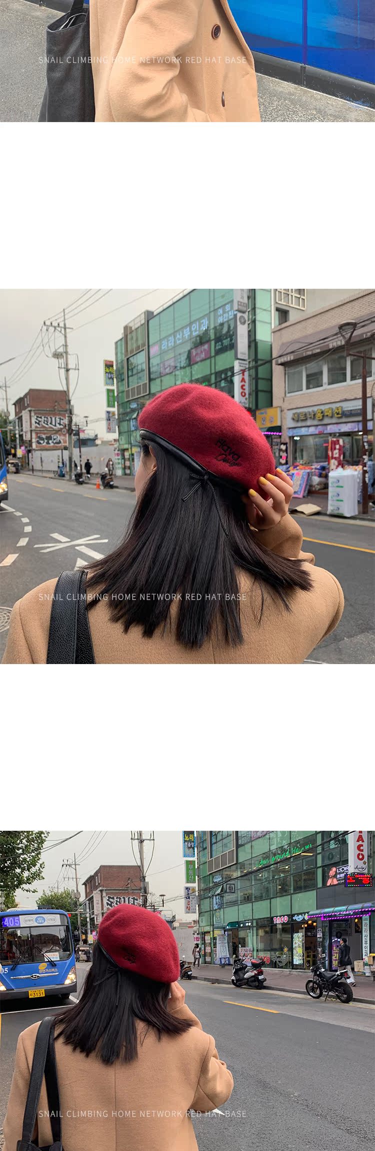 蝸牛爬爬家/羊毛呢貝雷帽子字母刺繡港風少女秋冬百搭文藝畫家帽1入