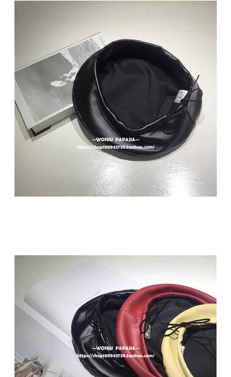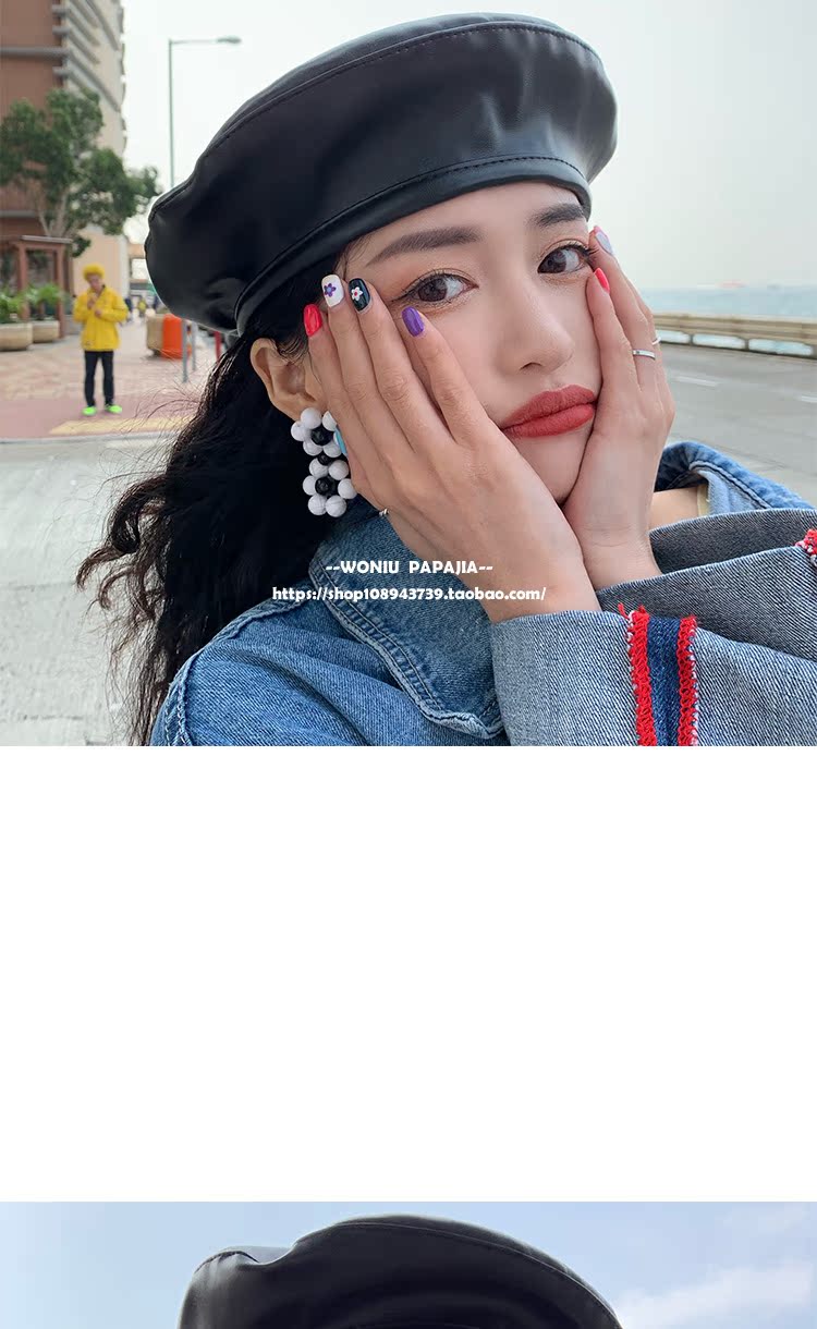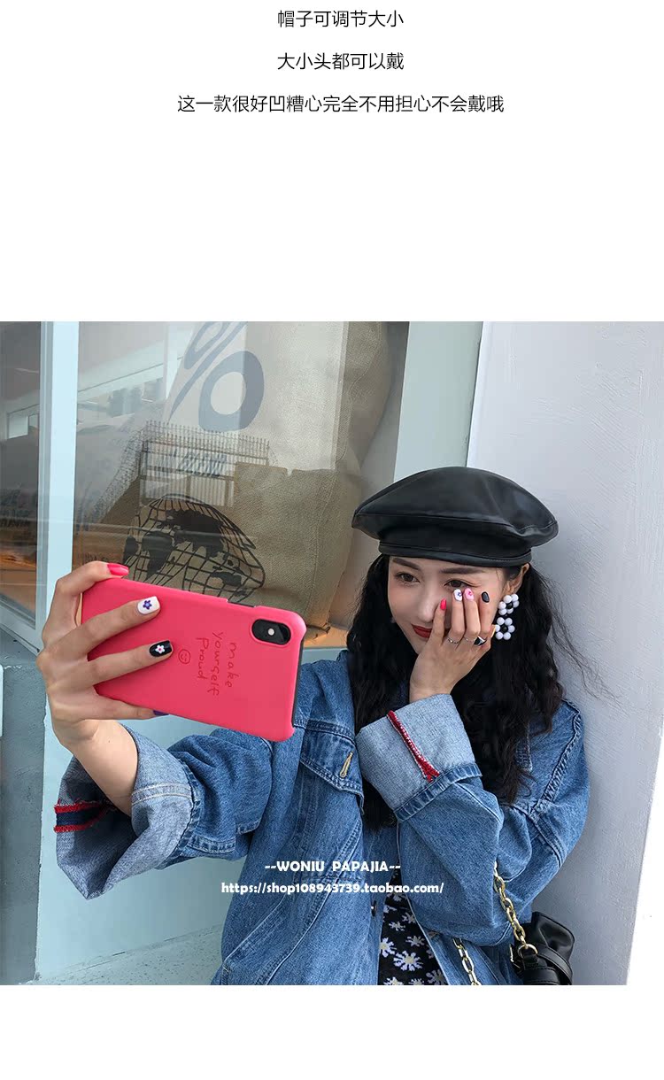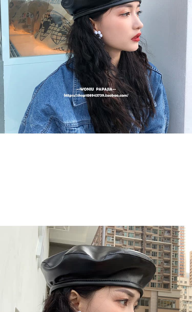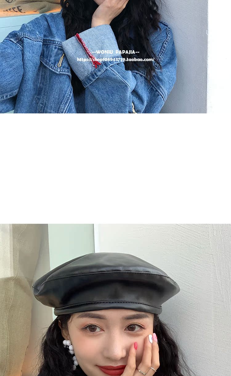 貝雷帽女英倫復古韓版百搭春秋天PU皮質畫家帽女生街頭黑色小皮帽1入