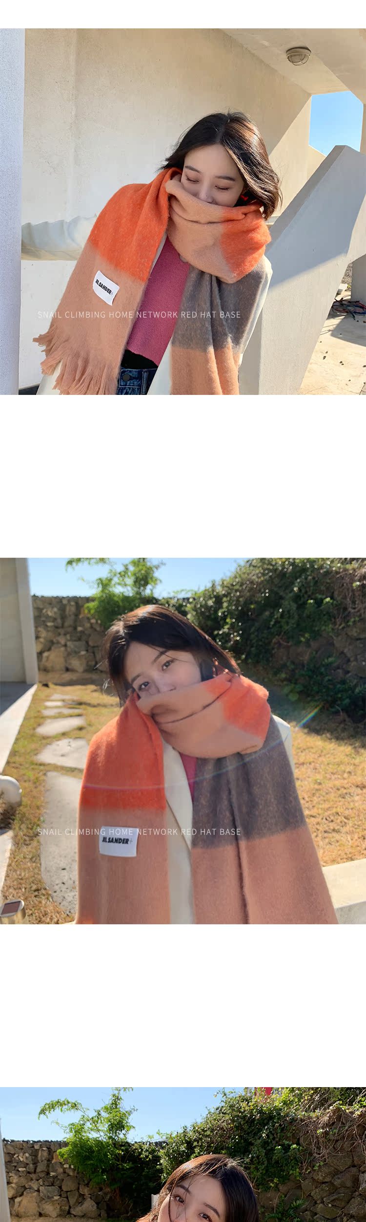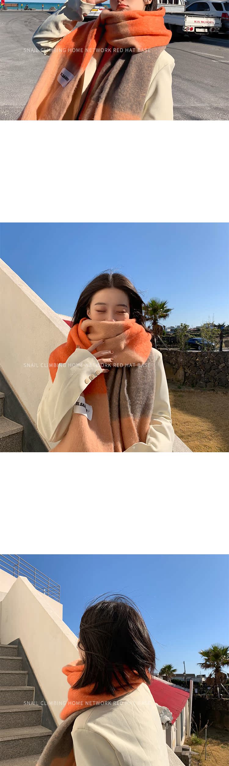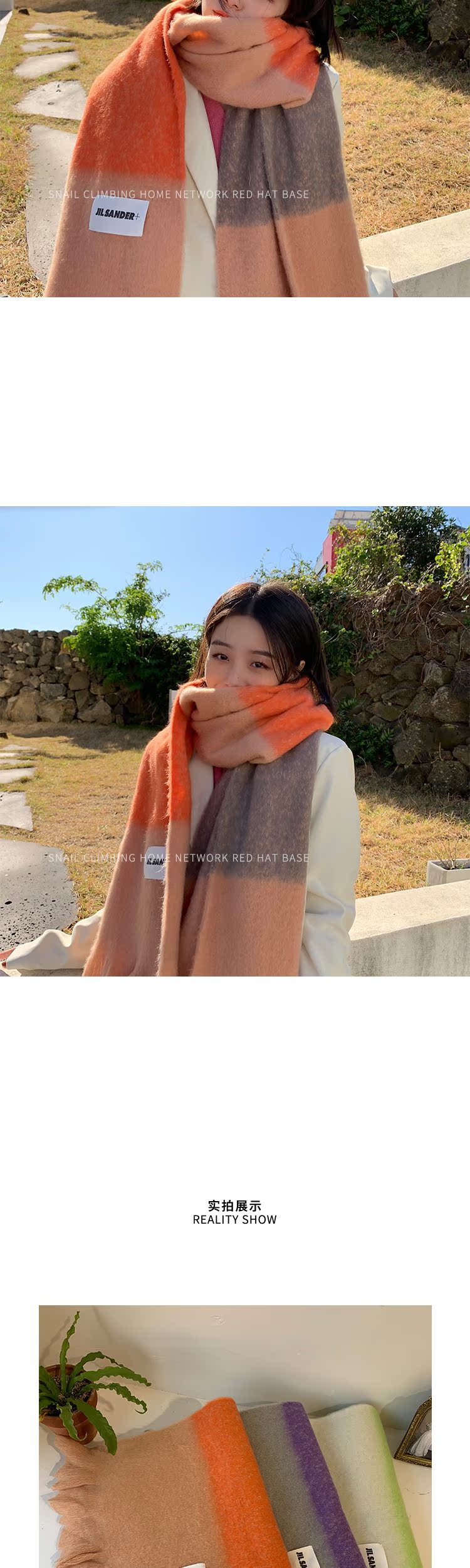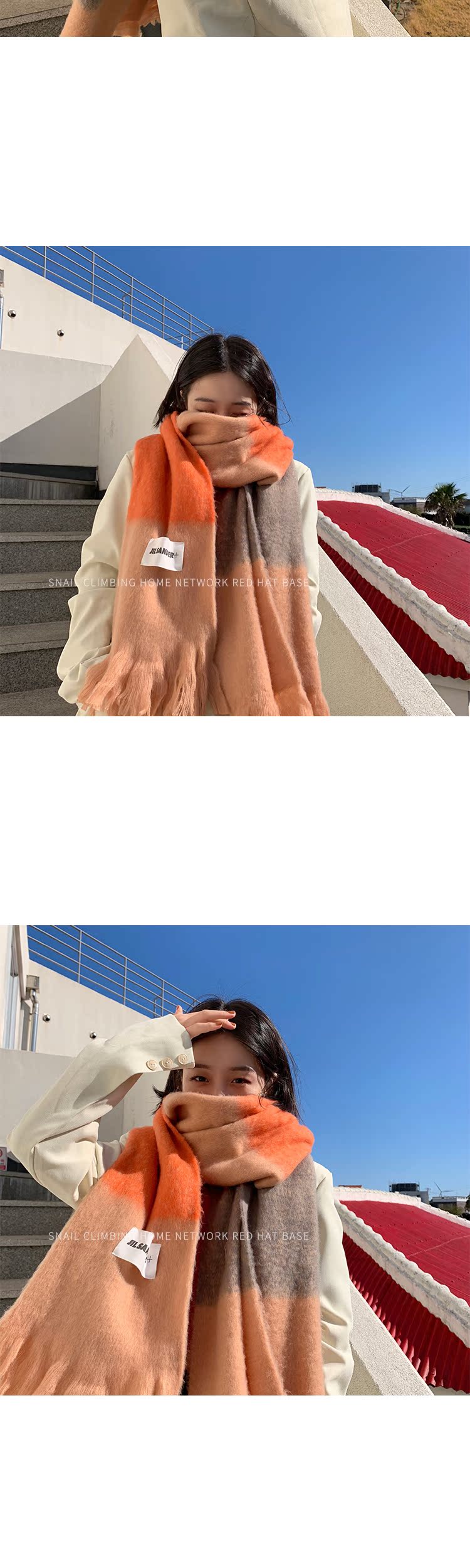 蝸牛爬爬家/網紅同款馬海毛拼色羊絨圍巾女冬季長款加厚保暖圍脖1入