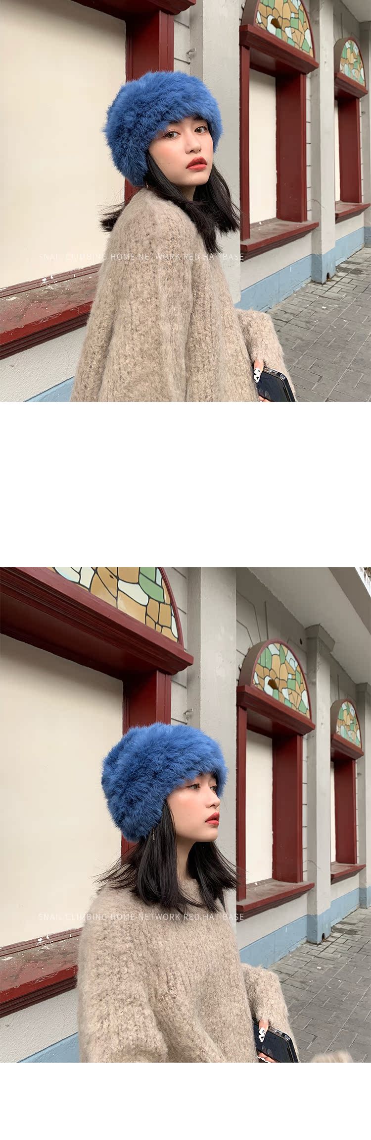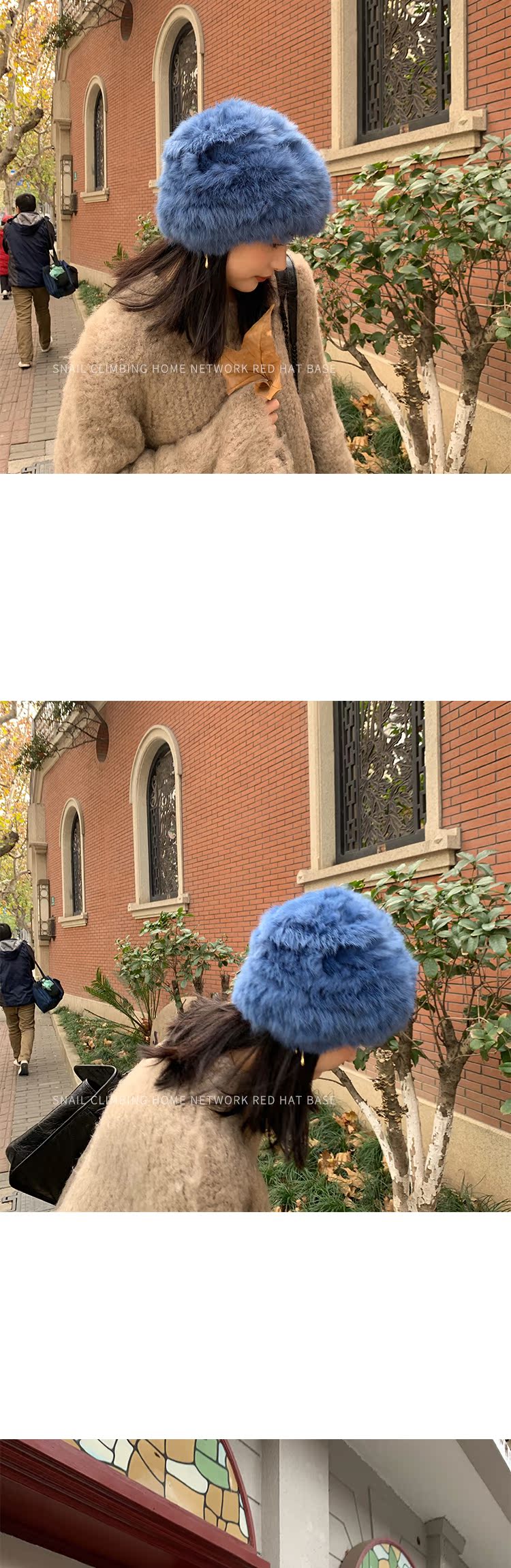 高級水墨藍色~真兔毛皮草帽秋冬保暖純手工編織網紅款純色針織帽1入