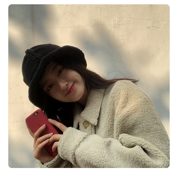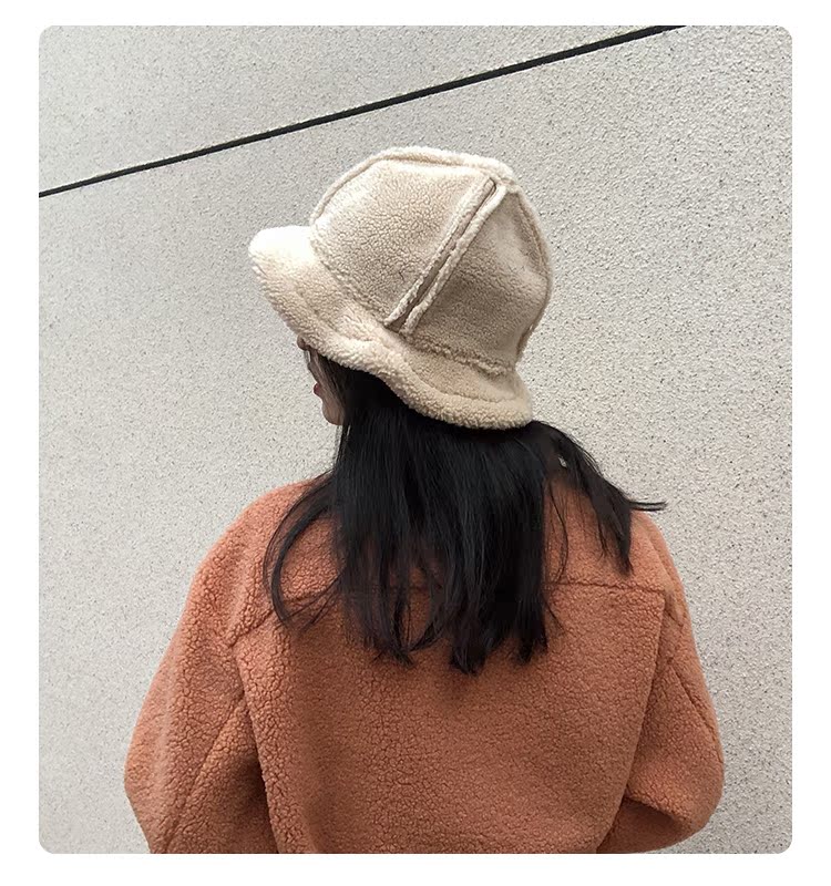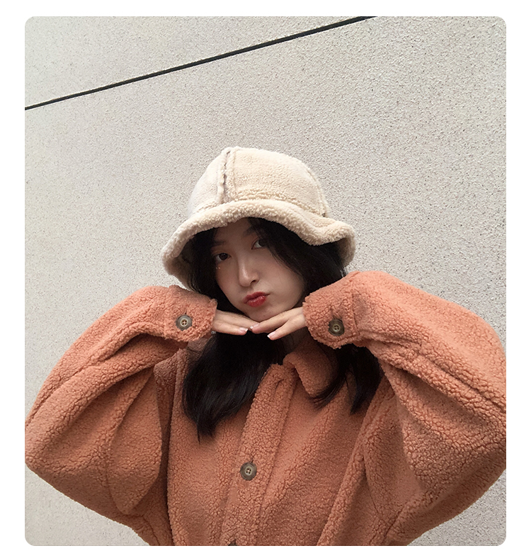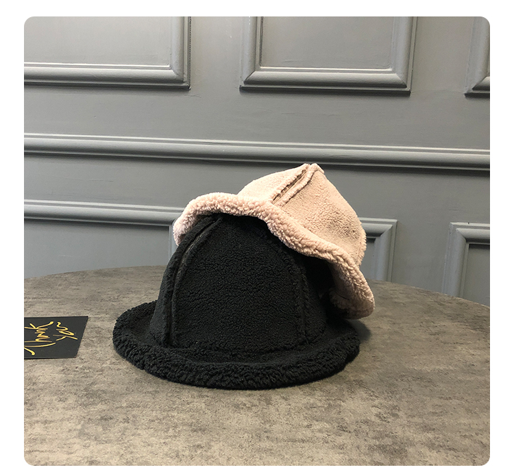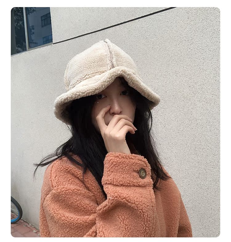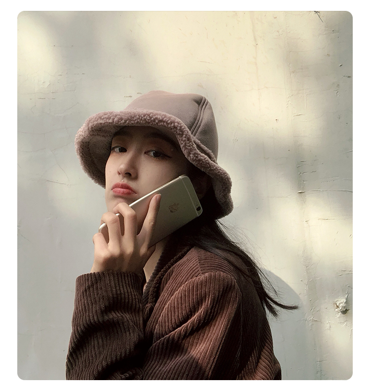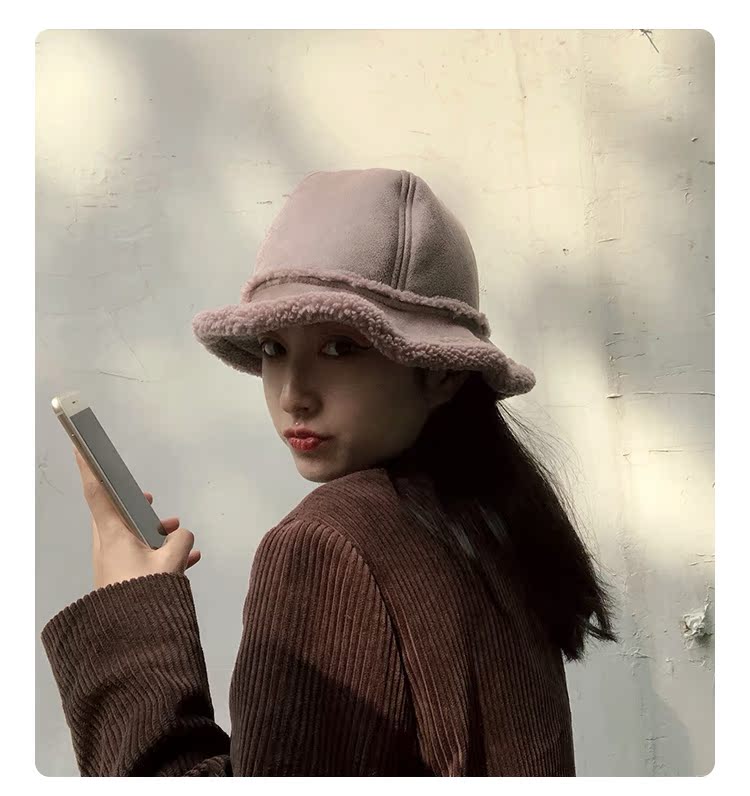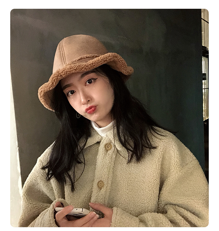 麂皮絨雙面漁夫帽子女日系韓版秋冬可愛軟妹仿羊羔毛卷邊冬季盆帽1入