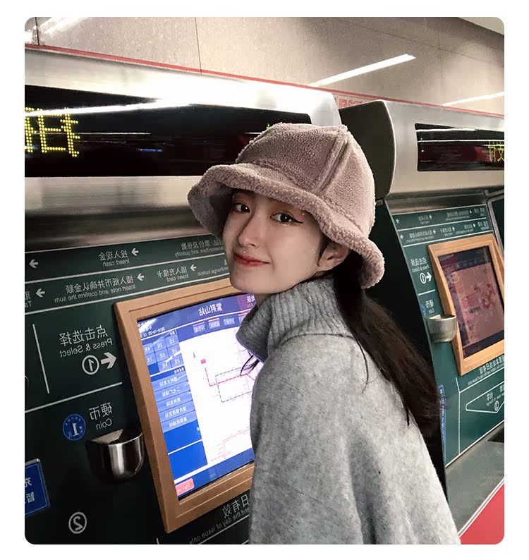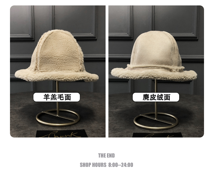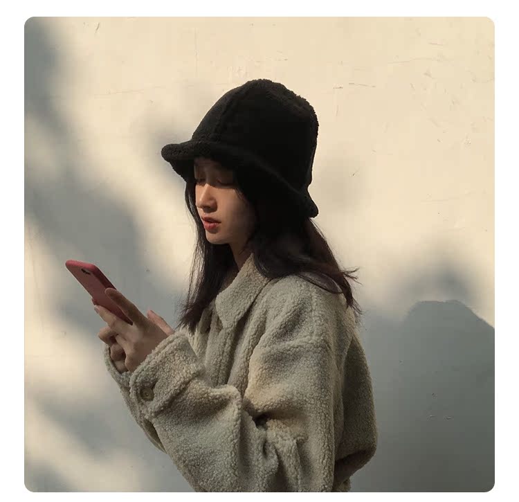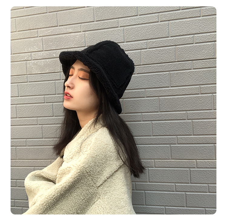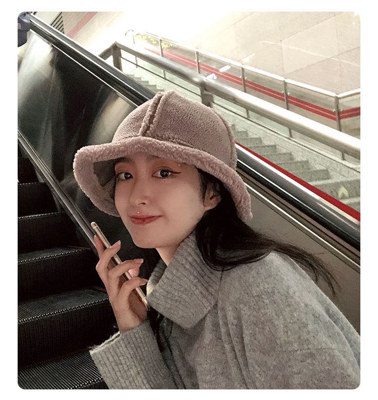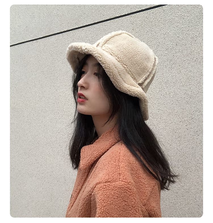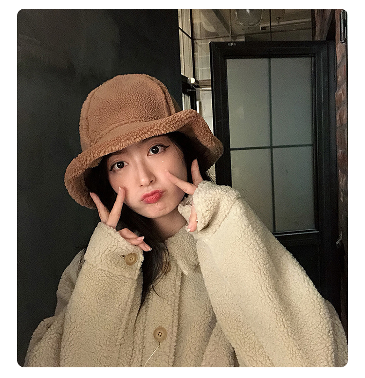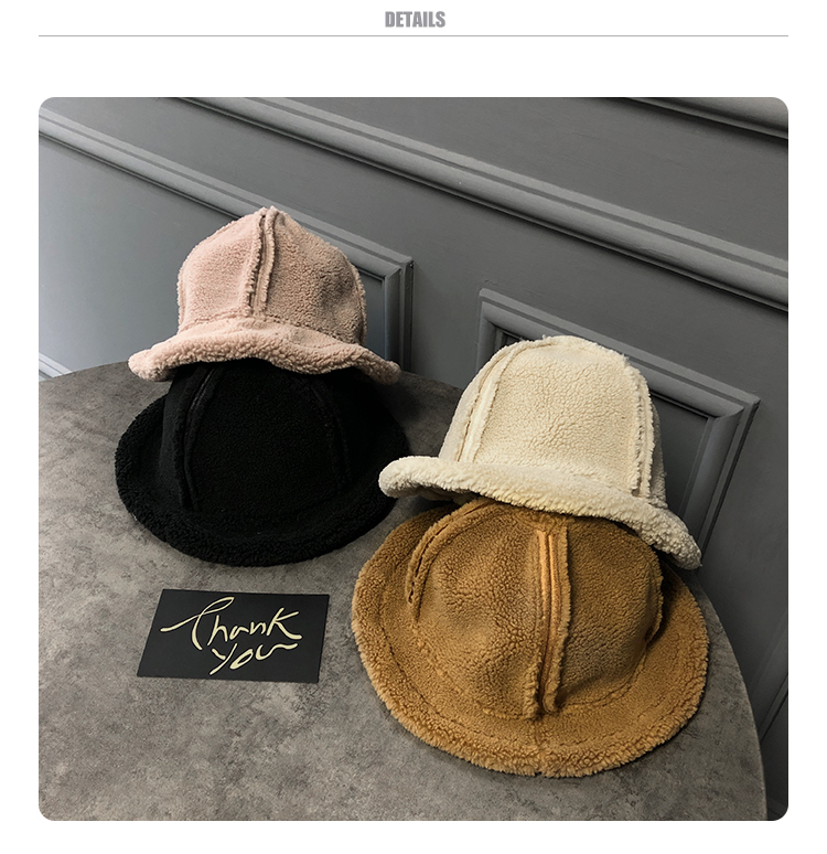 麂皮絨雙面漁夫帽子女日系韓版秋冬可愛軟妹仿羊羔毛卷邊冬季盆帽1入