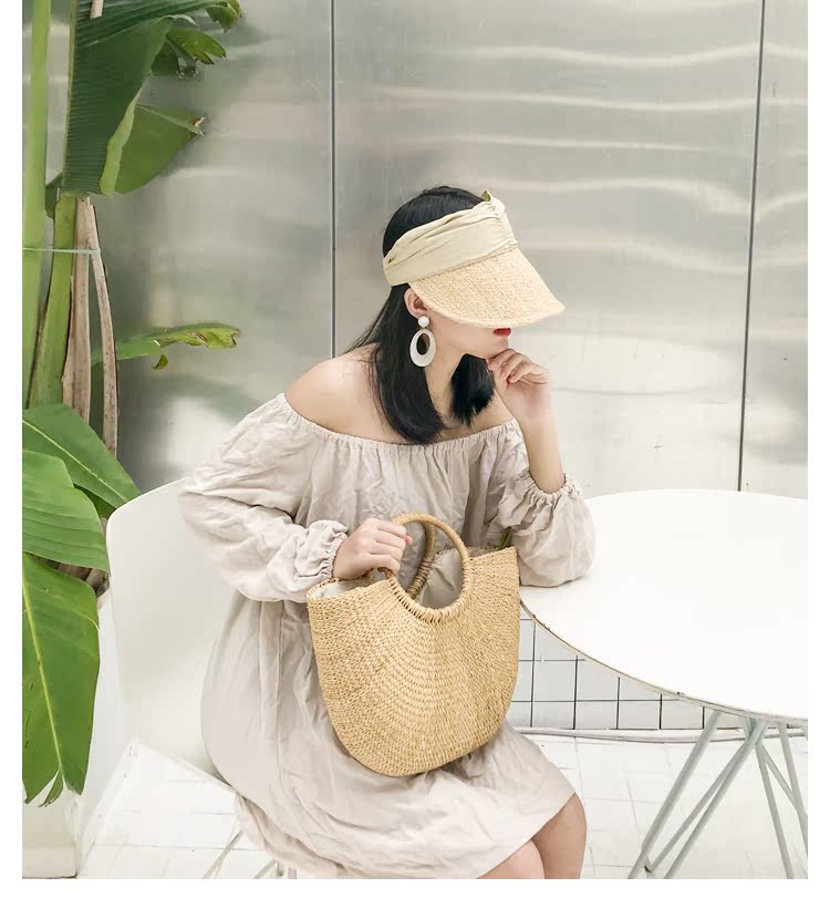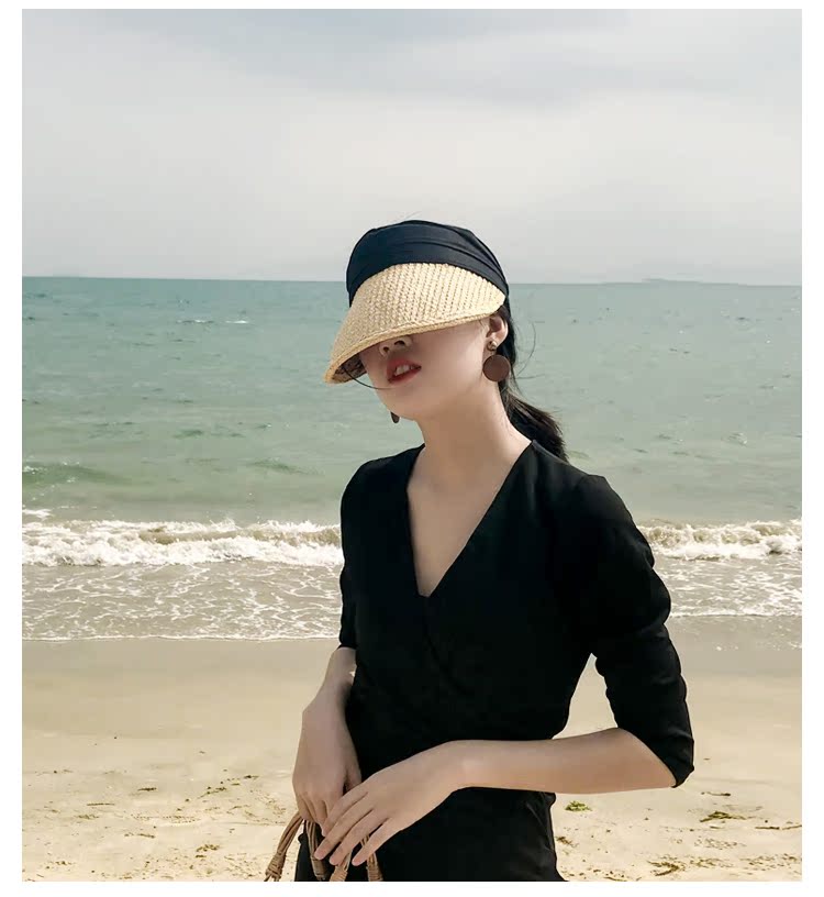 韓國ins褶皺空頂拉菲草帽女夏季透氣出游遮陽大檐無頂鴨舌太陽帽1入