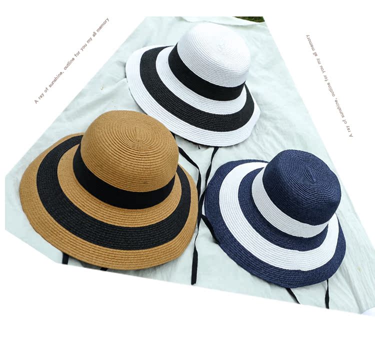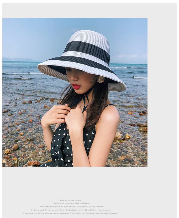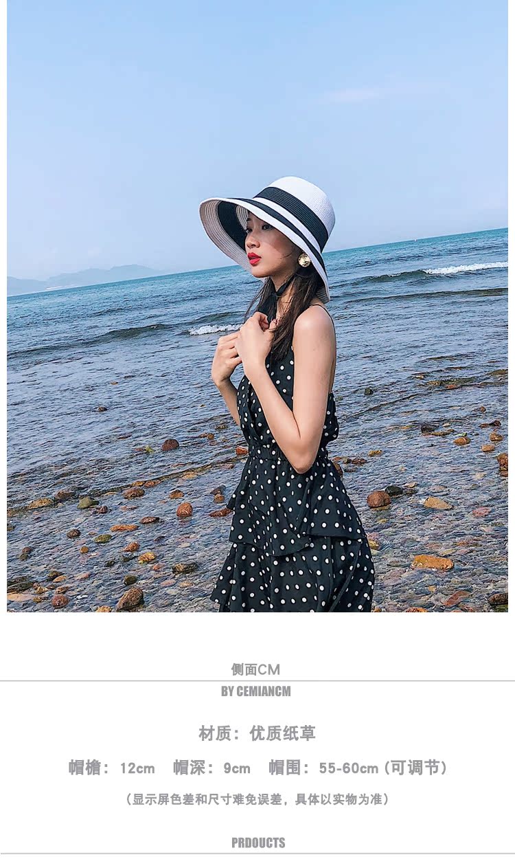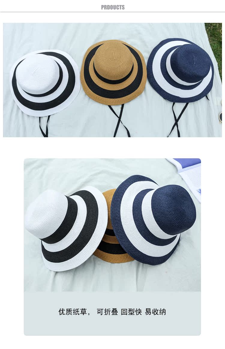 黑白條紋大沿紙草編織草帽女夏圓頂海邊百搭沙灘帽防曬遮陽太陽帽1入