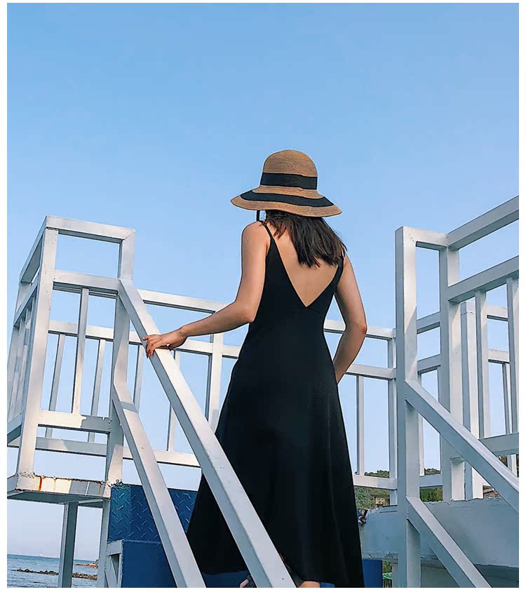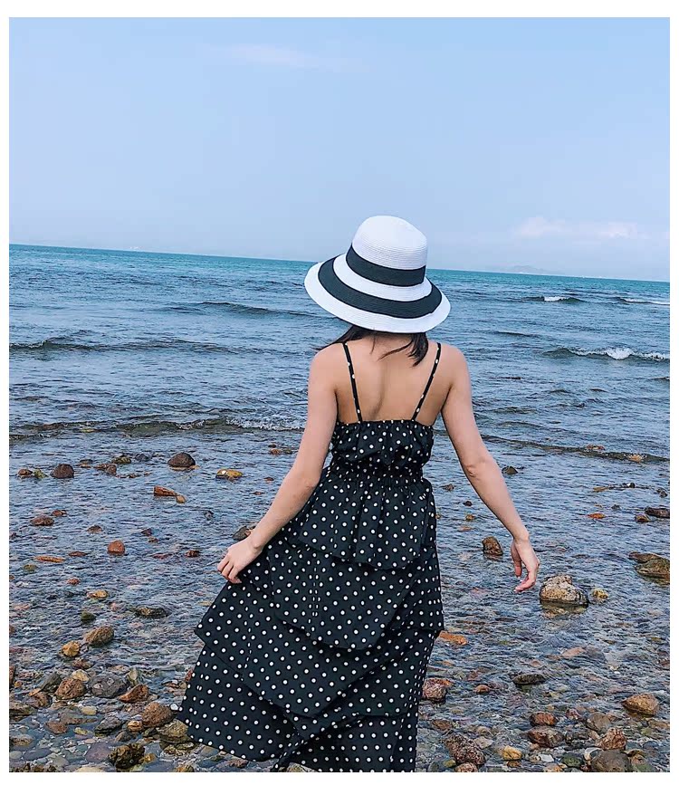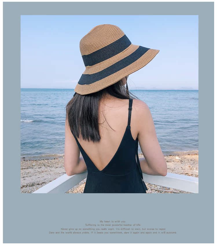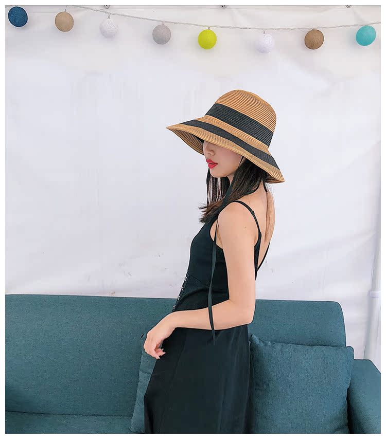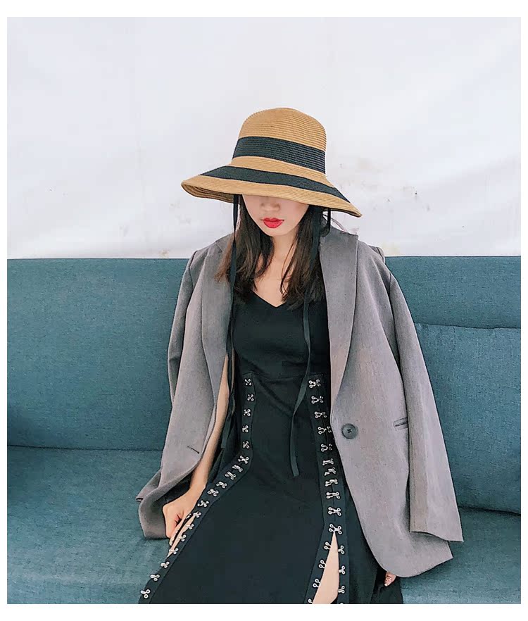 黑白條紋大沿紙草編織草帽女夏圓頂海邊百搭沙灘帽防曬遮陽太陽帽1入