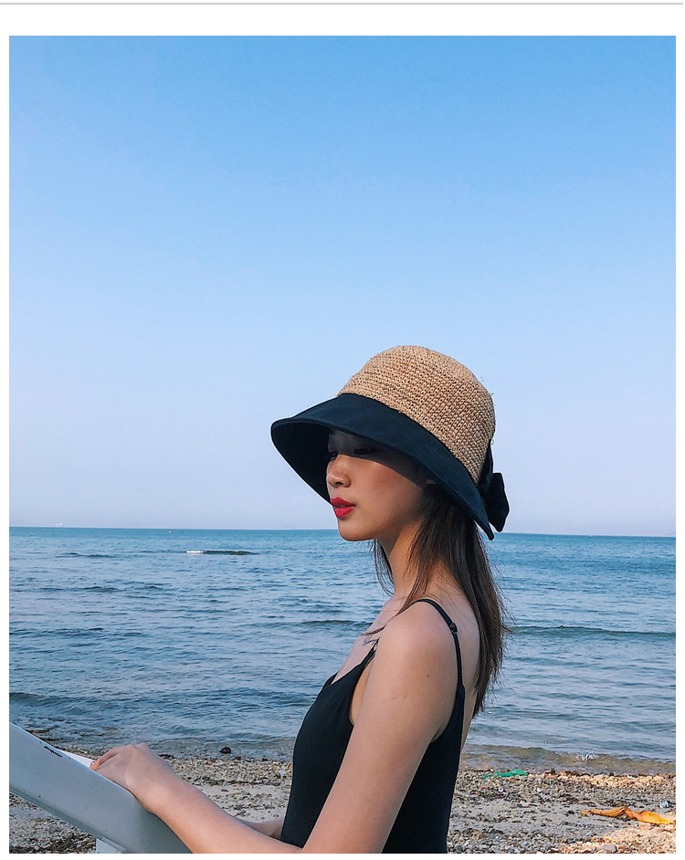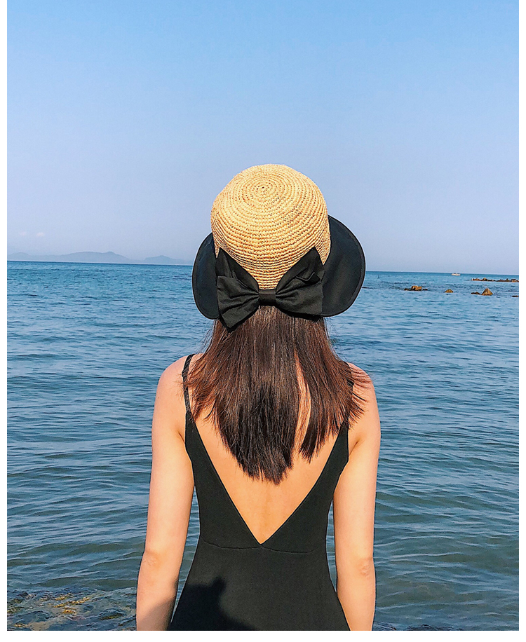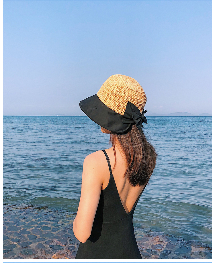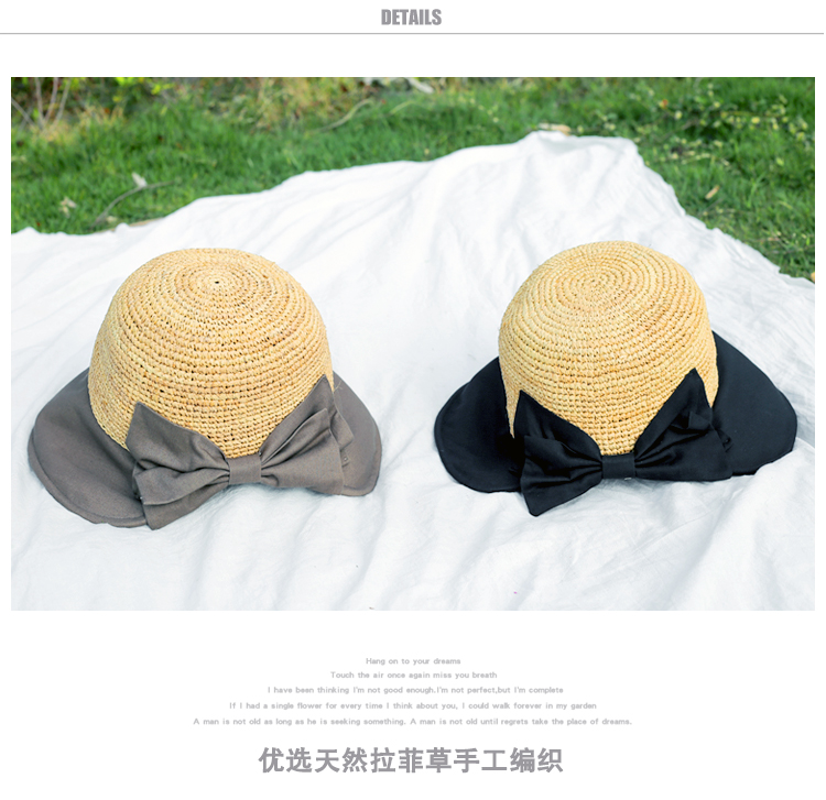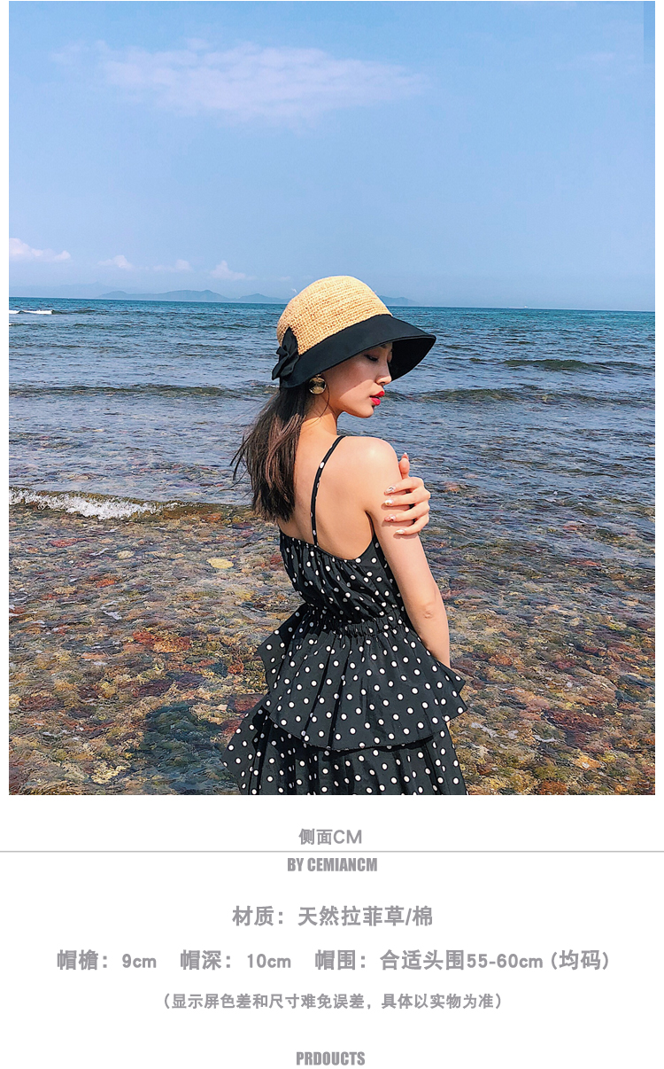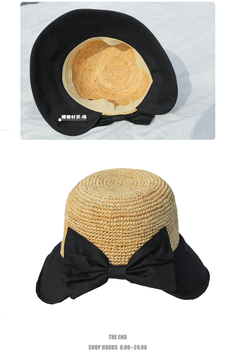 蝴蝶結拉菲草帽女夏韓版寬檐漁夫帽復古優雅防曬遮陽帽海邊沙灘帽1入