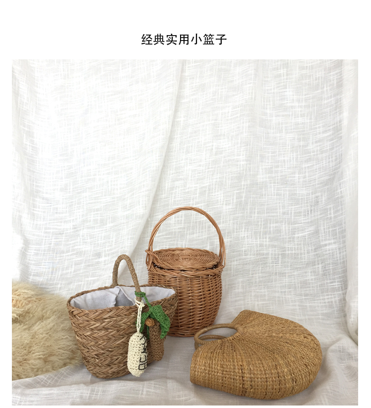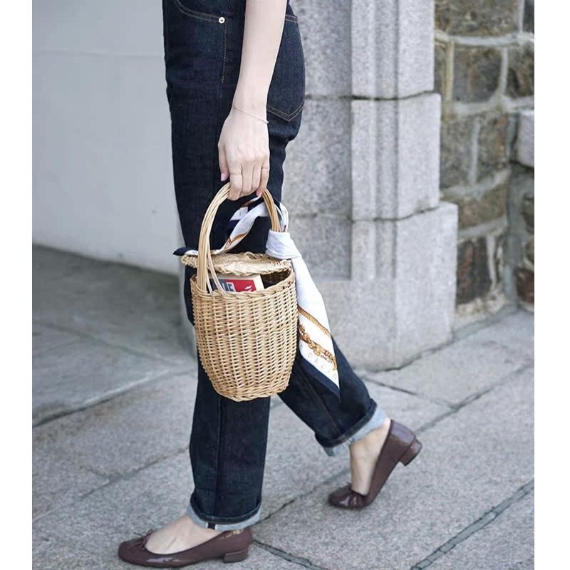 韓國ins同款水桶包夏季藤編草包復古風野餐包手提籃子度假草編包1入