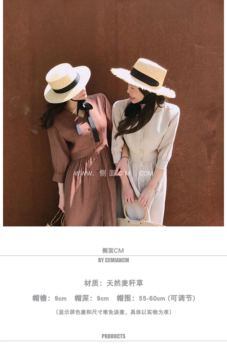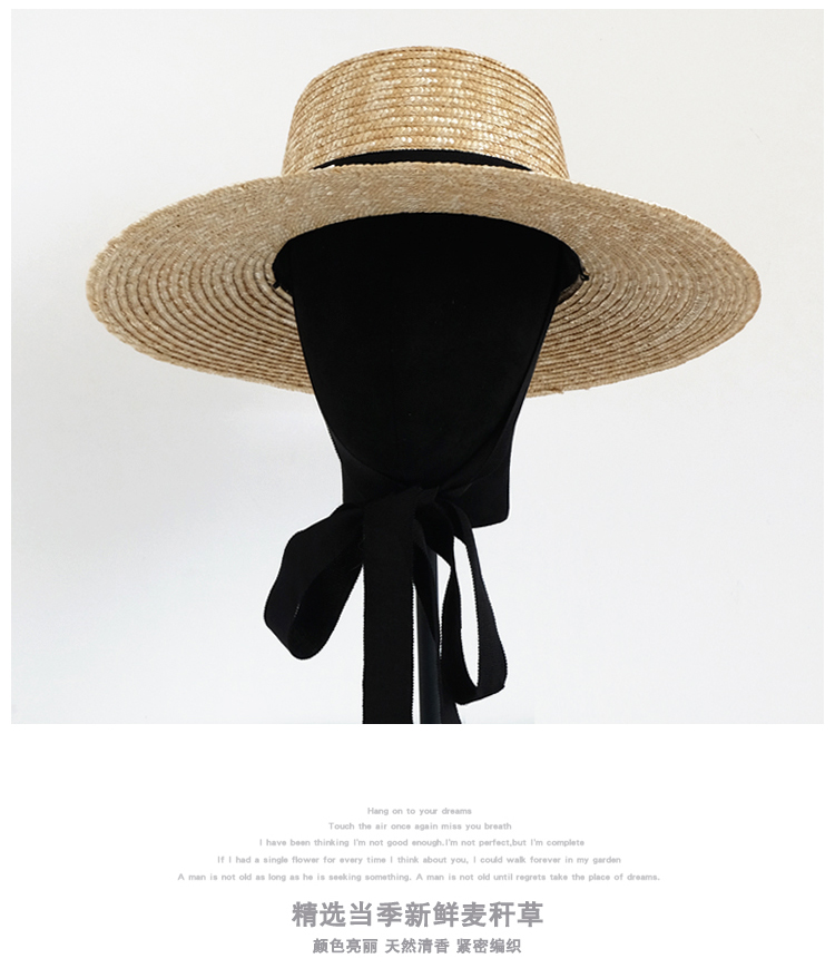 黑色蝴蝶結綁帶蘿莉草帽女夏小清新甜美可愛平頂遮陽防曬帽太陽帽1入