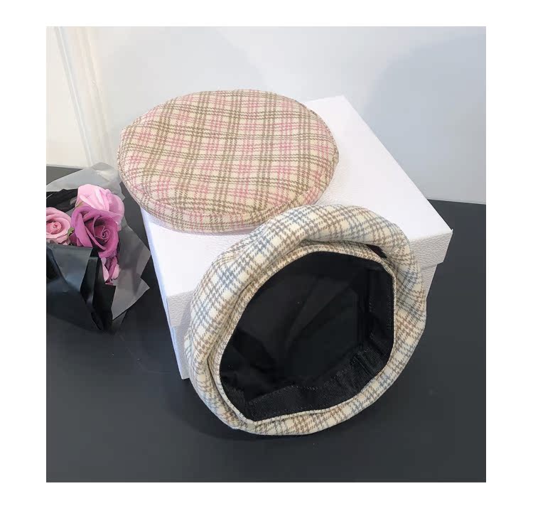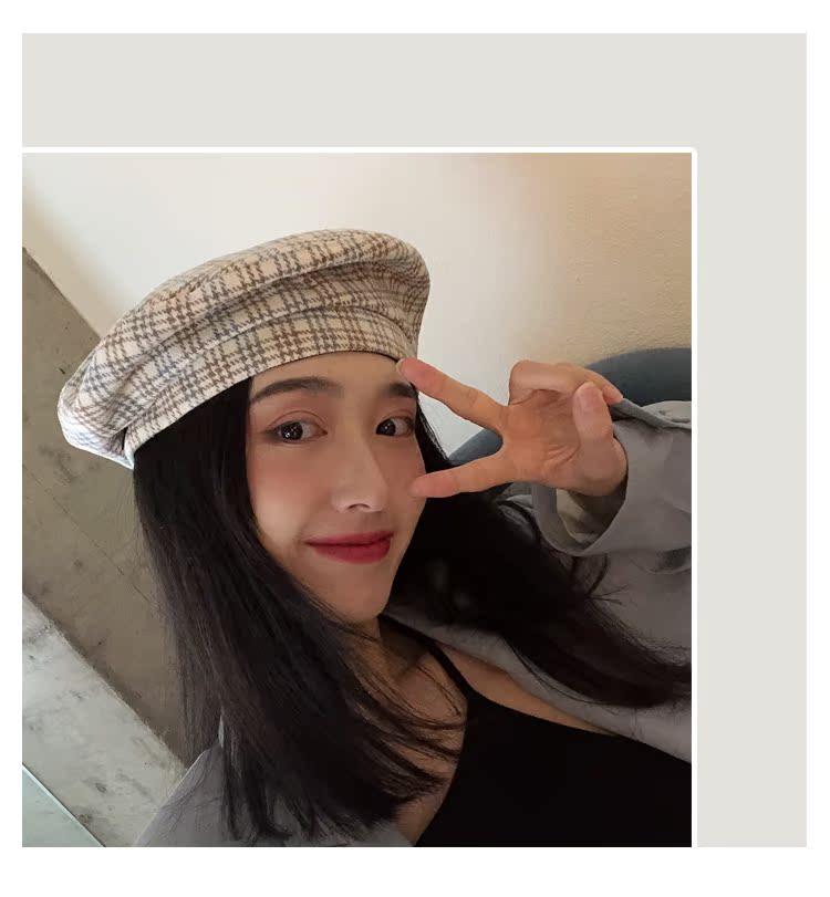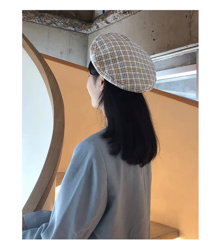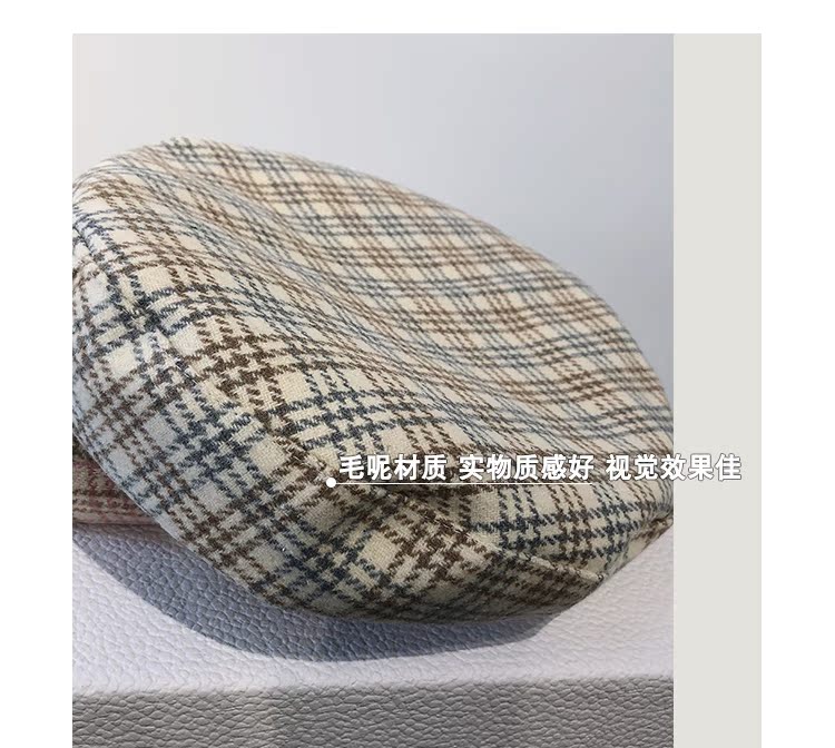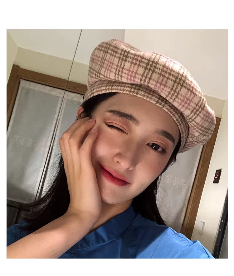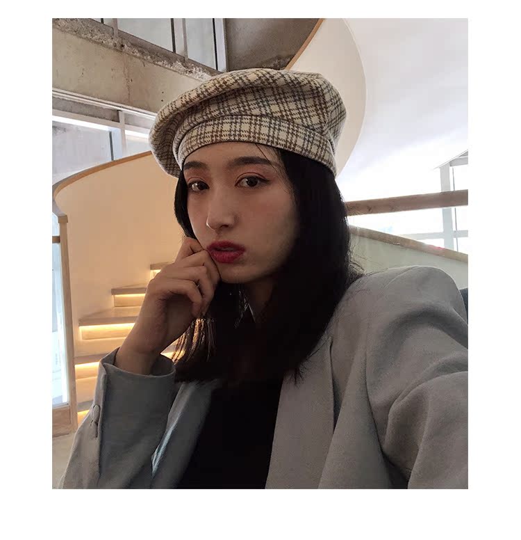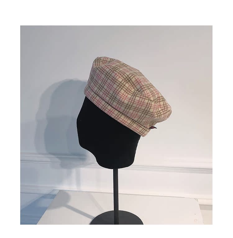 貝雷帽女秋冬新款韓版復古格子畫家帽韓版日系百搭八角帽毛呢帽子1入