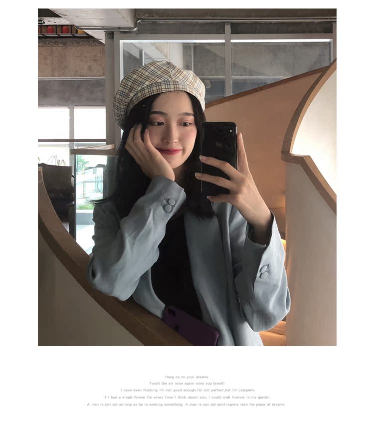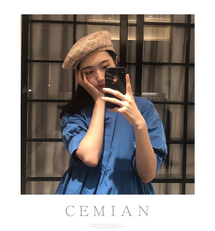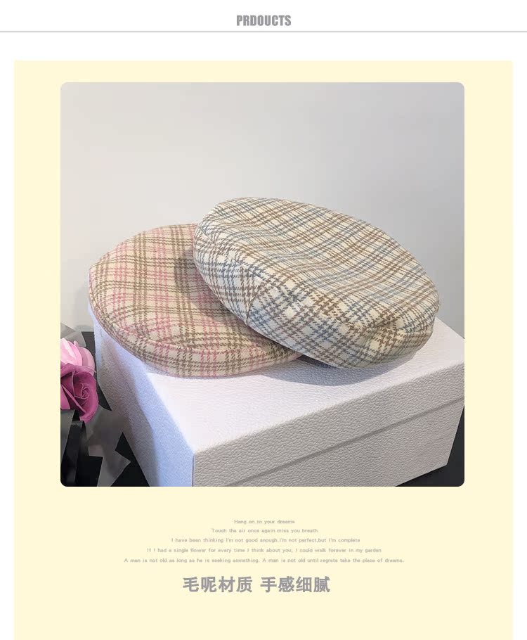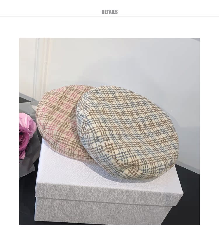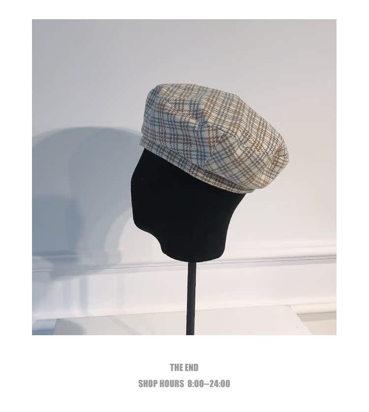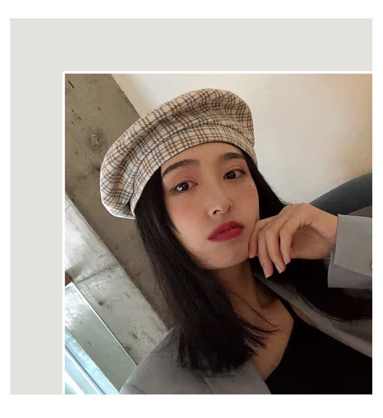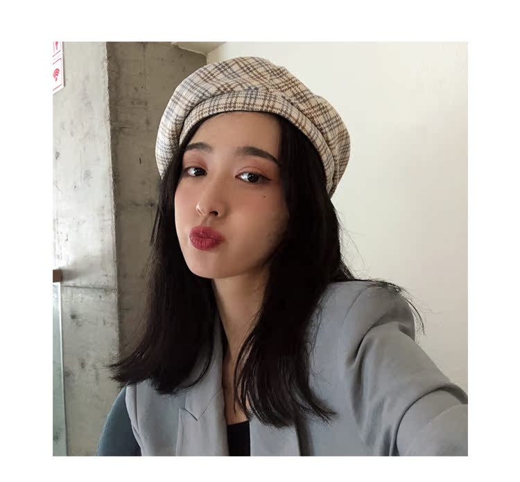貝雷帽女秋冬新款韓版復古格子畫家帽韓版日系百搭八角帽毛呢帽子1入