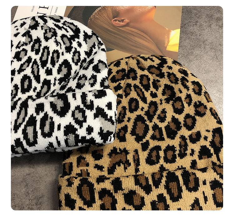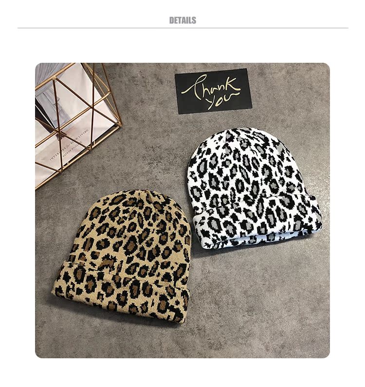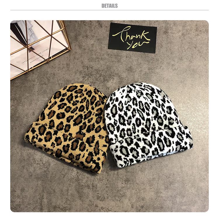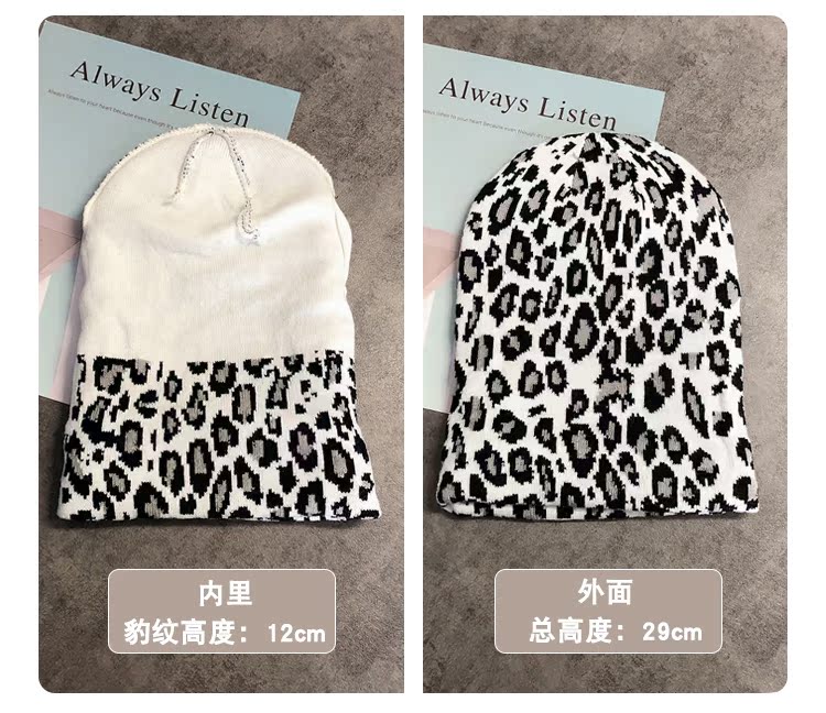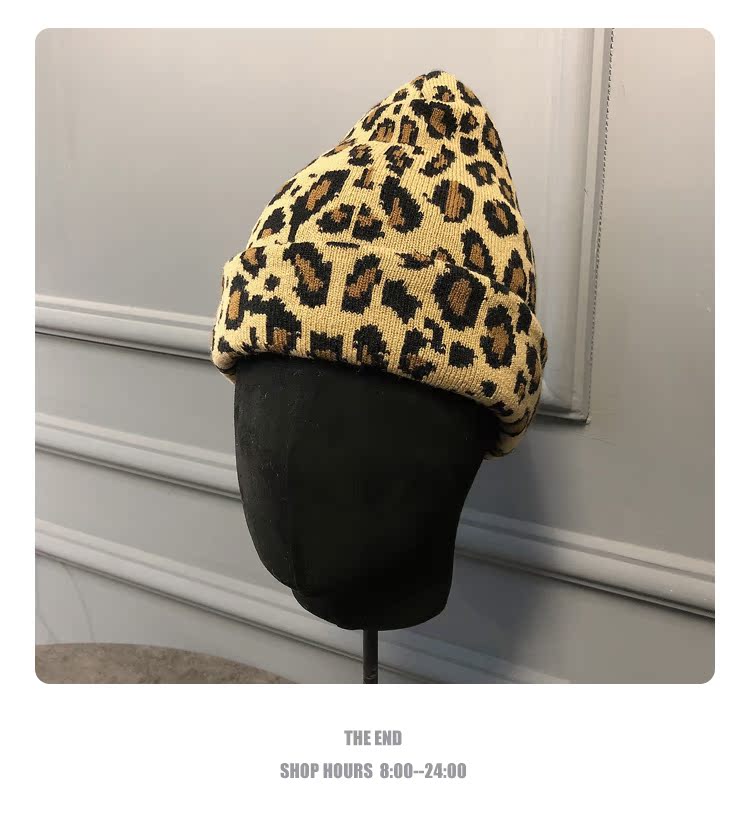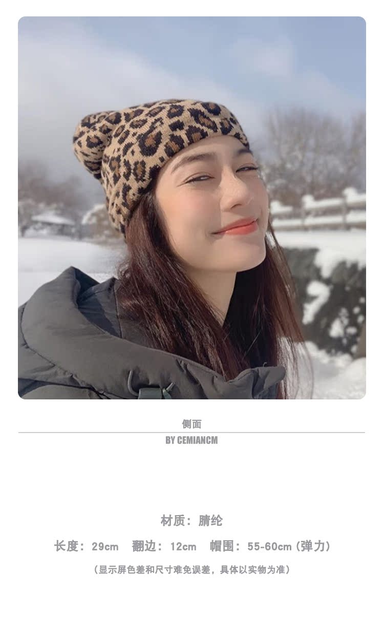 豹紋毛線帽女冬潮韓國加厚保暖套頭帽秋冬日系翻邊冷帽針織帽ins1入