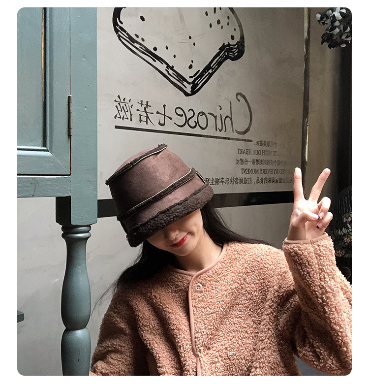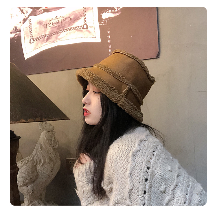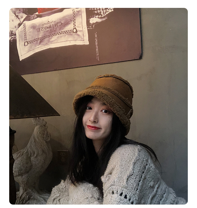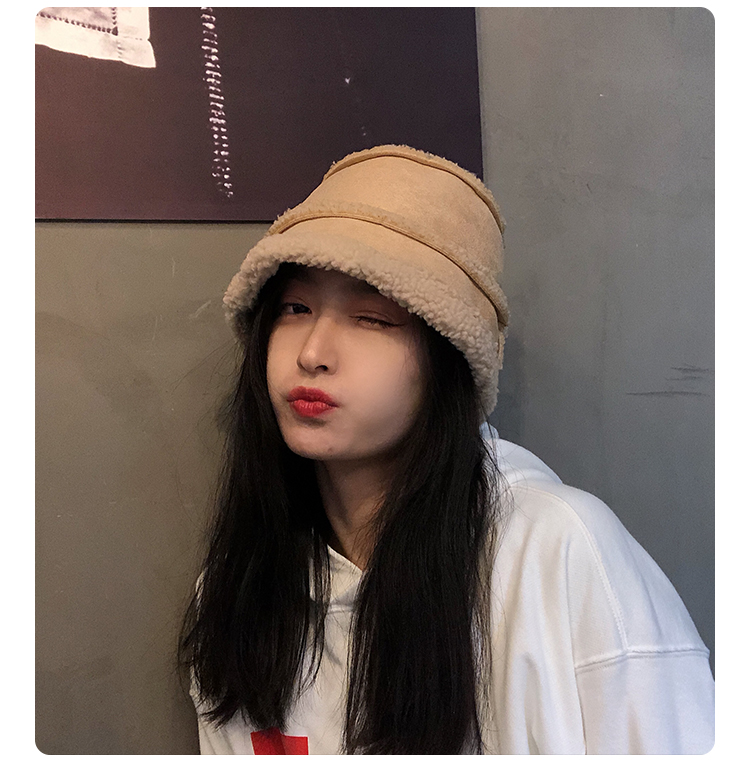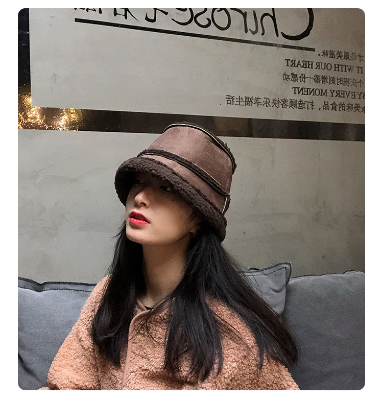 麂皮絨網紅漁夫帽女秋冬新款韓版百搭日系冬季保暖水桶帽毛絨盆帽1入