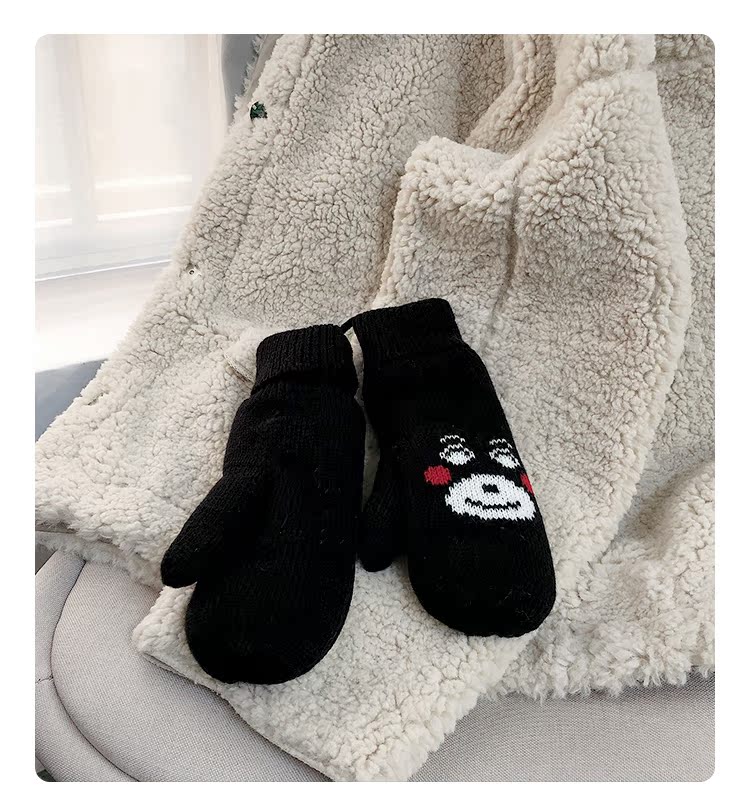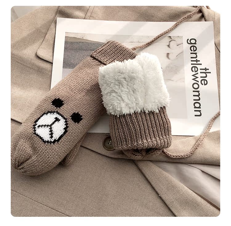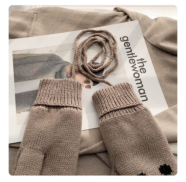 針織手套女冬可愛ins加絨保暖防寒學生韓版卡通掛脖連指毛線手套1入