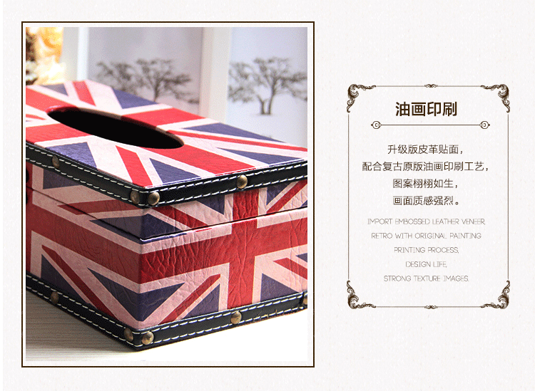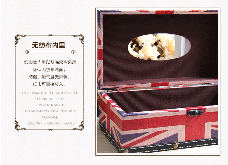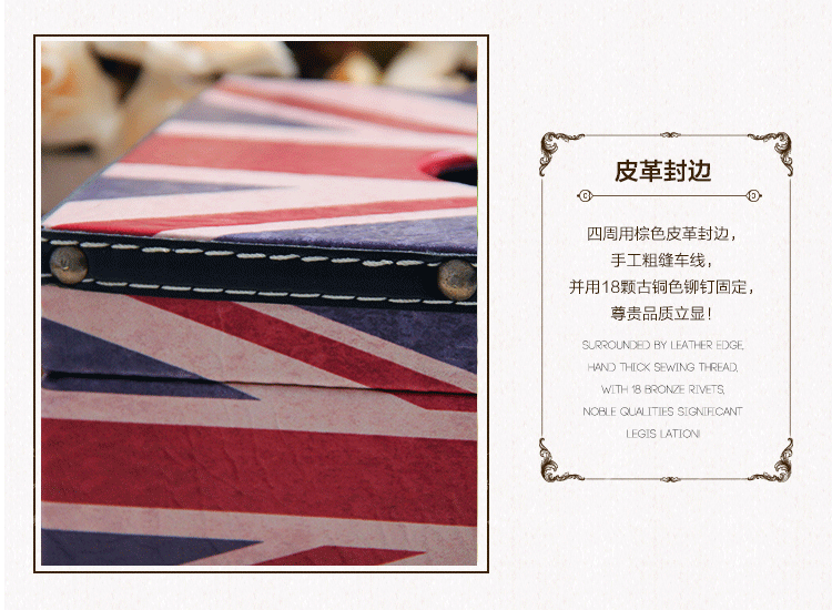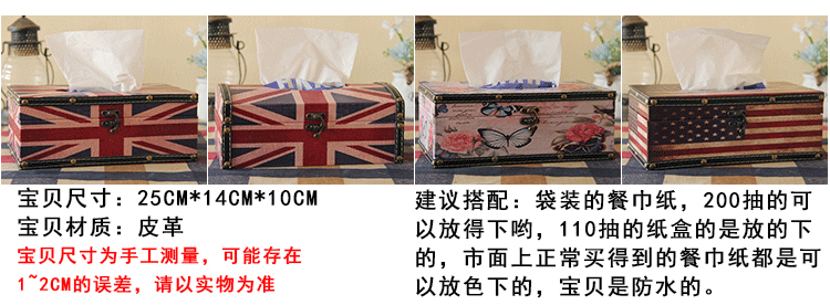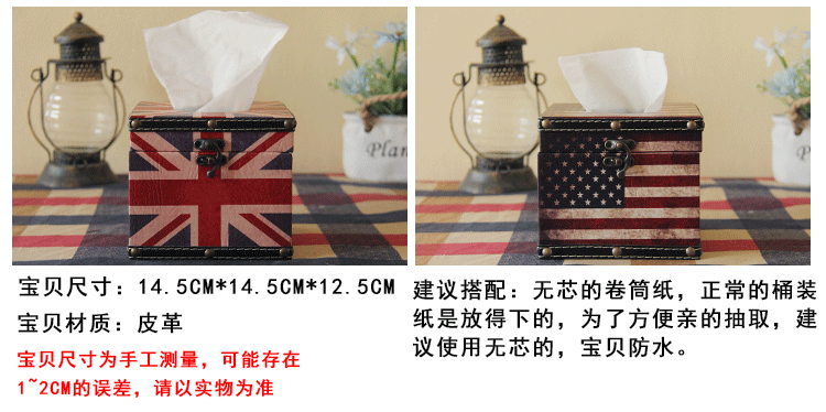 材質:木盒身 表面皮革貼紙 做舊銅質扣環 鉚釘 粗縫車線 。 做工:盒身無縫銜接技術,皮革貼紙表面貼覆盒身整體。邊緣處半手工車縫線設計,鉚釘固定。內部混合PVC覆蓋。 響應廣大可可粉的需求,甜美家防水皮革紙巾盒隆重登場啦! 沿襲經典復古做舊風格 集時尚大方、裝飾性、實用性、耐用性、于一體的防水皮革魅力紙巾盒!你,值得擁有! 關于純手工刻意做舊:本款紙巾盒的劃痕、摩擦痕跡、斑點、凹凸等, 是為了迎合產品整體風格而故意制作上去的,并非舊貨磨損, 商品圖片實拍!異域風情,炙手可得! 為了讓親們更好的看出寶貝的大小和尺寸,我們選用了親們平時最常見的餐巾紙來進行對比,親們可以根據圖片來選擇適合你們的寶貝,實拍,親們請放心。 這都是甜美家的親們真實拍攝的喲,漂亮的很,希望親們會稀飯哦。