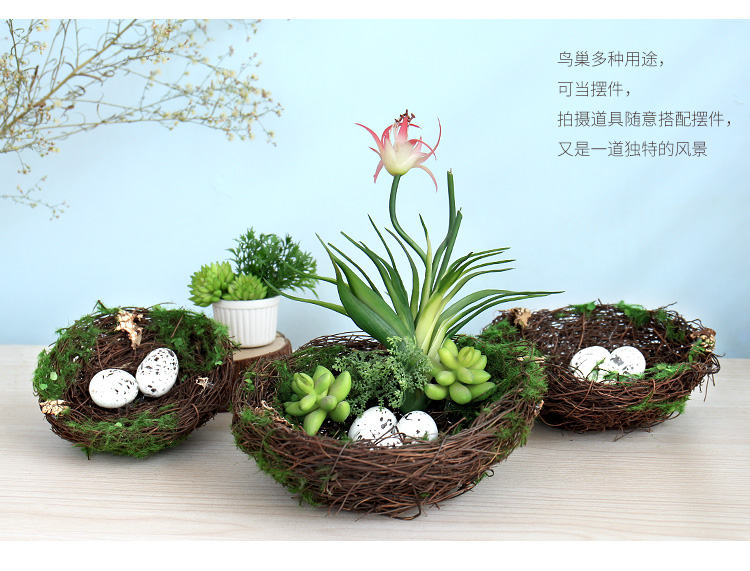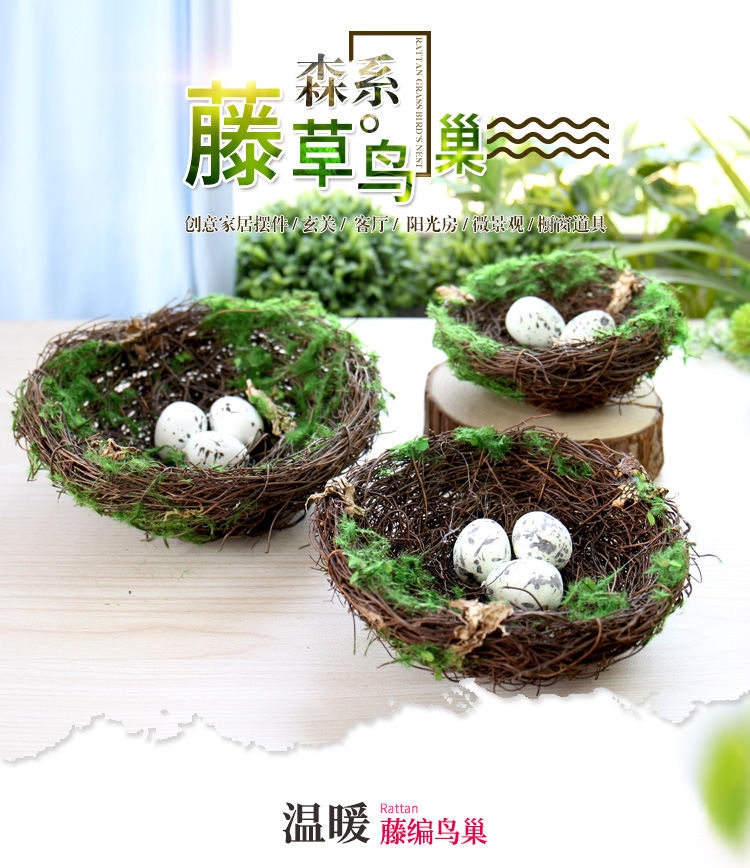 泡沫注模成型,噴涂斑點仿真鳥蛋。在親們收到貨時,掉幾根藤草;或是在嚴密包裝運輸中受到擠壓而產成變形,