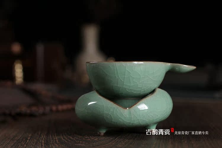【產品名稱】:哥窯梅子青*茶漏茶托組合 【規 格】:花瓣: 直徑 8.2厘米 高 4 厘米 茶漏:高 3.5 厘米 寬 7.5厘米 【產 地】:龍泉 【包 裝】:防震包裝 【工 藝】:哥窯開片 釉片開片的黑胎青瓷稱“哥窯”,哥窯青瓷以瑰麗、古樸,的紋處片為裝飾手段,例如冰裂紋、蟹爪紋、牛毛紋、流水紋、魚子紋、?血紋、百極碎等,其釉層胞滿、晶瑩。因其泥土上含大量鐵元素,燒成后呈“紫口鐵足”。與釉面開片紋飾相映,更顯古樸典雅,乃青瓷之上品。