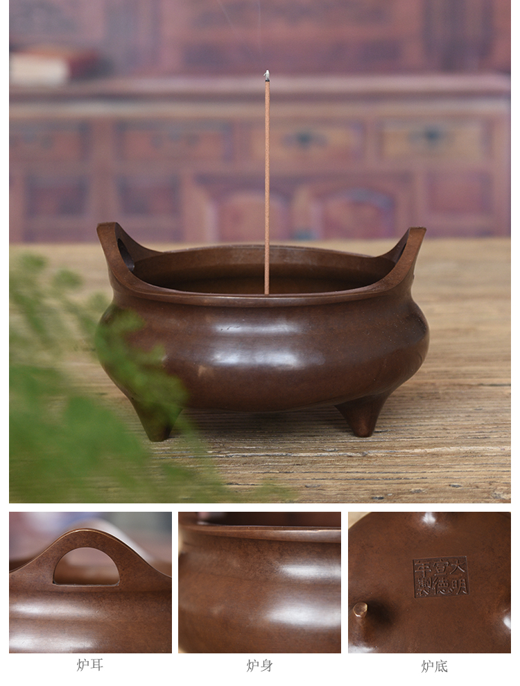 雙耳香爐家用室內香座黃銅復古純銅仿古小號三足迷你線香插供奉佛1入