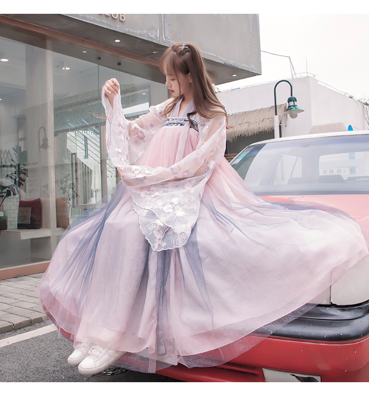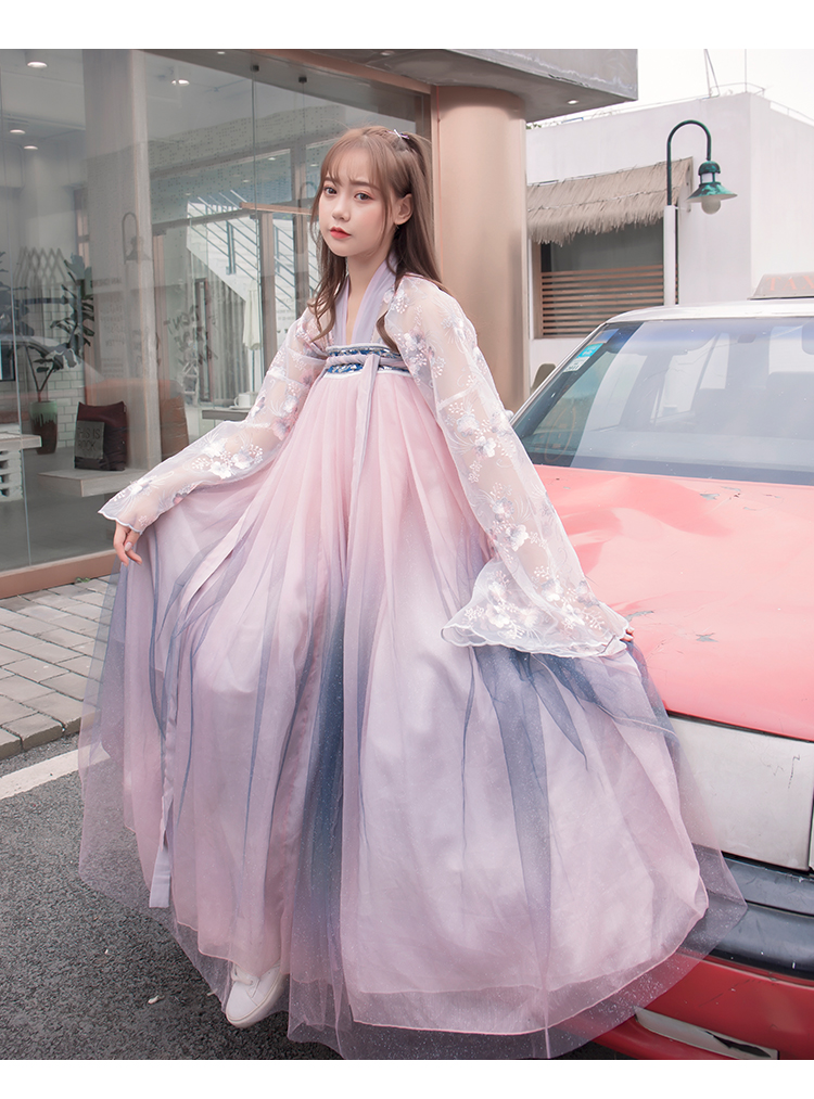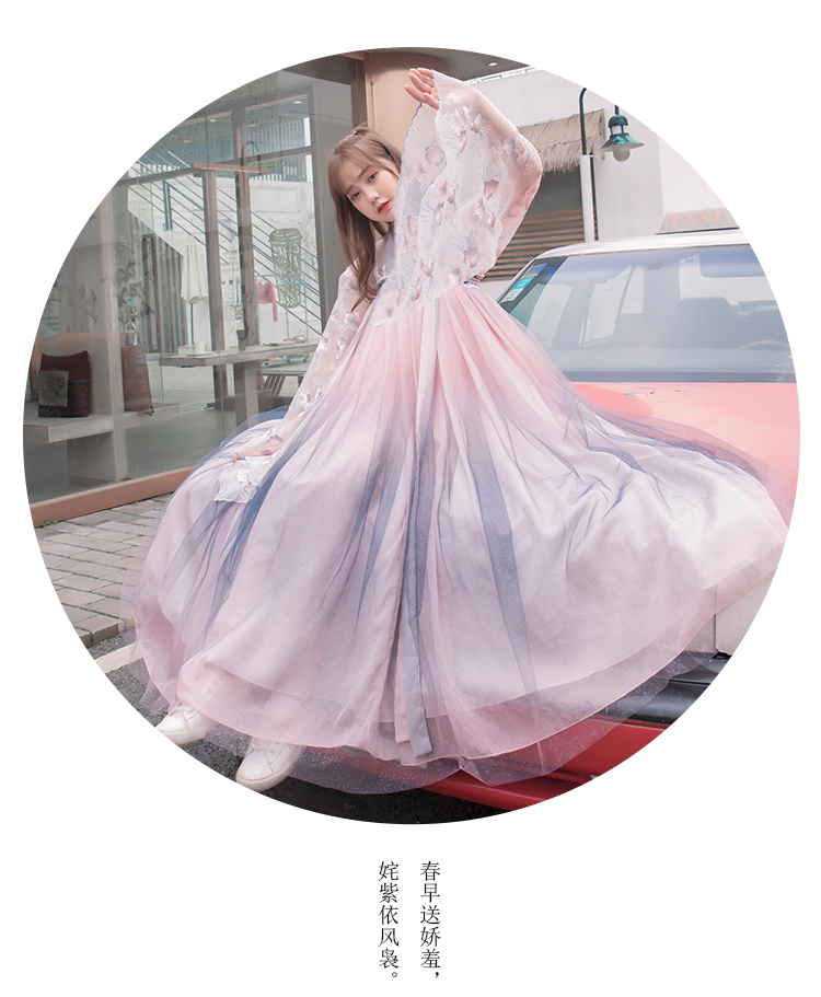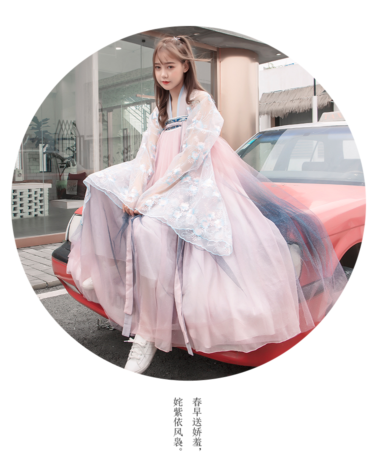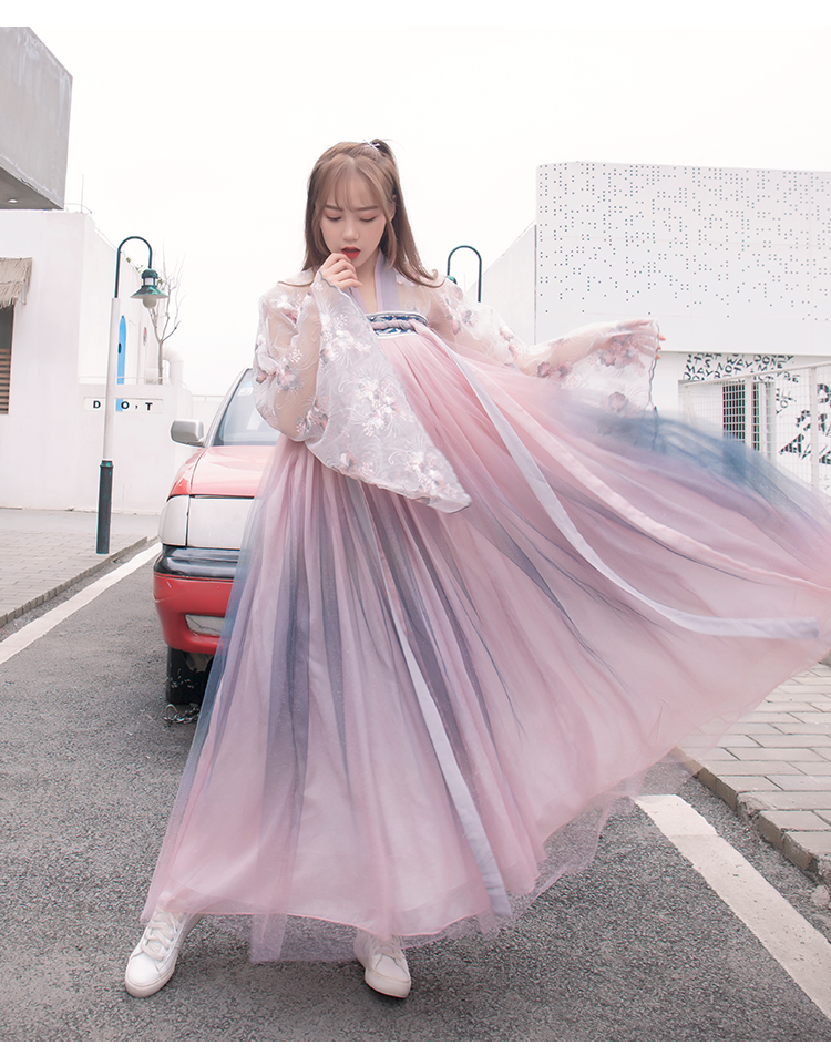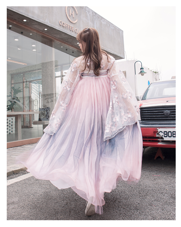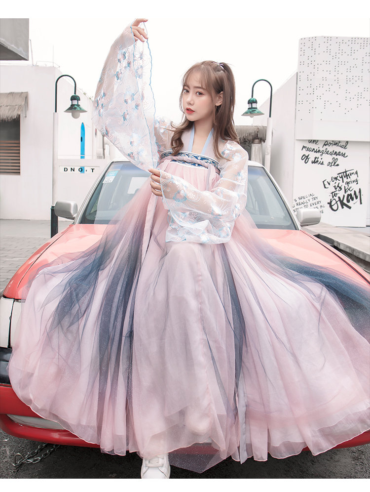[2]網紅改良漢服刺繡花背心上襦6米大擺漸變齊腰裙魏晉風大袖衫套裝1入