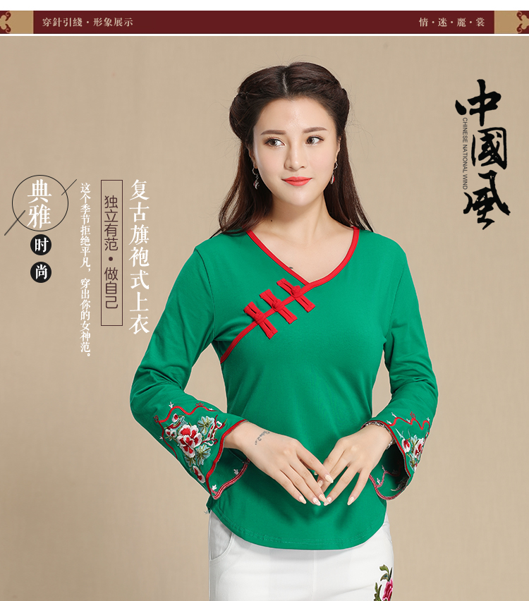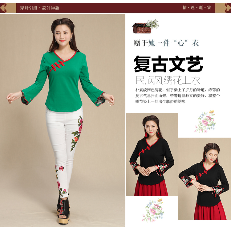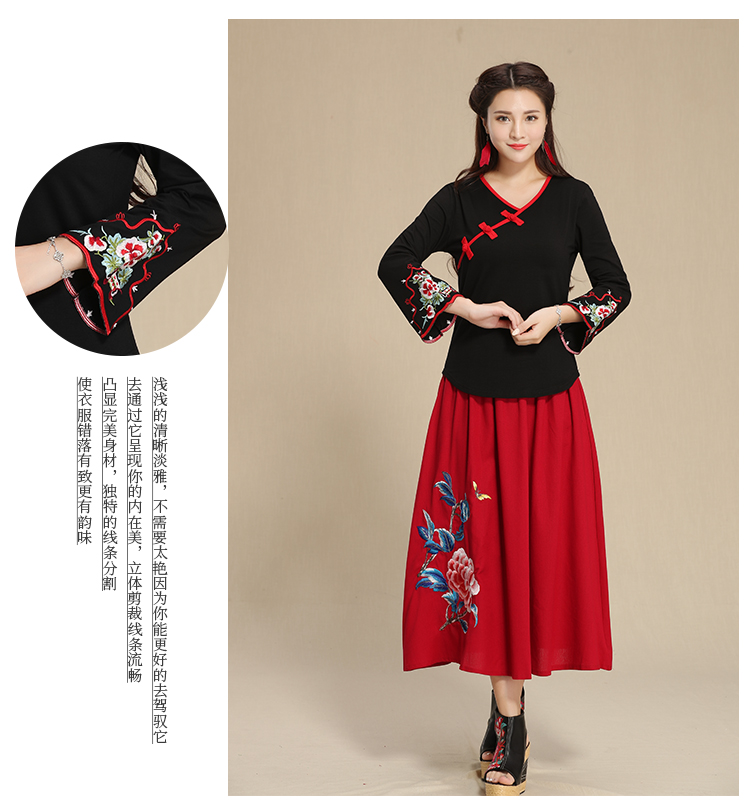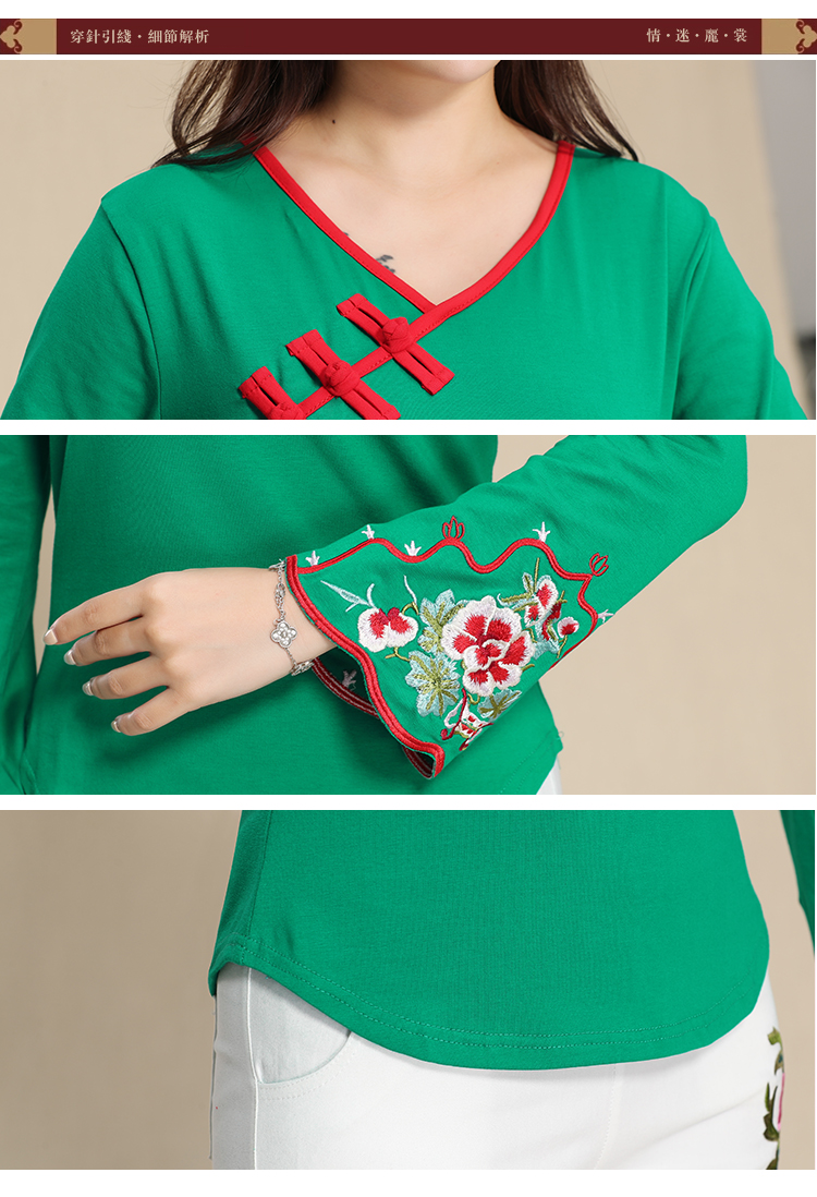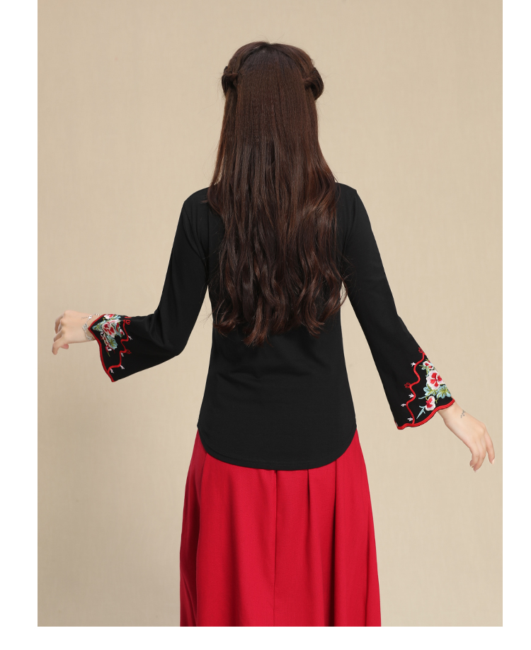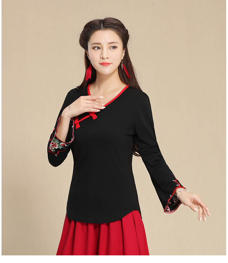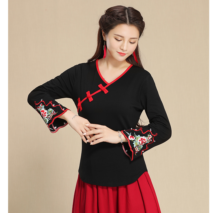 2019秋季新款原創民族風女裝大碼上衣中國風復古盤扣繡花長袖T恤1入