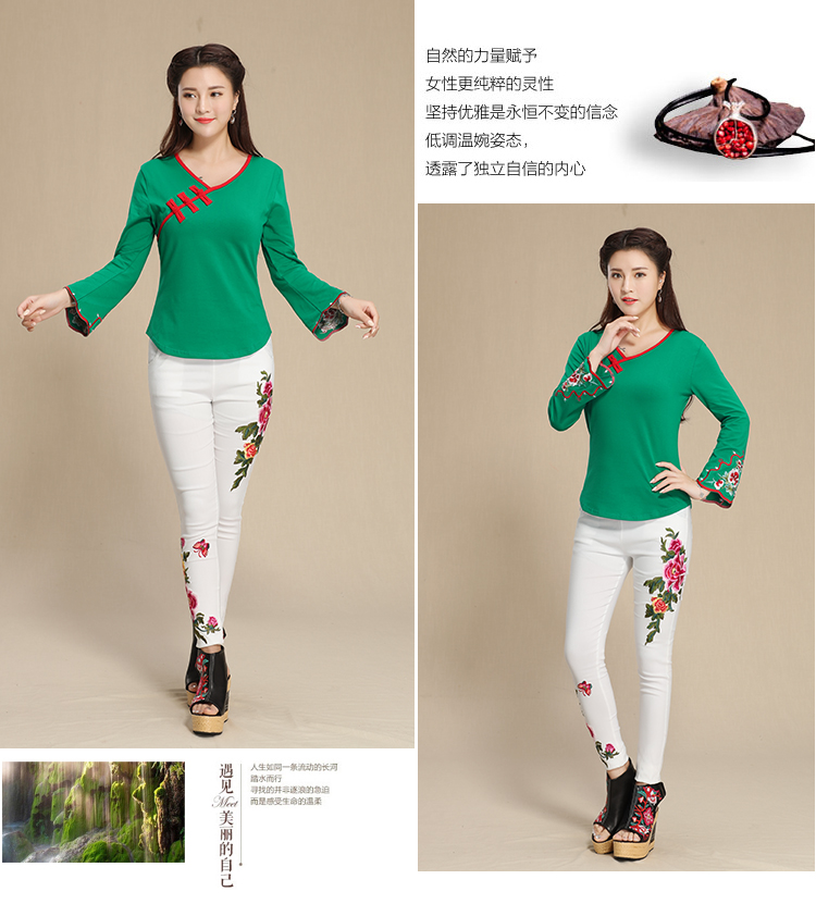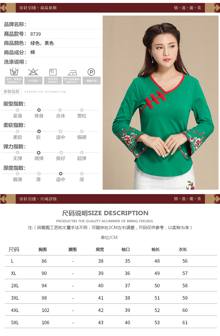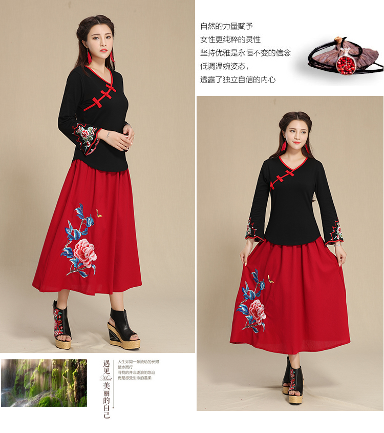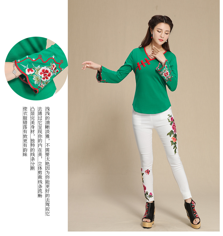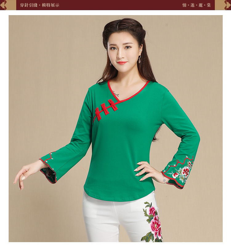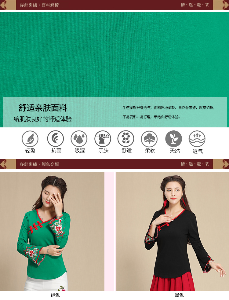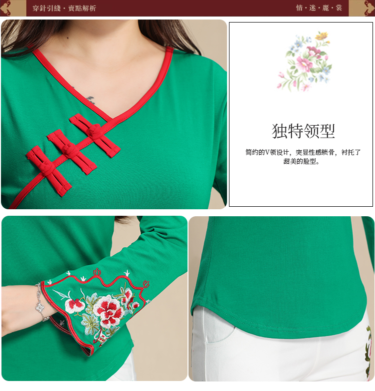 2019秋季新款原創民族風女裝大碼上衣中國風復古盤扣繡花長袖T恤1入