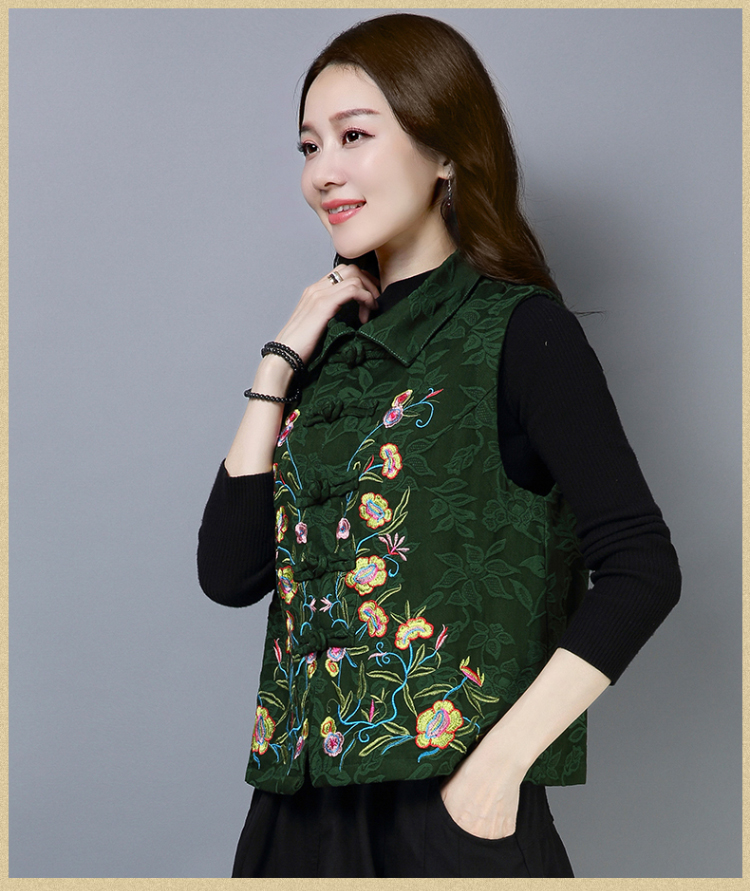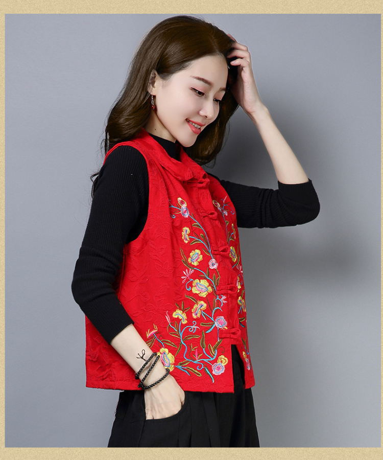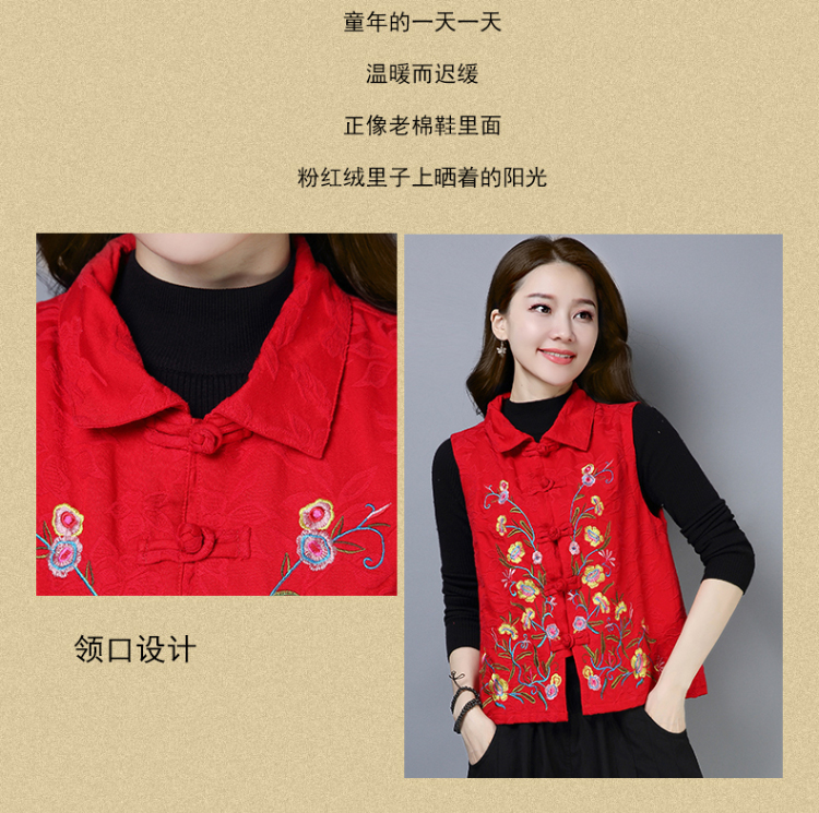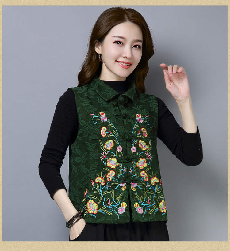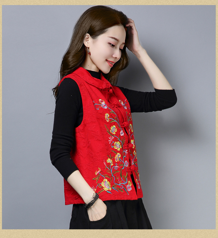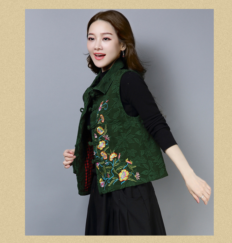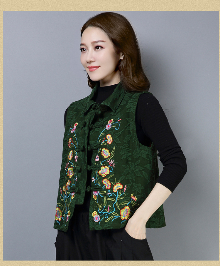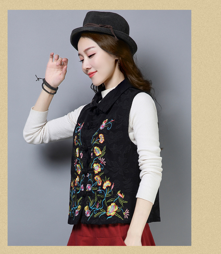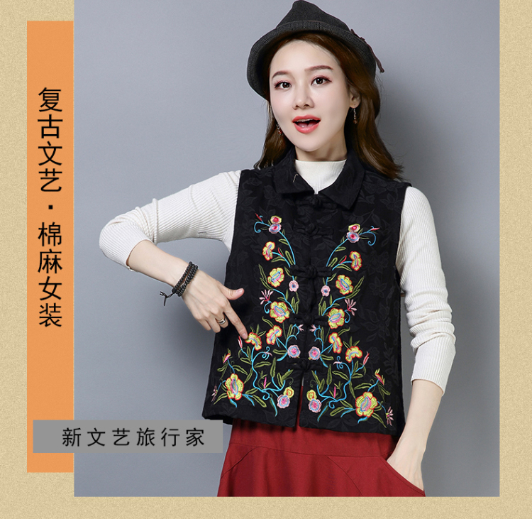 2019秋冬新款民族風女裝提花刺繡立領無袖夾層馬甲中式唐裝短外套1入