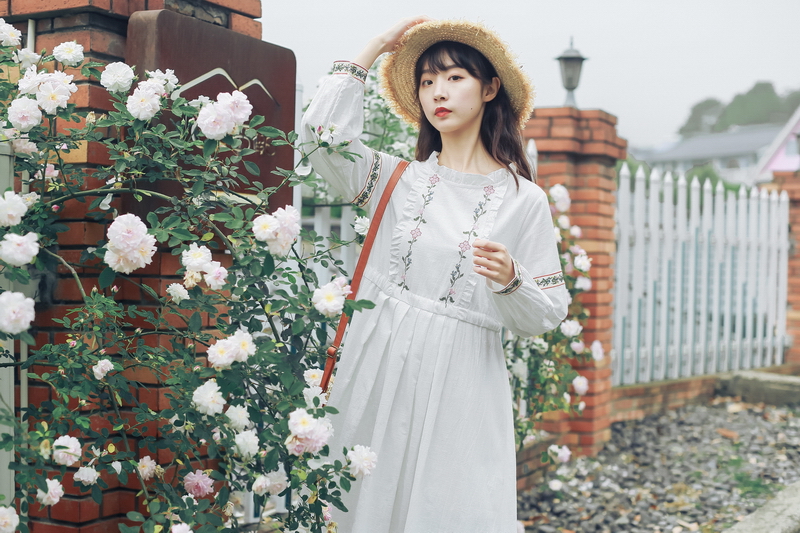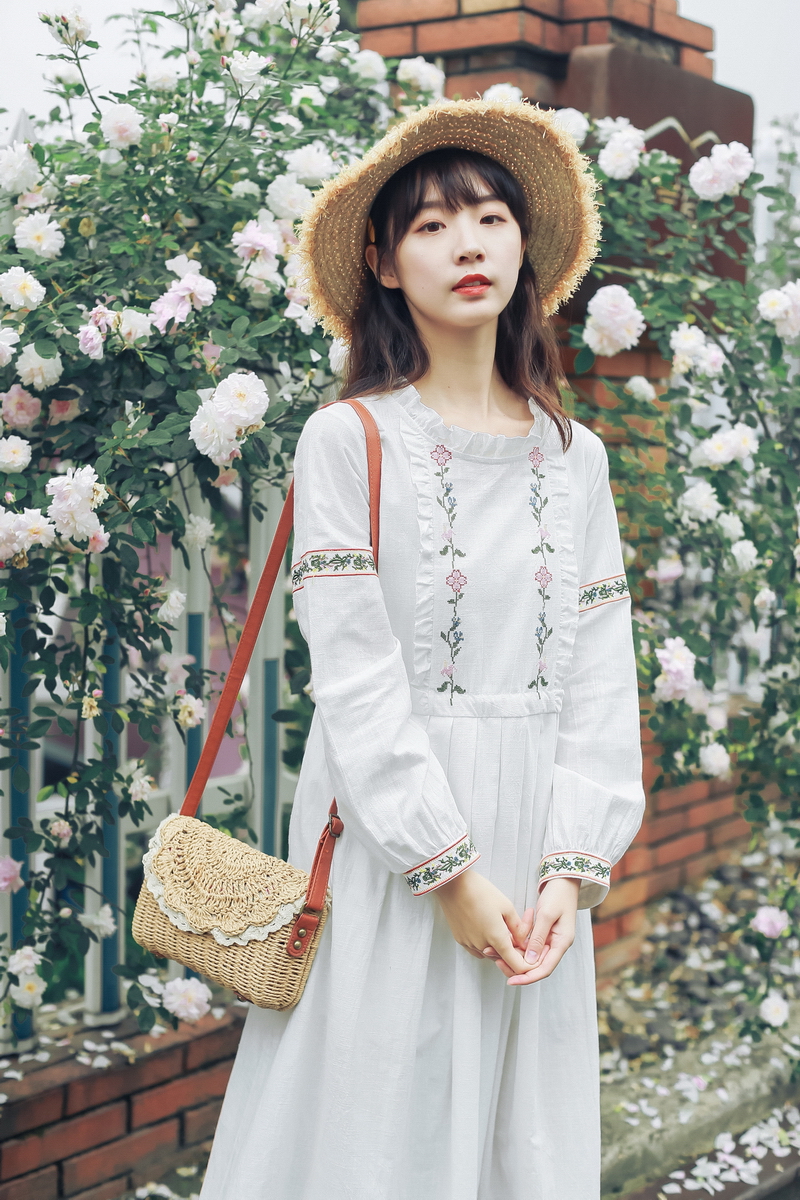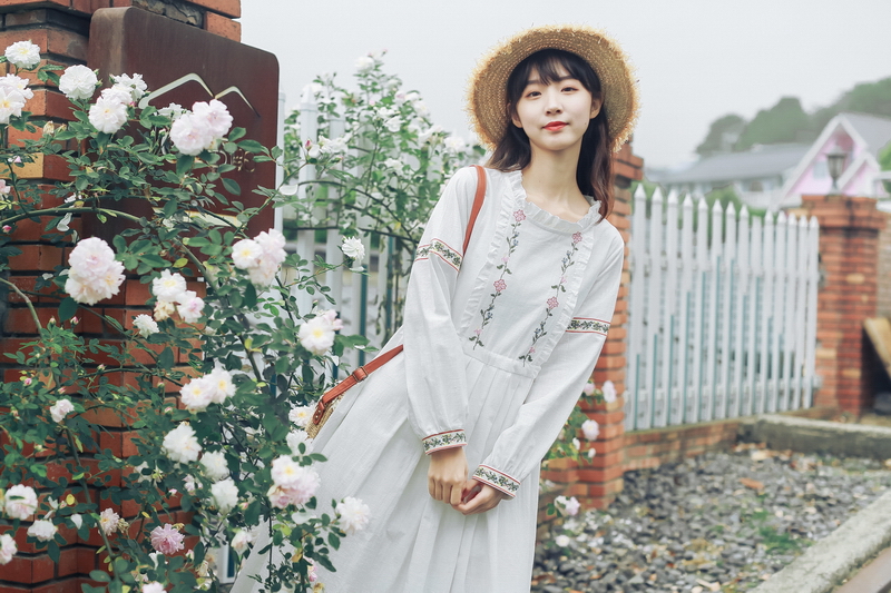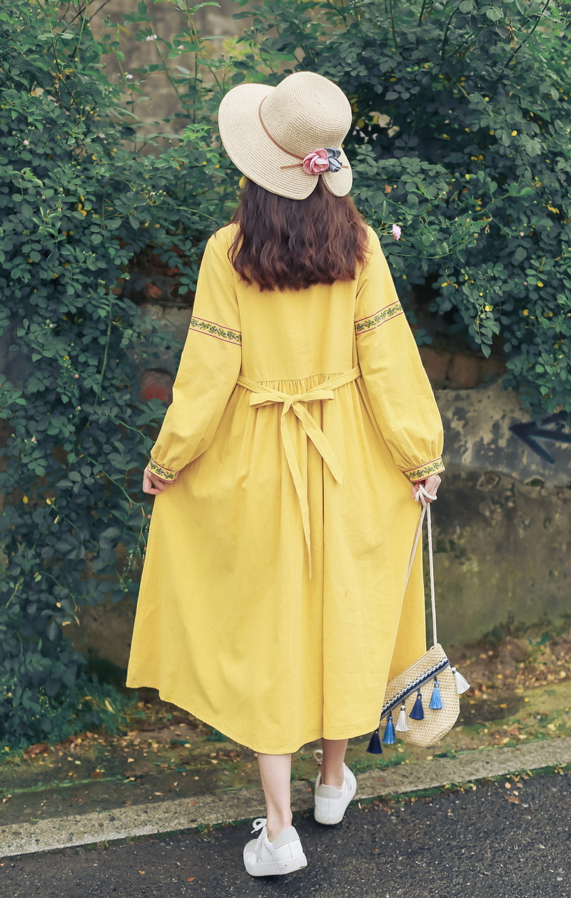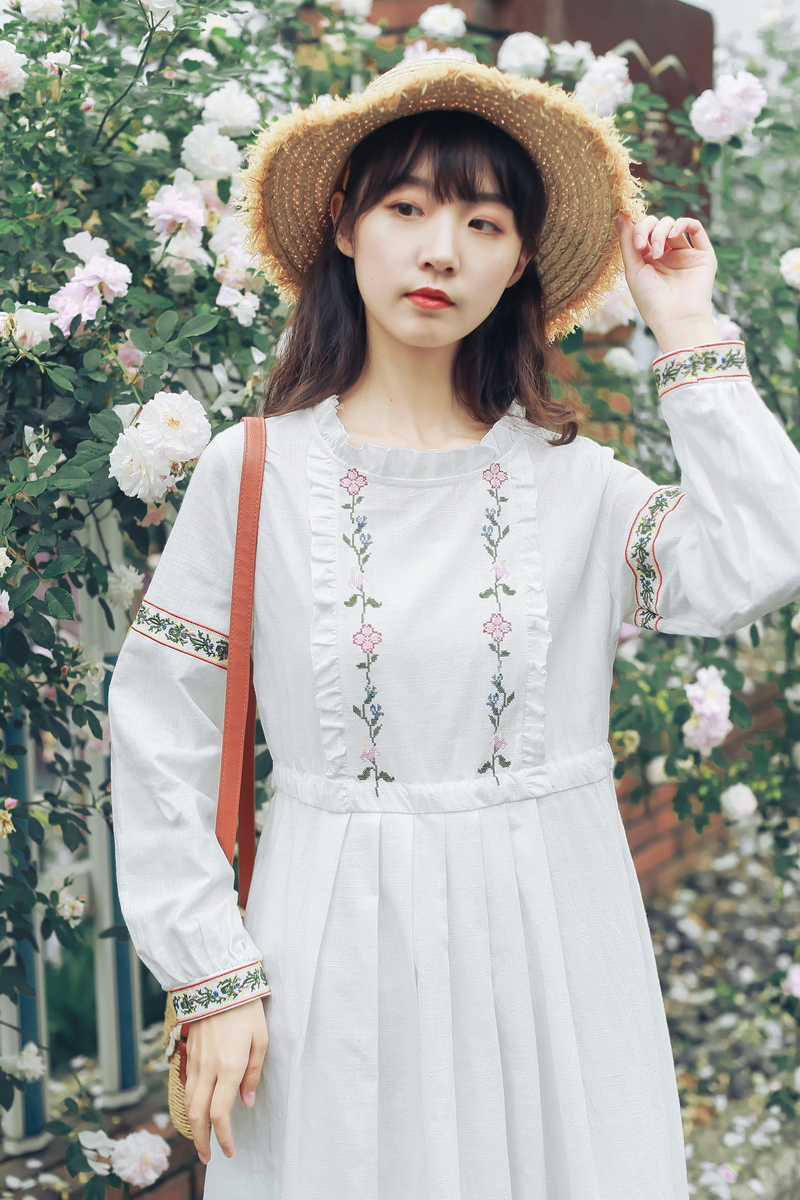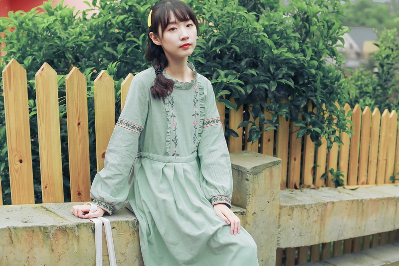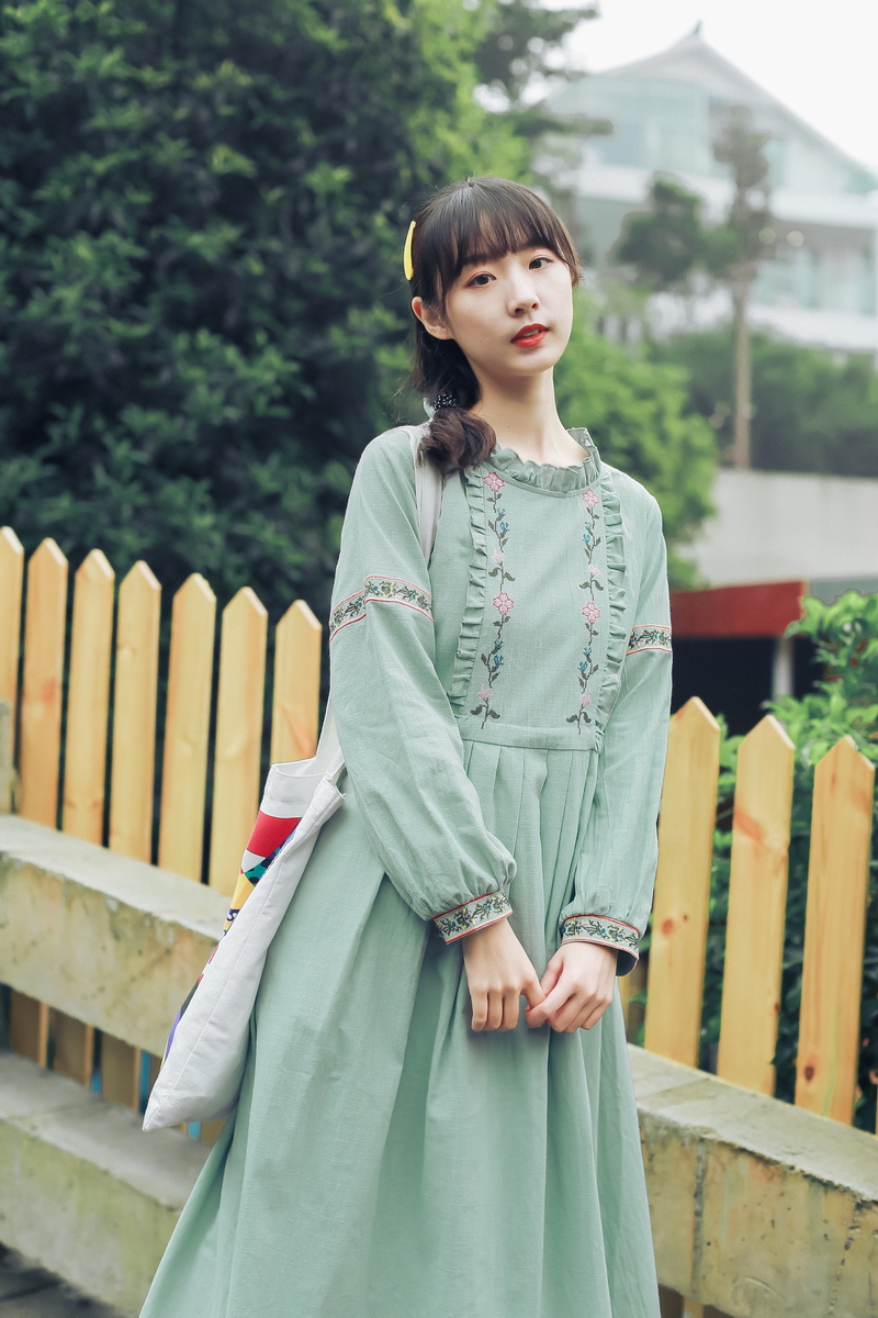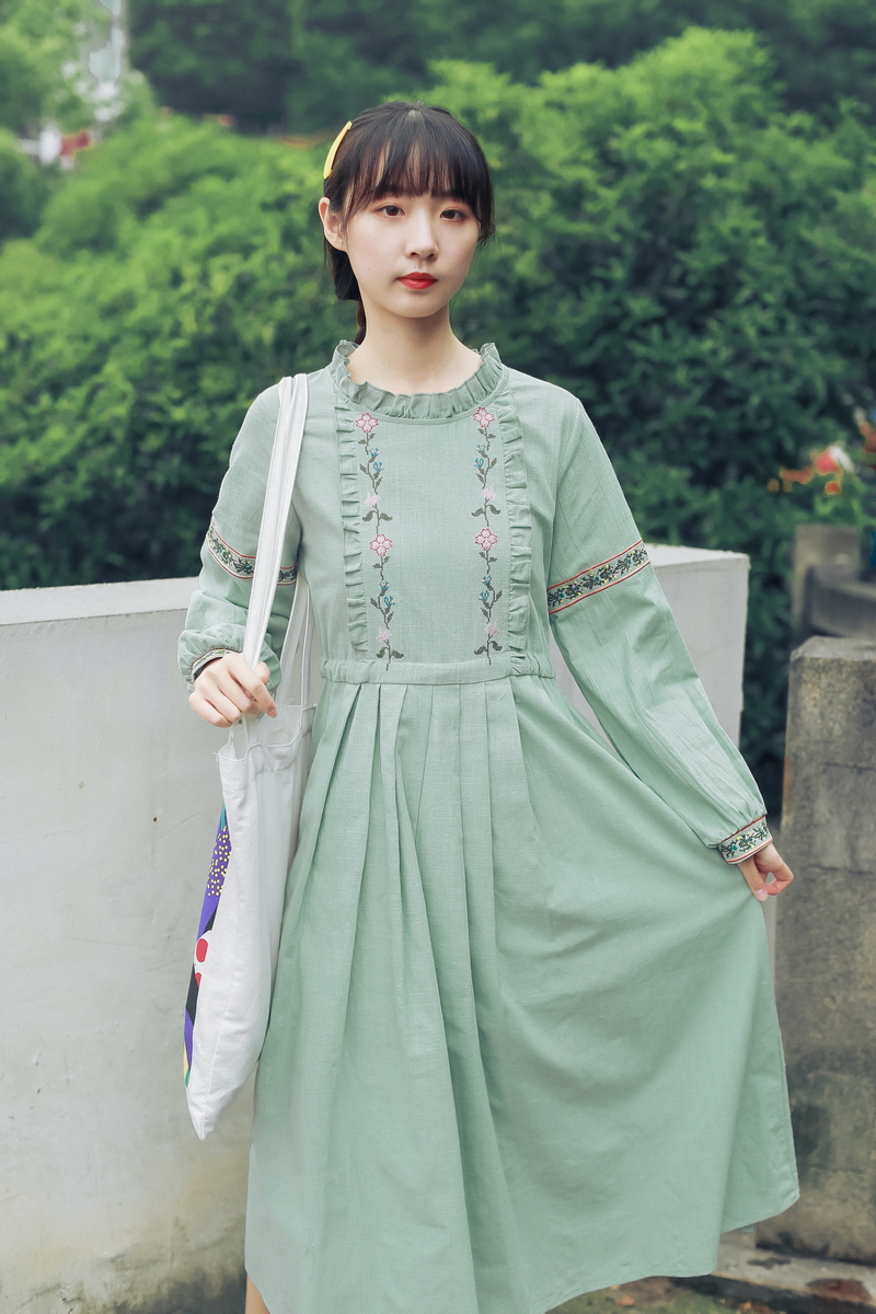 2020春裝新款文藝復古森女系學生大碼棉麻繡花收腰顯瘦大擺連衣裙1入