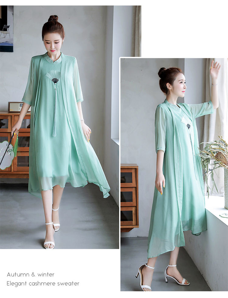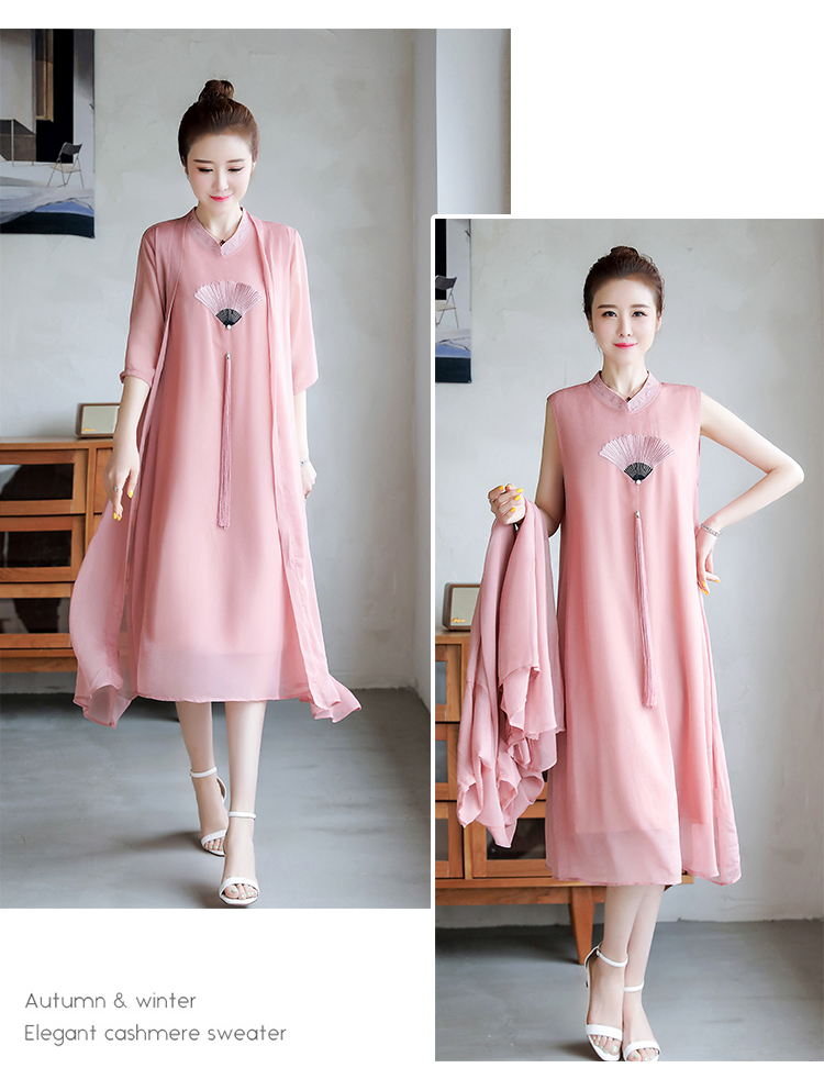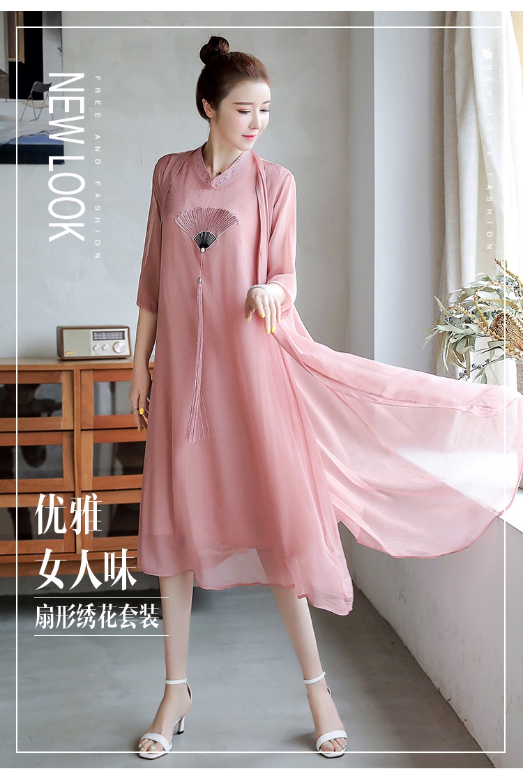 2020夏季原創設計中國風女裝復古刺繡寬松大碼中長款兩件套連衣裙1入